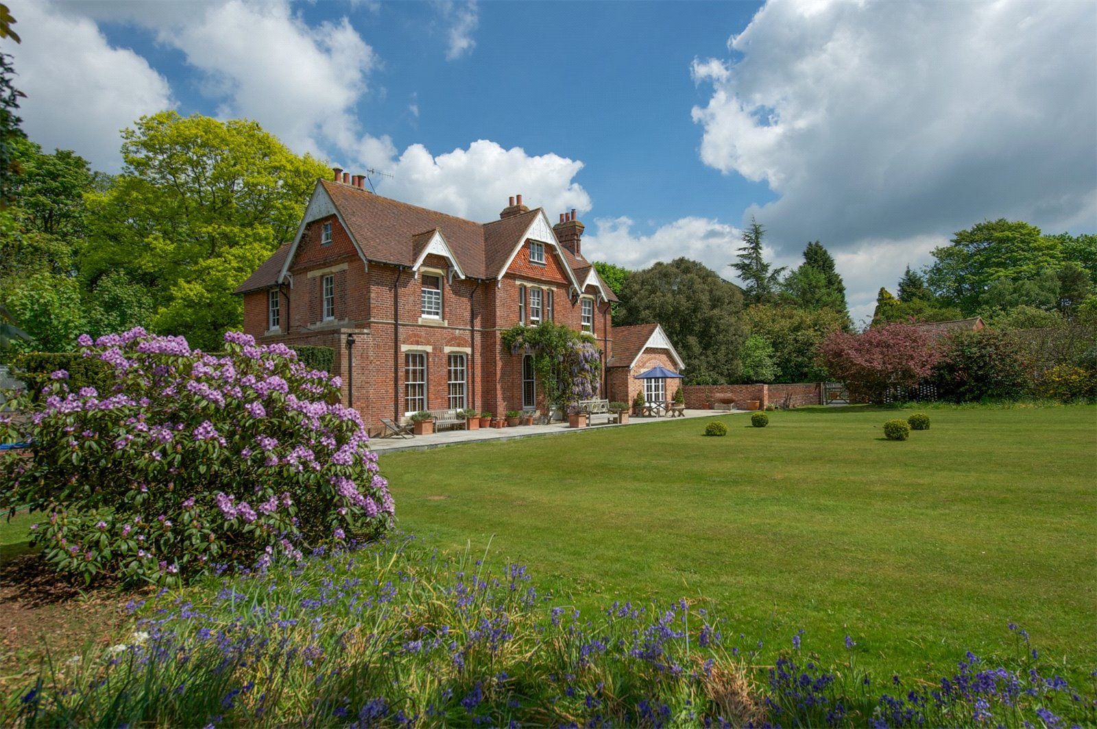 Campfield House is a handsome Victorian country house of mellow brick with sash windows and stone detailing including window sills beneath a tiled roof, with the principal rooms commanding southerly views over the garden and pasture land, situated in the High Weald National Landscape (formerly AONB).