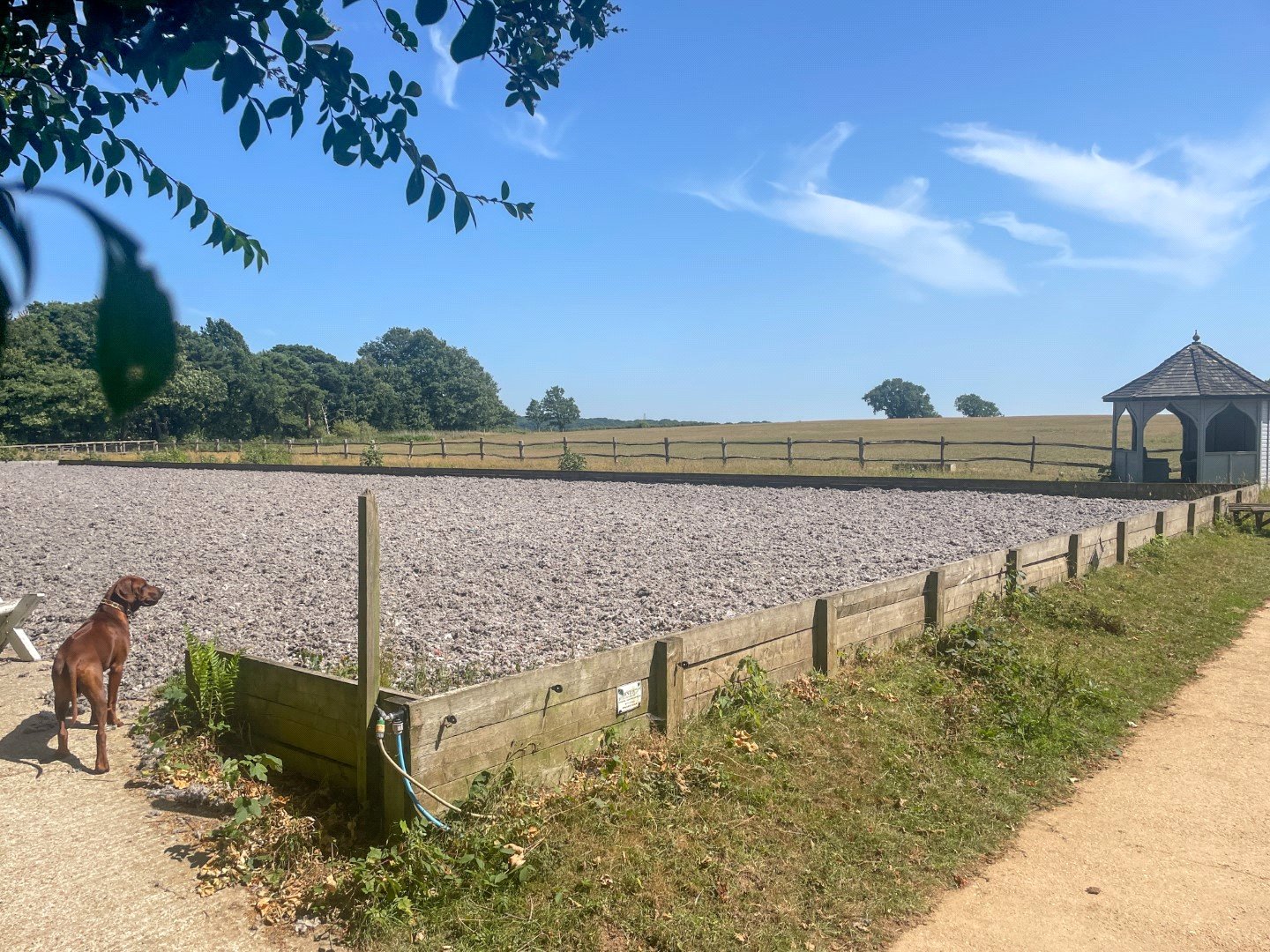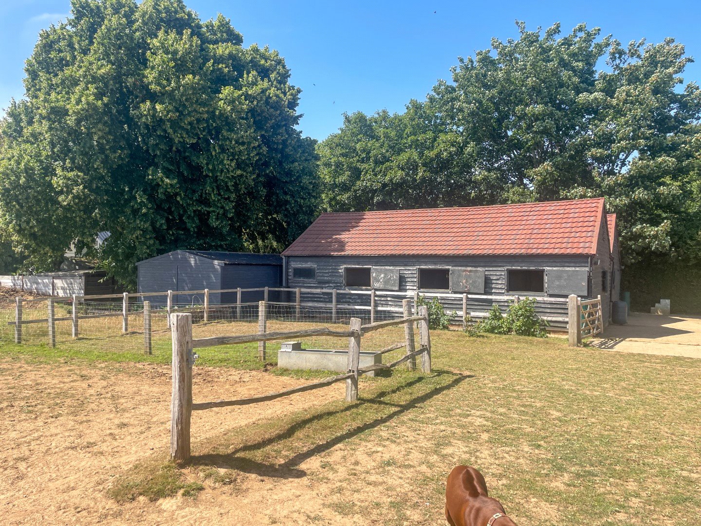 Beyond is a large field with two water troughs. The land is free draining, being on sandstone and shale, enabling horses to be grazed and ridden during winter months. To the west is a pretty bluebell and chestnut copse.