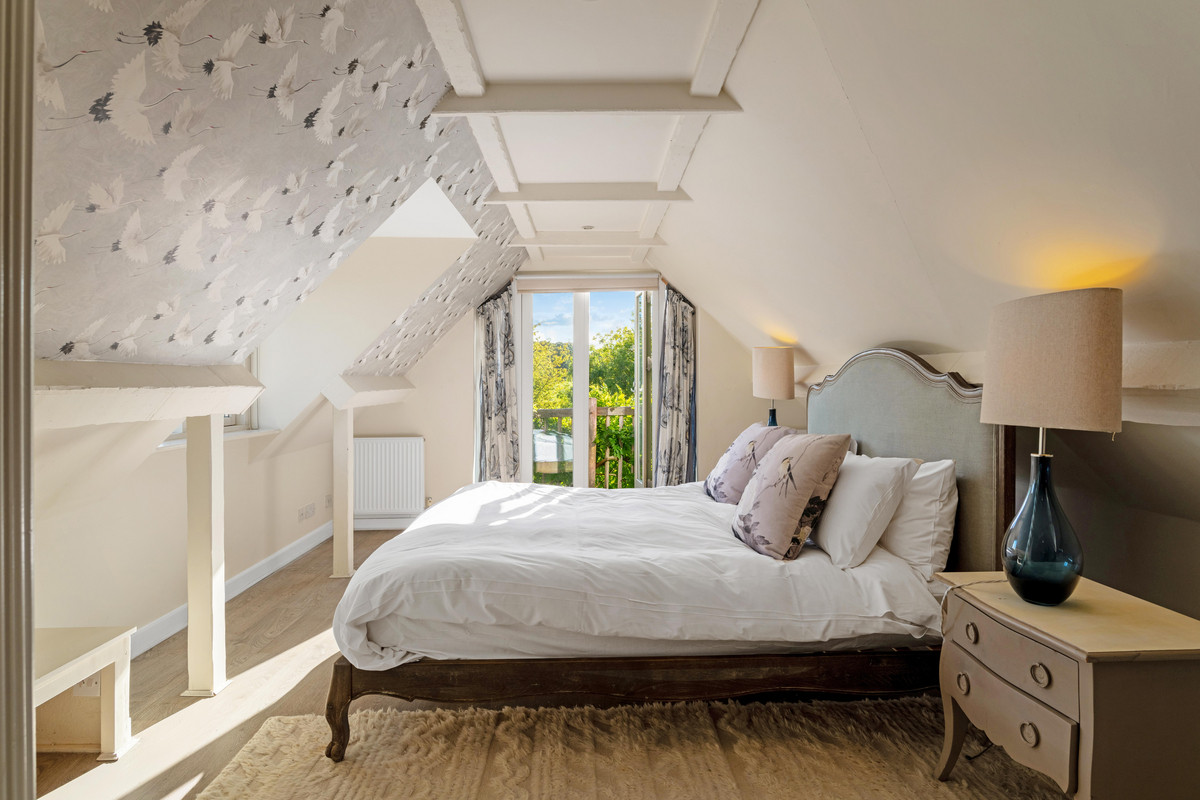 The open-plan kitchen and dining room is designed for both family living and entertaining, with space to seat ten guests, a relaxed seating area, and an office corner overlooking the fields. Upstairs, three vaulted ceiling double bedrooms enjoy garden views, the principal suite with views across the valley and a private en-suite shower room