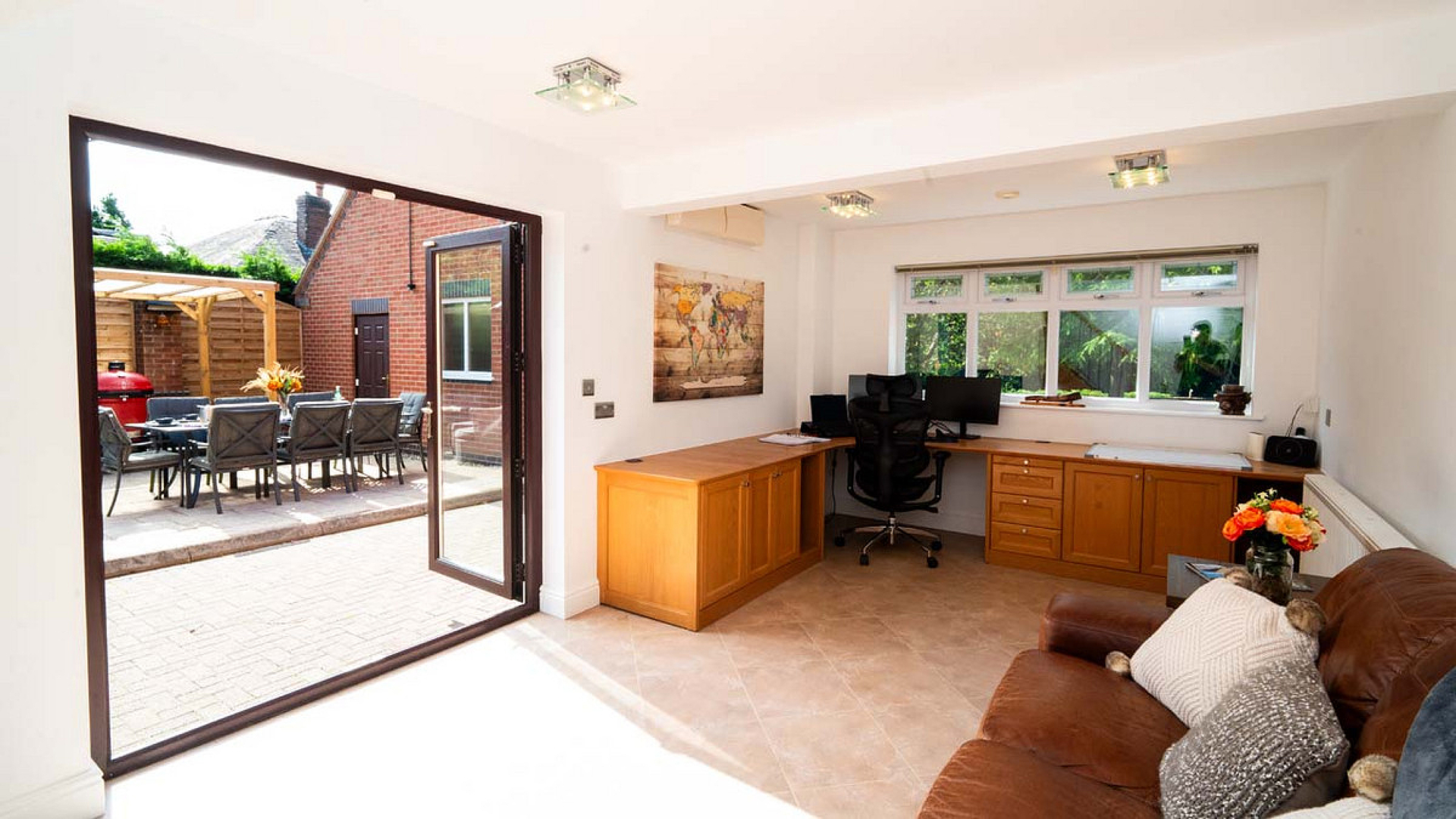 The fourth bedroom is currently arranged as a home office and opens directly to the patio through glazed doors, creating a seamless transition to the outdoors. On warm days with the doors open, it becomes a beautiful place to work or unwind.