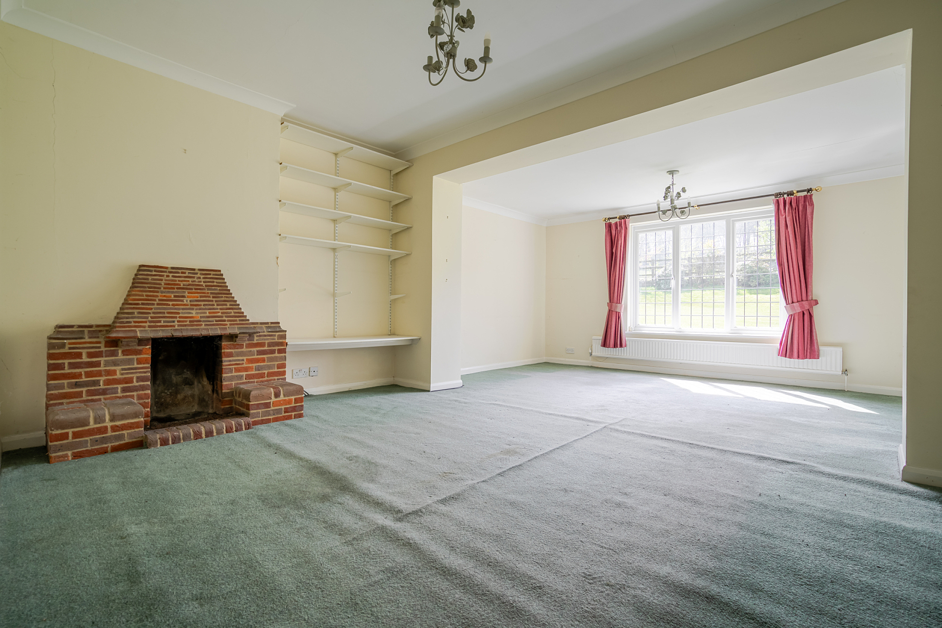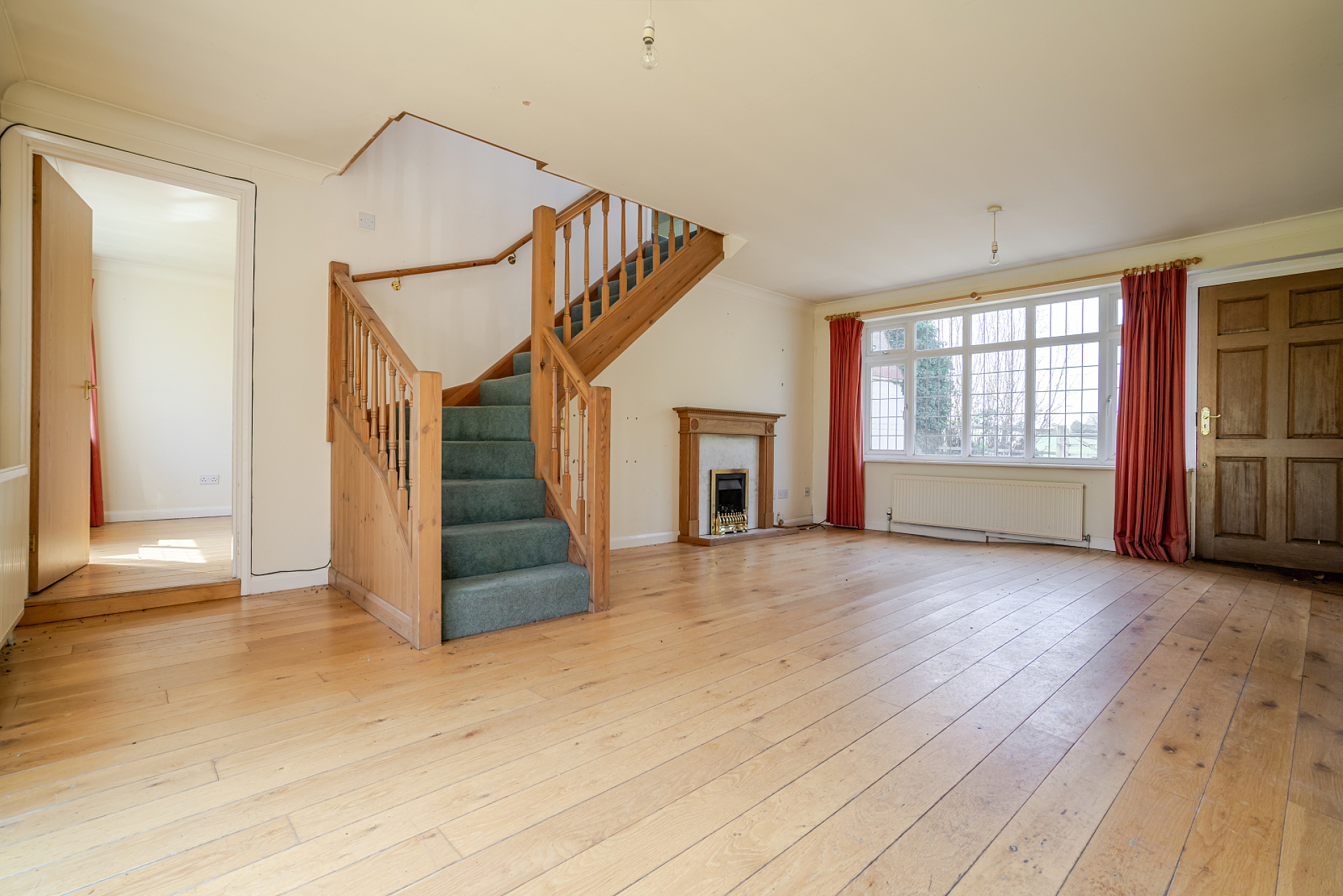 Accessed via a gated entrance off Rignall Road, the house is set well back from the road and surrounded by mature gardens. The ground floor is arranged around a central hallway and includes three separate reception rooms—each with character features such as original brick fireplaces and leaded windows. The L-shaped sitting room is light-filled and dual aspect, with French doors opening onto the rear garden.