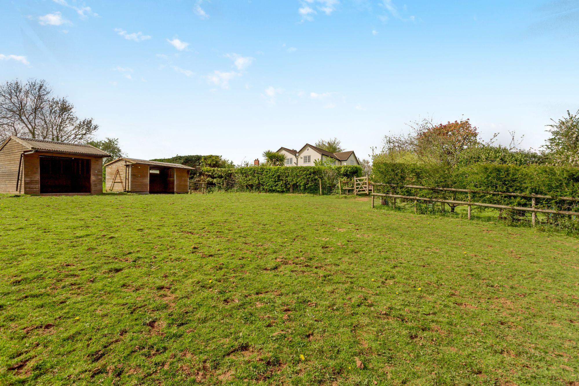 The gardens to the side and rear of the property are mainly laid to lawn, with flower borders and established shrubs. Nearest the house there are two terraces, from which to enjoy the lovely surroundings. For grow-your-own enthusiasts, there is a small fenced orchard with apple, cherry and plum trees, a vegetable plot with raised beds and, alongside the stables, a fruit garden with an assortment of fruit bushes and further raised growing beds. The garden also contains a greenhouse and a garden shed. Beyond the gardens is a large paddock with two field shelters.