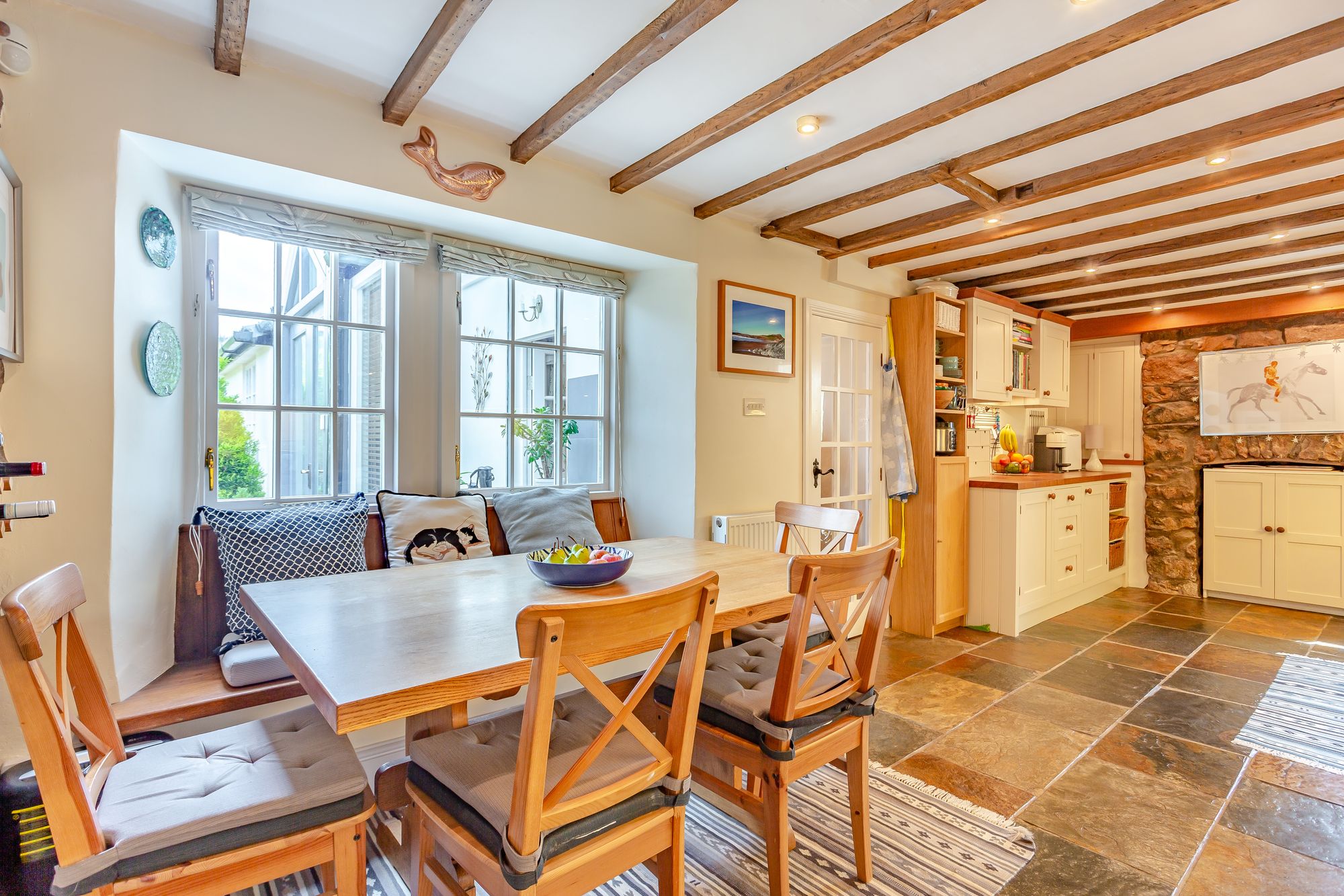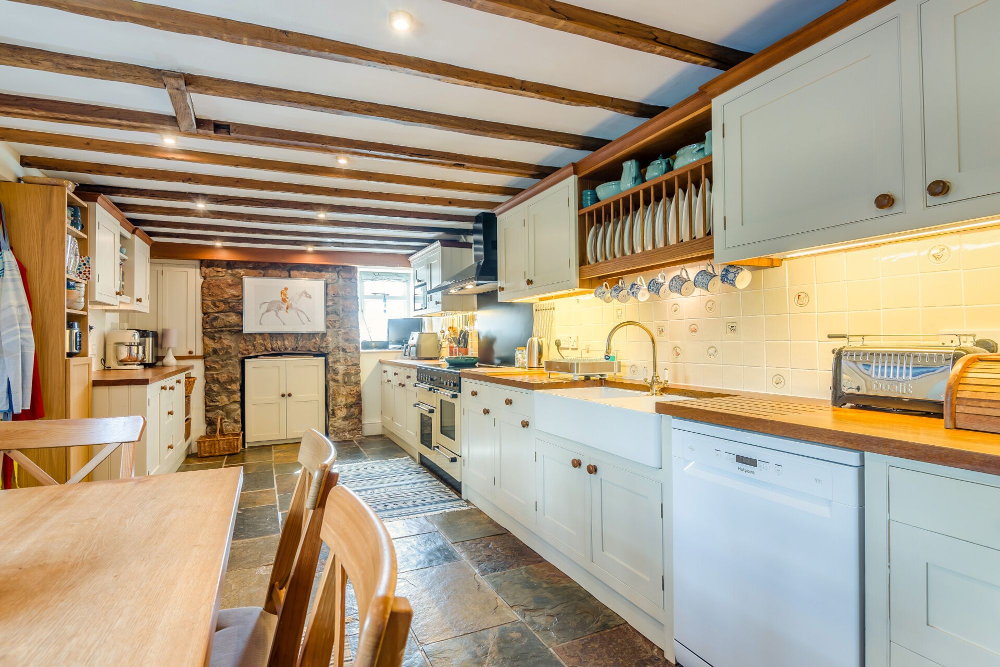 To one side of this hallway is the oldest part of the house, the original stone cottage which is believed to be in excess of two hundred years old. Here is the spacious kitchen, a room with characterful ceiling beams, an exposed stone wall, an open stone fireplace (now housing a kitchen cupboard) and an abundance of charm. The Shaker-style kitchen units have oak work surfaces and the floor is tiled with Mandarin Stone multi-coloured slate. There is a double Butler sink with a plate rack over, a Rangemaster cooker, a built-in fridge and space for a dishwasher. Next to the main window there is a deep window seat with plenty of space for a breakfast table.
