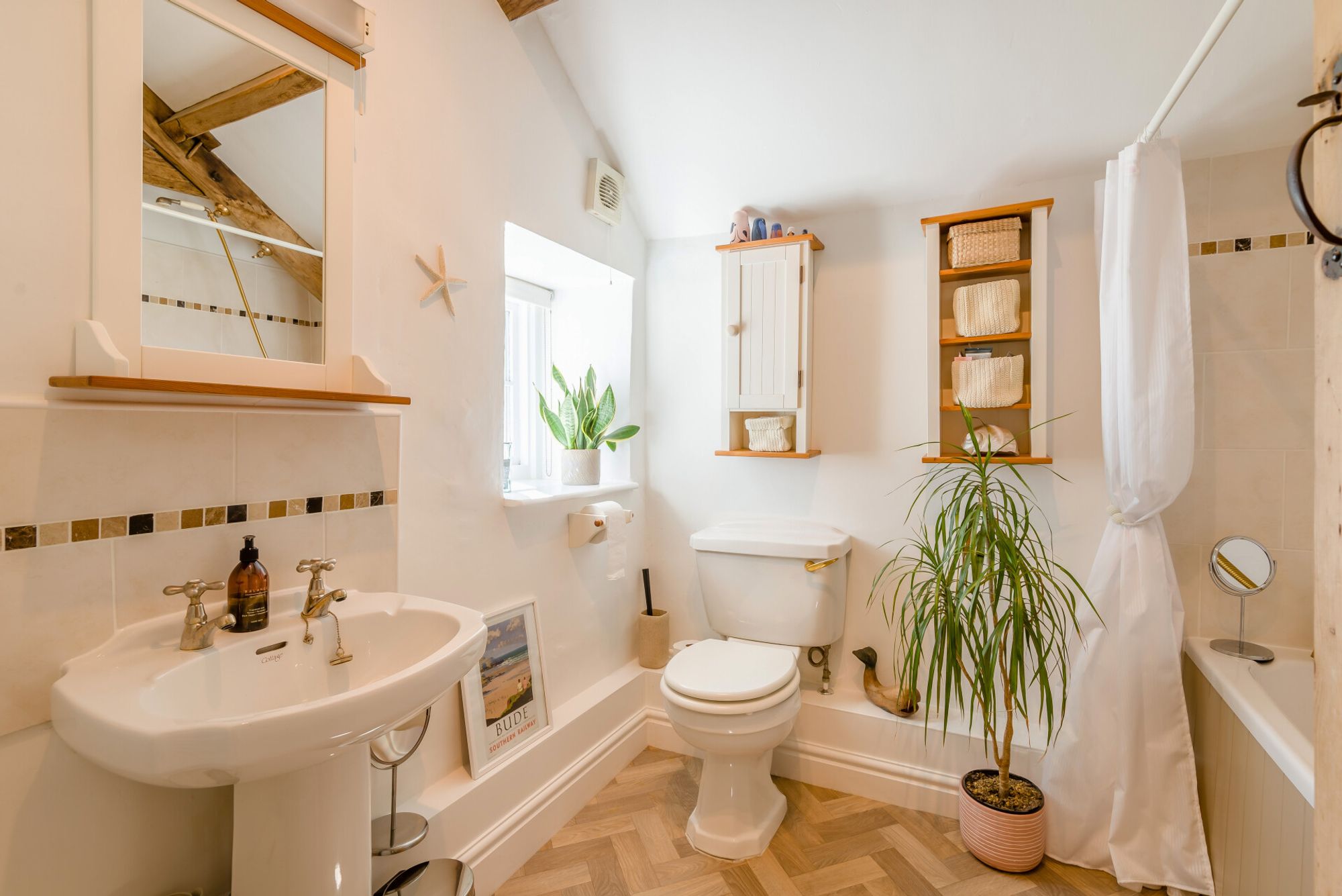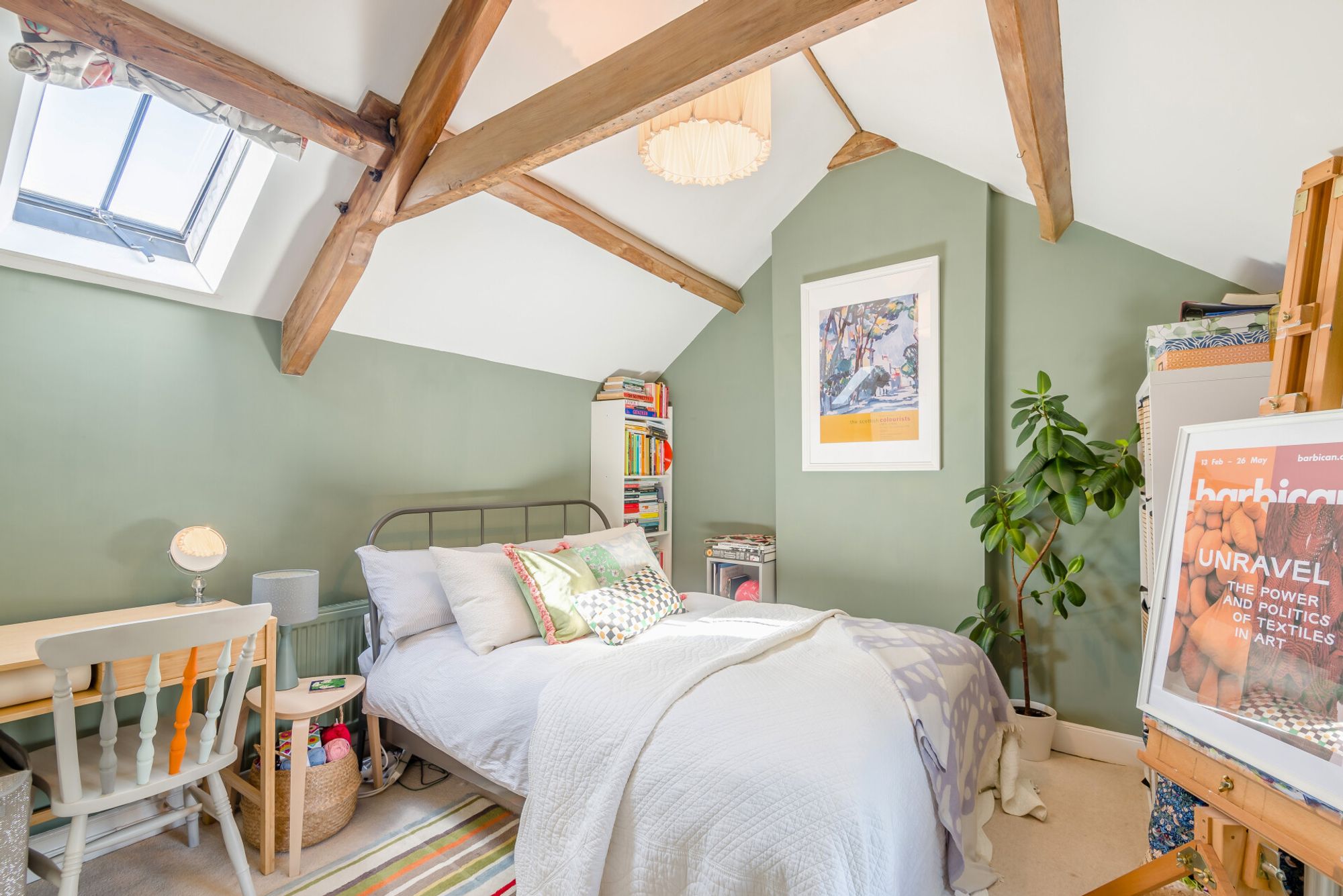 The two further bedrooms share the use of a charming family bathroom. The bathroom, like the pretty bedroom next door, is located in the older part of the house. Both feature the exposed A-frame and both still have old ledge and brace doors with original ironwork. Elsewhere in the property, modern ledge and brace doors have been matched up.