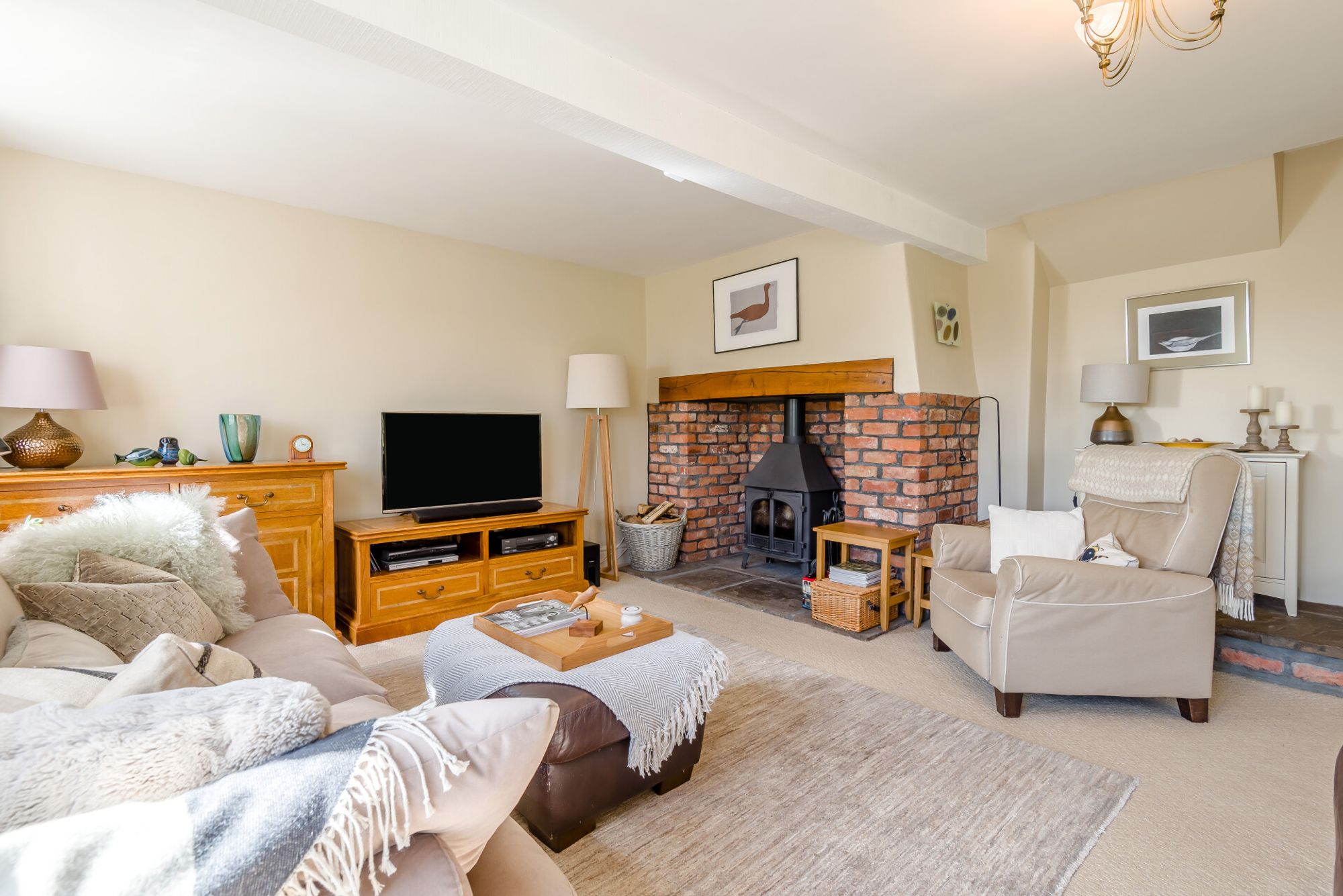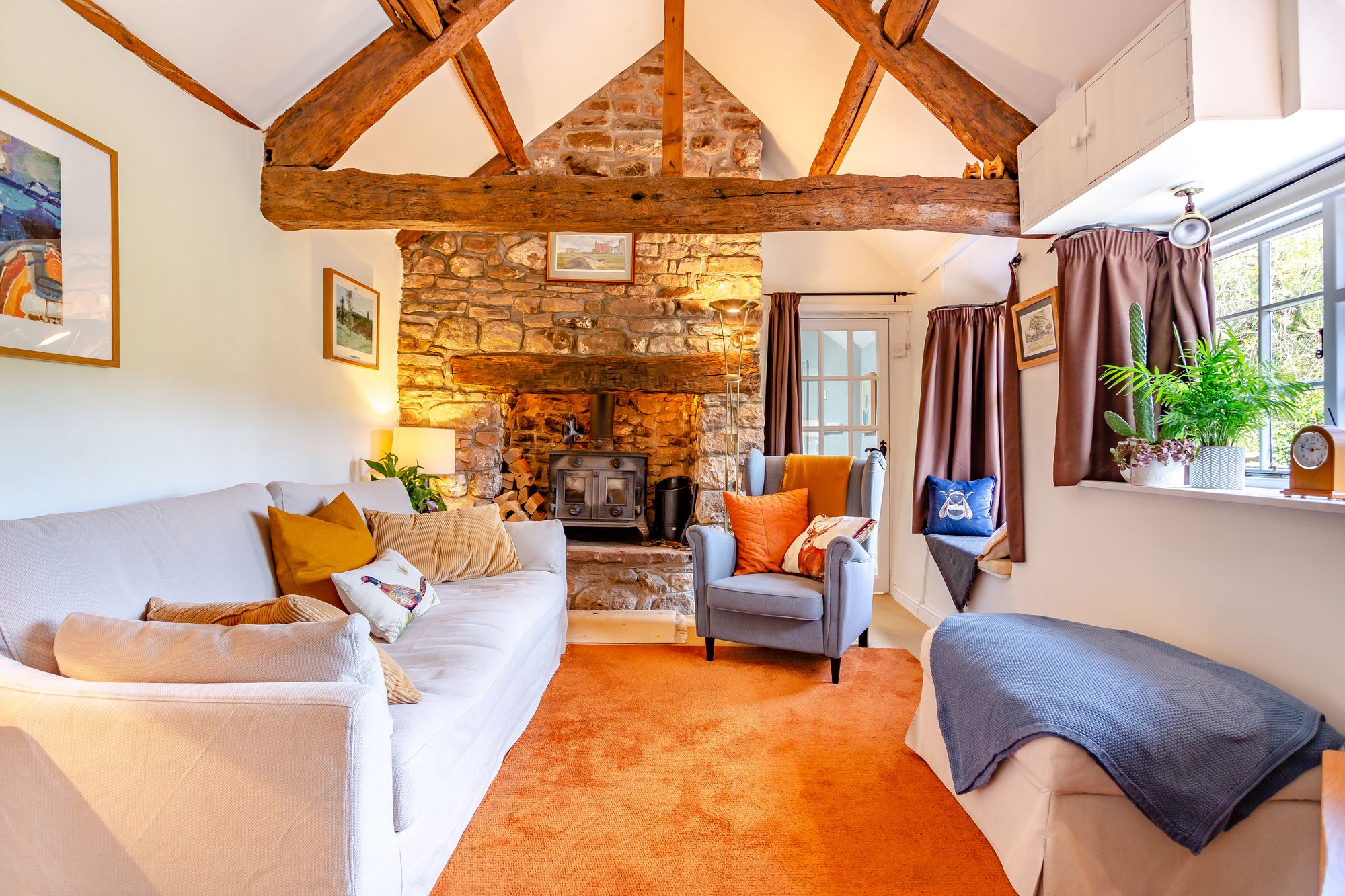 The kitchen opens to a cosy snug, which has an exposed A-frame, a feature stone wall and a wood burning stove set on a stone hearth within an oak beamed fireplace. At the back of this room, a glazed door leads to the study, a pleasant and private place to work from home, with an apex ceiling and two windows, one overlooking the pretty front courtyard.