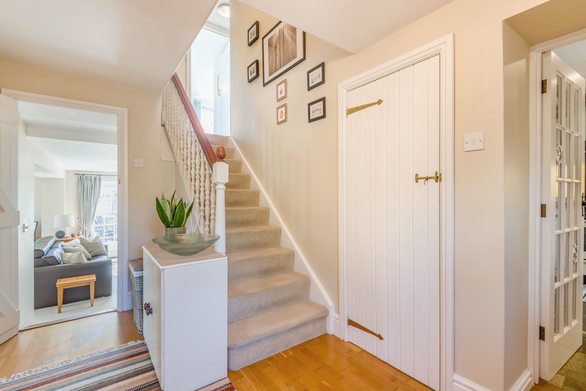 Wooden pedestrian gates set in a lovely old stone wall open from the little-used country lane into a pretty gravelled courtyard. The property is entered though a glazed wooden porch with Mandarin Stone slate floor tiles. An inner door opens to a reception hallway, an attractive room with engineered oak flooring. It is double height in part, with a small gallery landing above.