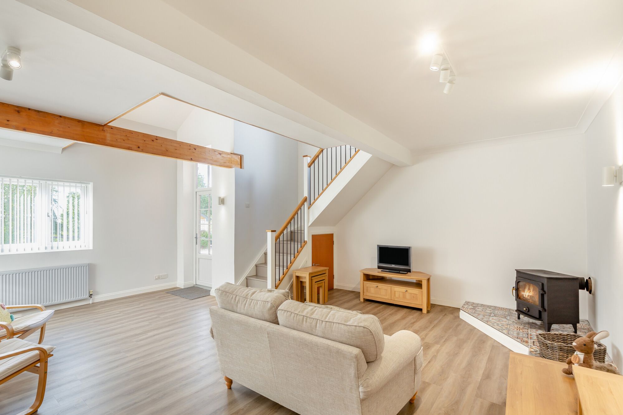 You will find the sitting room of the potential annexe next to the living room accessed via the main house. This impressive reception room is a bright and welcoming space, enhanced by its double-height ceiling, exposed beam, and full-height windows. A feature wood-burning stove creates a cosy focal point, with a door providing direct access to the garden, making it an ideal room for both entertaining and everyday family living.
