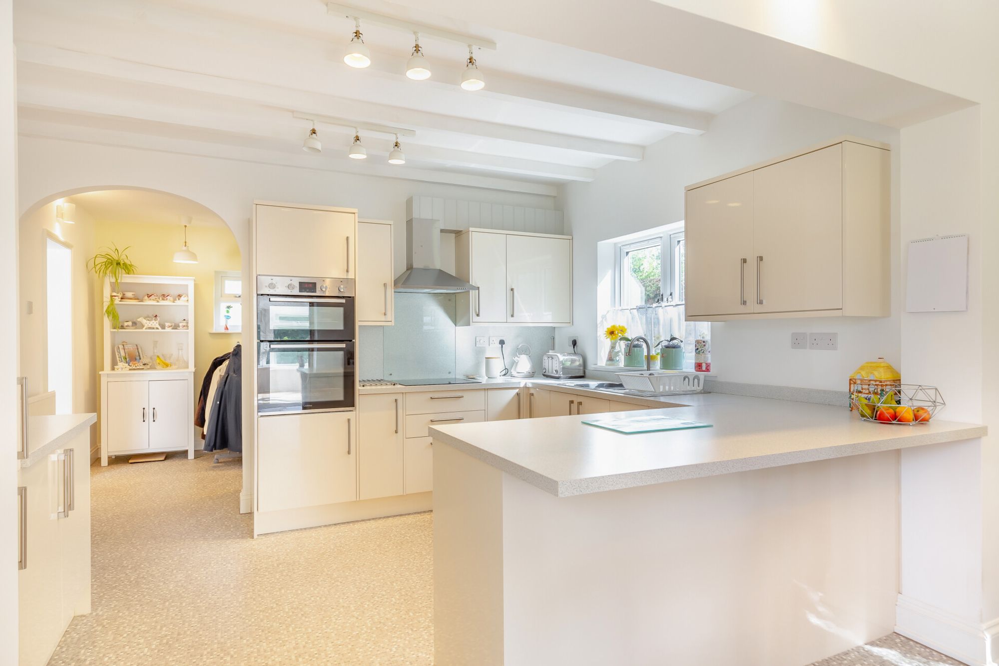 The bright and contemporary kitchen is the heart of this home, finished with sleek cream cabinetry, integrated appliances and ample storage throughout. A central peninsula provides both extra workspace and a breakfast bar, making it perfect for everyday living. Large windows bring in natural light, giving the kitchen a fresh, airy feel.