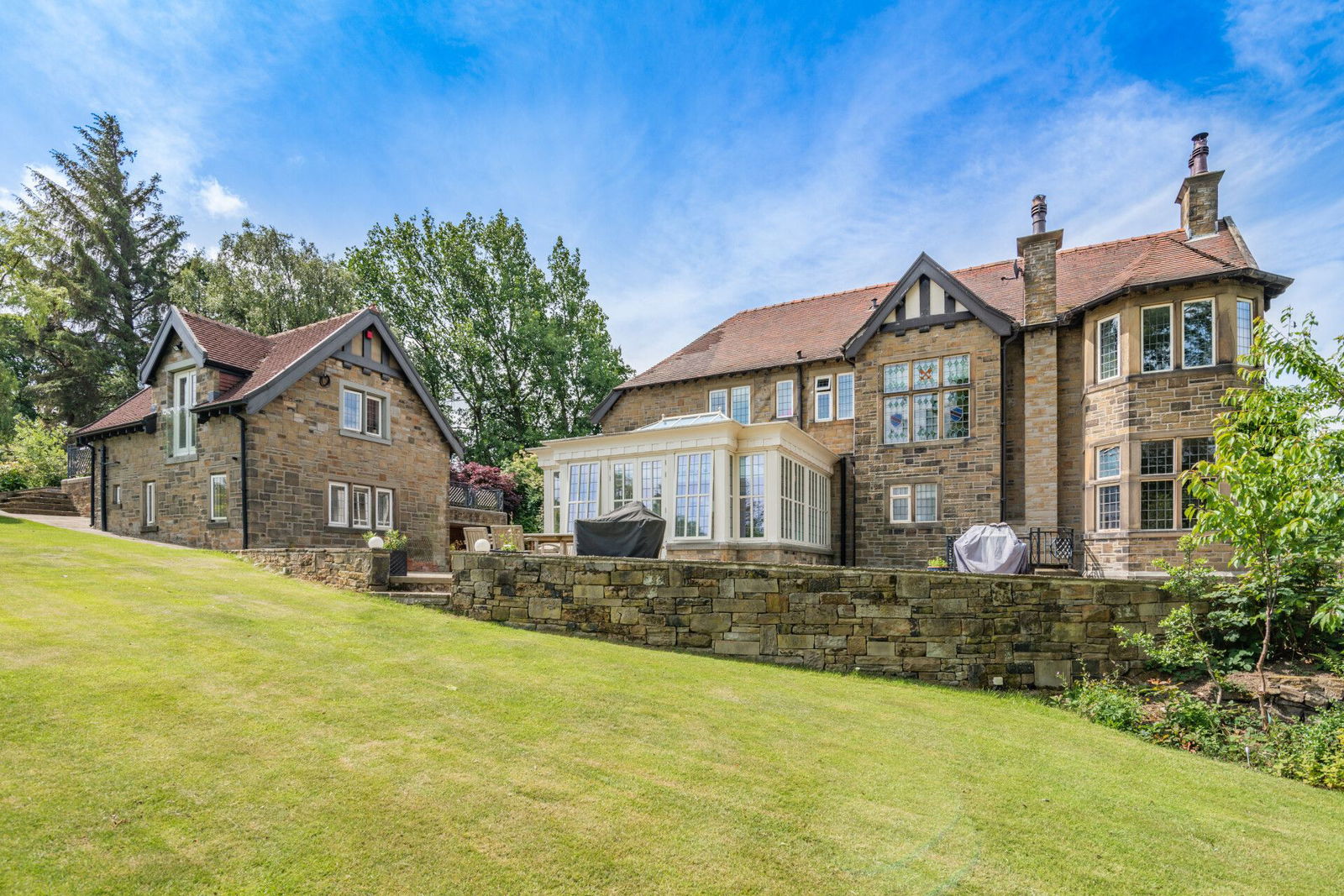 One Acre is named as it sits central to professionally landscaped gardens extending to approximately one acre; electronic wrought iron gates, set to feature stone pillars open to a driveway that extends along a stunning 100 metre tree lined approach offering a glimpse of surrounding countryside before arriving at the house where extensive parking is provided to both the front and rear elevations. The gardens have been professionally landscaped and are privately enclosed within established herbaceous borders and evergreen foliage. To the front, a lower level lawn continues to the side aspect and the generous garden terrace adjoining the orangery. To the rear of the property, beyond a summerhouse with power and mains water, are further lawned garden areas, once again with established borders raised beds and greenhouse in the 'kitchen garden', expansive lawned areas prefect for family recreational activities and outdoors entertaining. Above the garage is an exceptional stone flagged party terrace with adjoining artificial lawned garden positioned directly in front of the first floor accommodation to the Coach House. The grazing land is gently sloped to assist drainage and has separate gated vehicular entrance from both the garden and from the road with a stable block with three stables and a tack room which has both mains water and power. Â Â