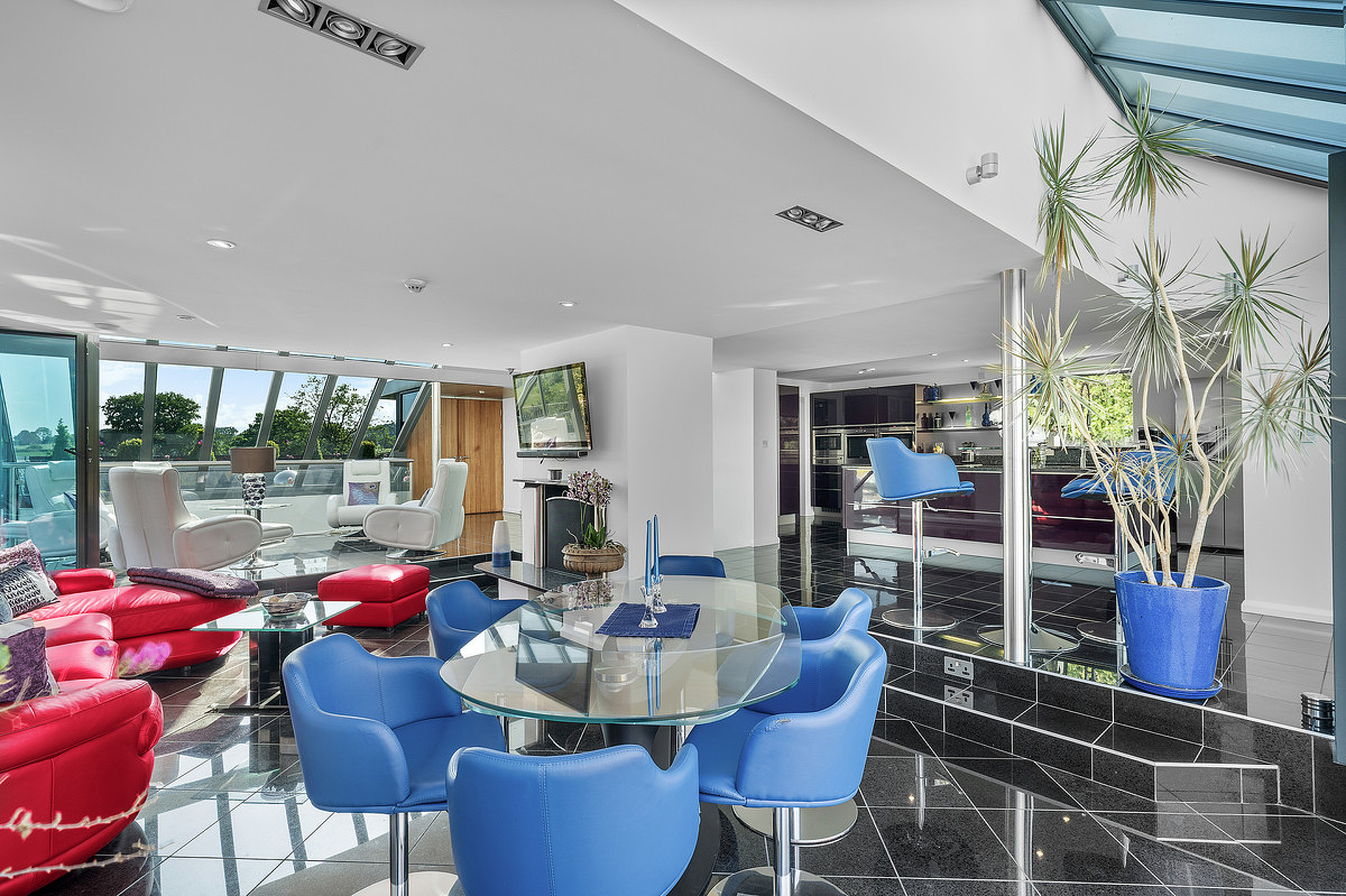This expansive multi-use space is fully tiled in elegant grey porcelain herringbone, crowned by the glass atrium above which bathes the entire area in natural light. Fullheight six-panel glazed doors open directly onto the lower patio, creating a seamless indoor-outdoor connection. Integrated task uplighting and downlights enhance the ambience.