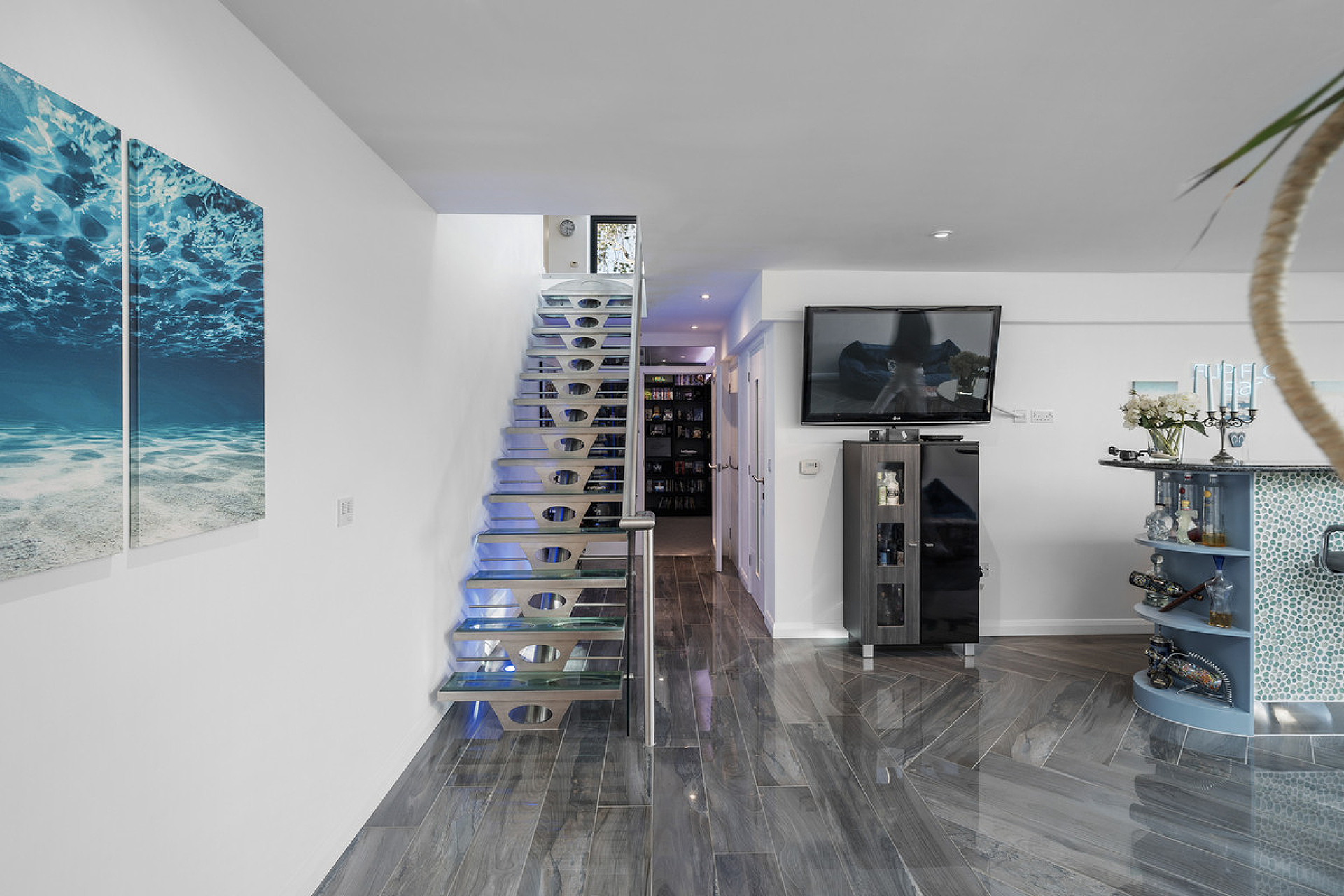 A sculptural glass and stainless steel staircase, descending from the kitchen continues the home’s modern architectural statement, blending luxury, light, and leisure.