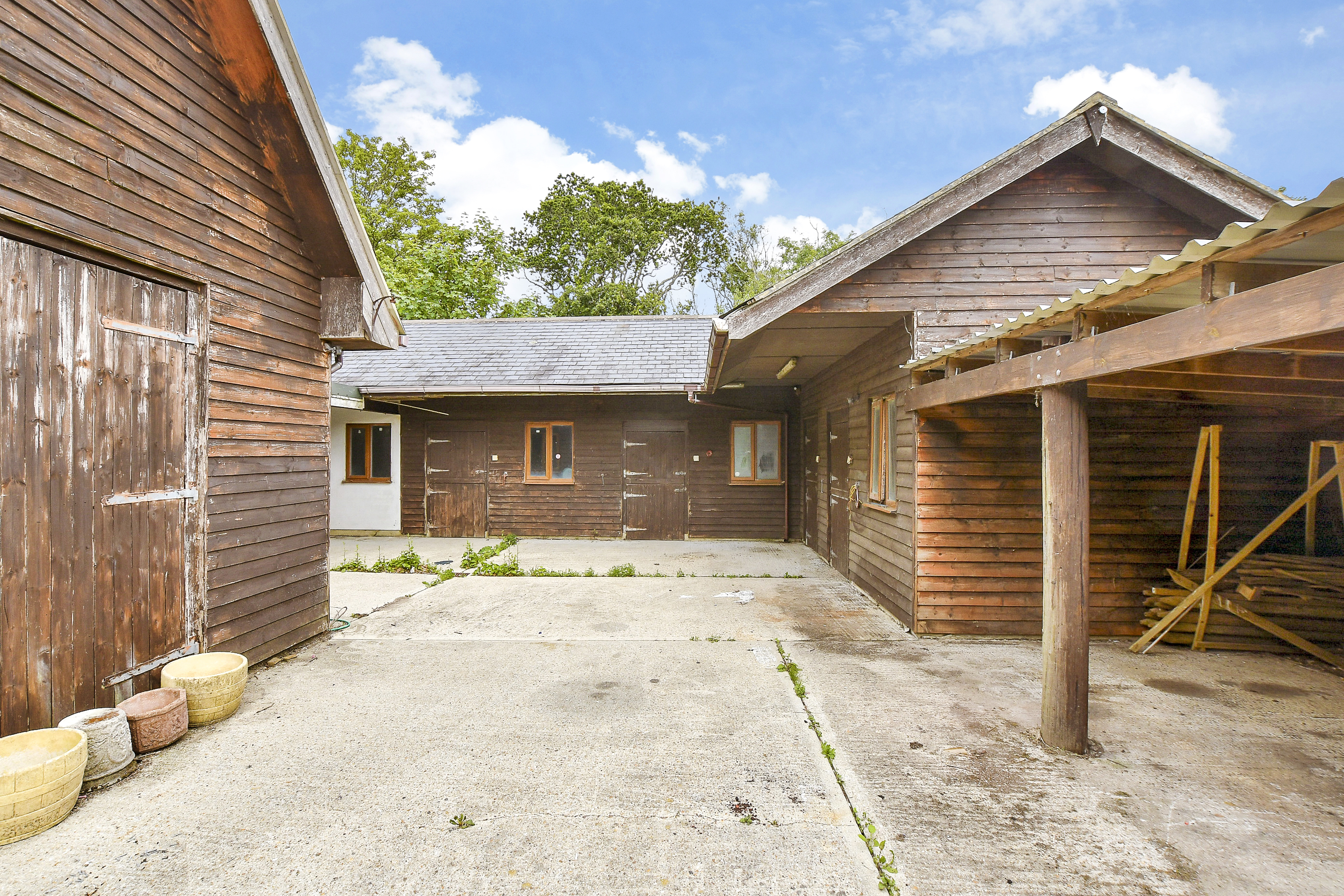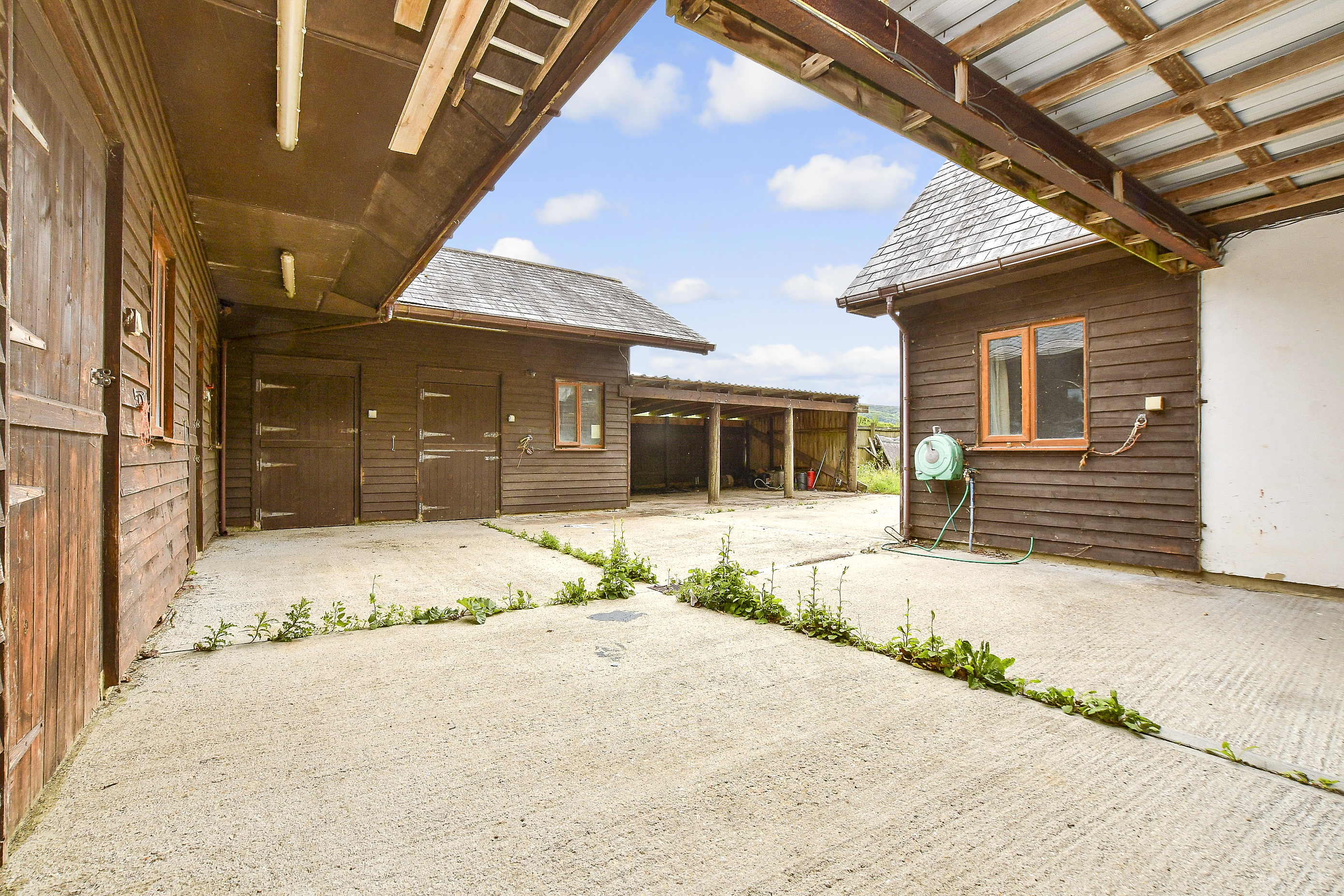 Equestrian enthusiasts will appreciate the extensive facilities, including a modern stable block with four large stalls, a tack room, and a machinery area. A large adjoining barn provides a versatile two-storey outbuilding. Currently arranged as a spacious sitting room and kitchen with wood burner, a ground-floor shower room, and an upstairs open plan room enjoying far-reaching views toward Mottistone Down, this barn offers exciting potential for guest accommodation, a home office, or creative studio (subject to necessary consents).