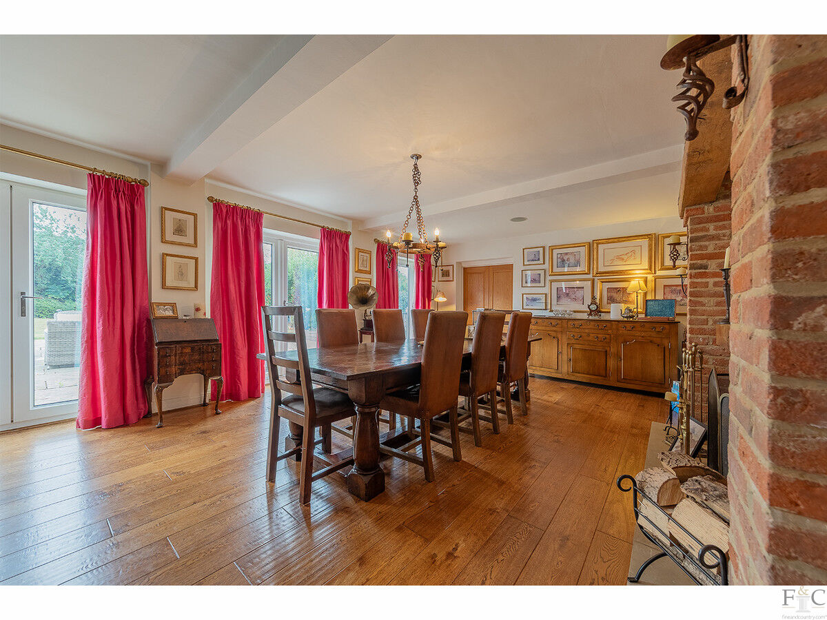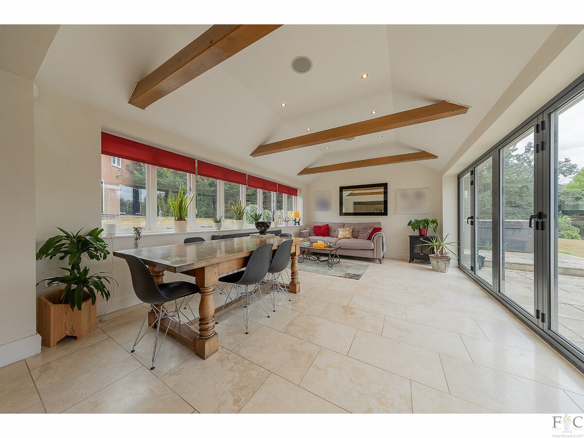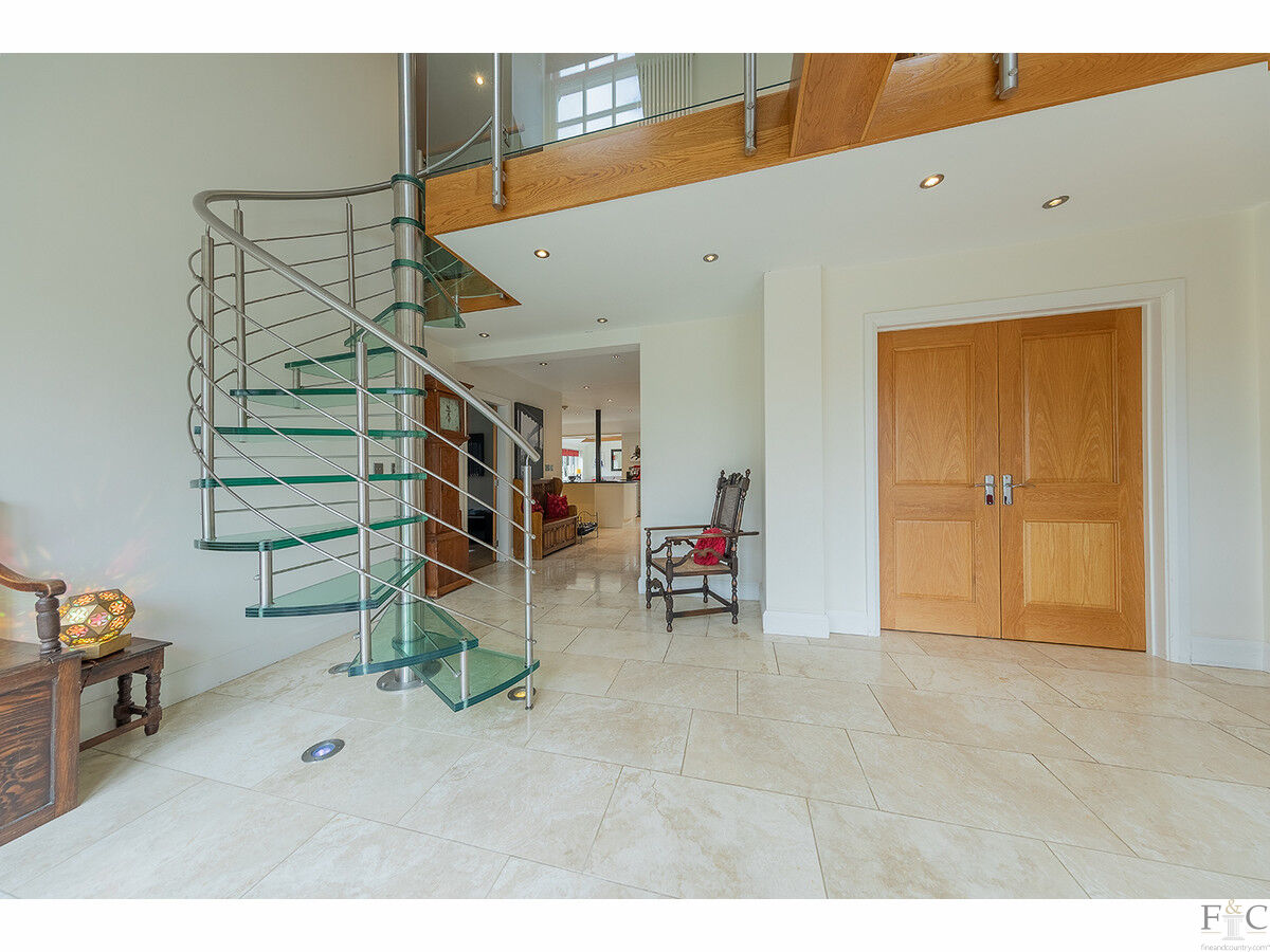 A spacious reception hallway with a bespoke solid oak staircase and a striking contemporary spiral staircase provides an impressive introduction to the home. The dual-aspect lounge is a bright and welcoming space, with several sets of bi-fold doors opening to a raised seating terrace, complemented by a sleek inset wood-burning stove. A formal dining room with exposed chimney breast and stove adds character, while a snug and playroom provide additional flexible family rooms.