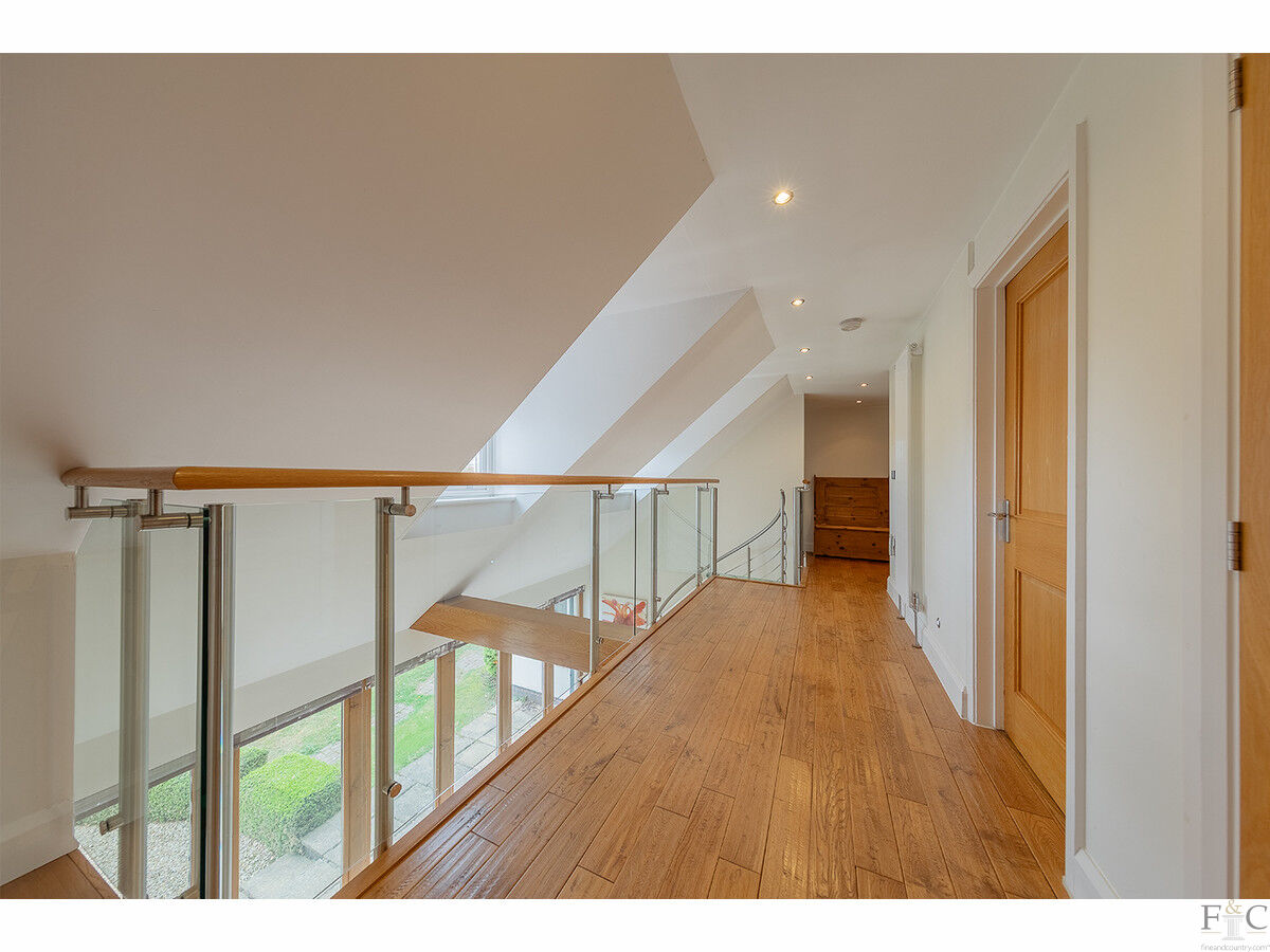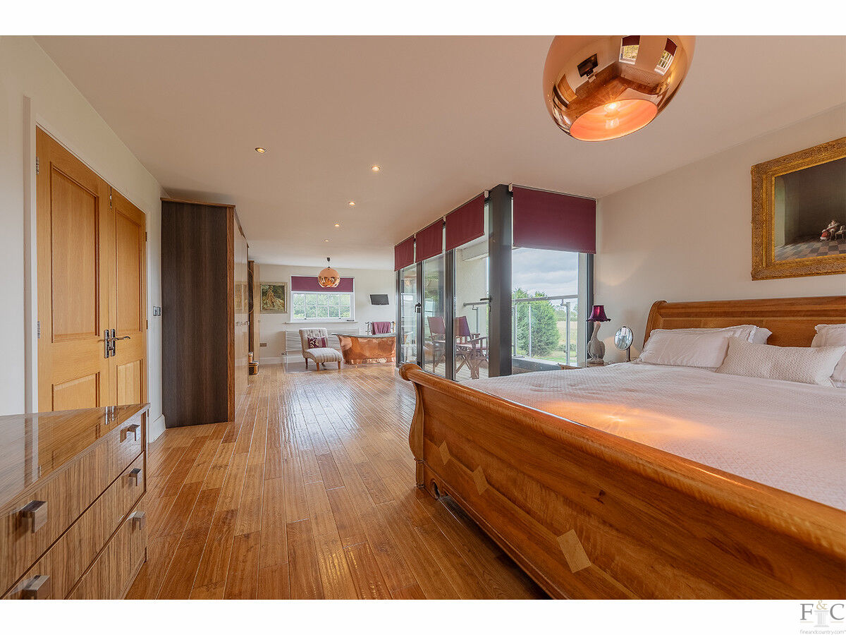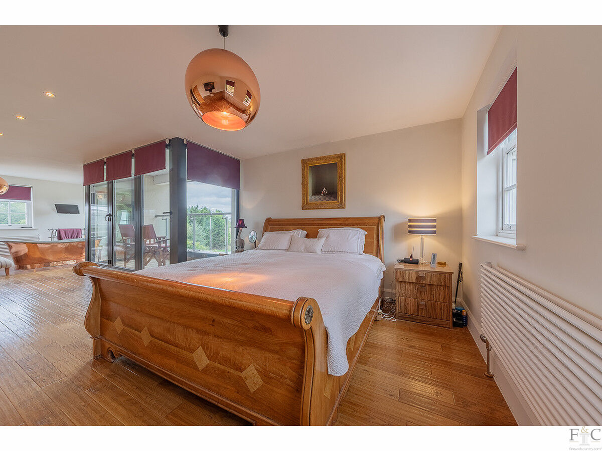 The triple-aspect principal suite enjoys its own balcony, perfectly positioned to take in evening sunsets across the gardens and paddocks. The suite also features a freestanding copper bath, a contemporary ensuite shower room, and an adjoining dressing room. Four additional double bedrooms, each with ensuite facilities, ensure comfort and privacy for family and guests.