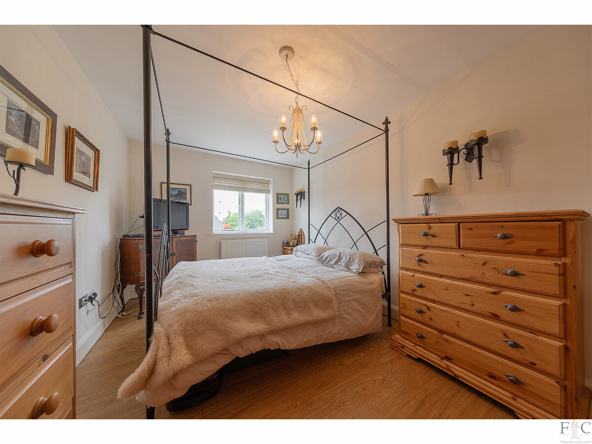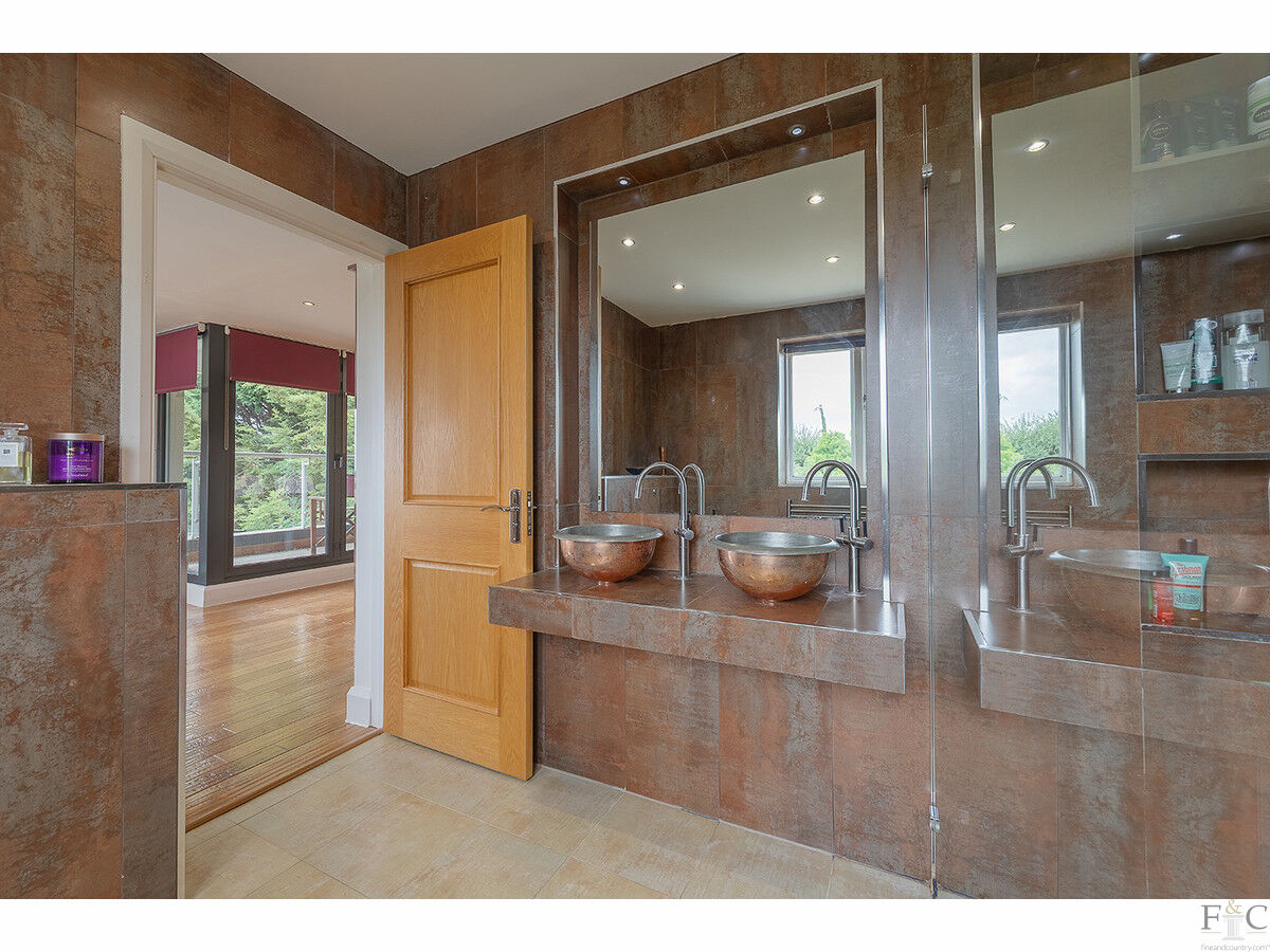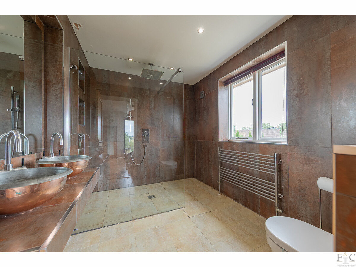 The triple-aspect principal suite enjoys its own balcony, perfectly positioned to take in evening sunsets across the gardens and paddocks. The suite also features a freestanding copper bath, a contemporary ensuite shower room, and an adjoining dressing room. Four additional double bedrooms, each with ensuite facilities, ensure comfort and privacy for family and guests.