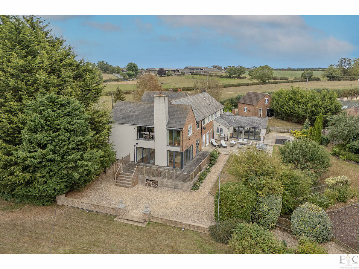 The property is surrounded by formal lawned gardens and paved terraces, ideal for entertaining or relaxing outdoors. In total, the grounds extend to around 8.5 acres (subject to measurement). One paddock, with independent access, hardstanding, and a tractor store, is currently mown for practical use, while the second is enjoyed as a wildflower meadow with a natural pond. The detached double garage with office space above provides excellent flexibility, whether for home working or hobbies.