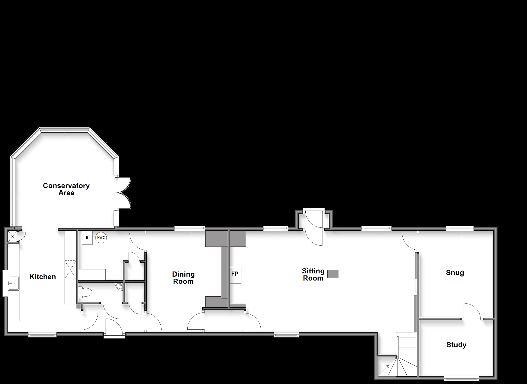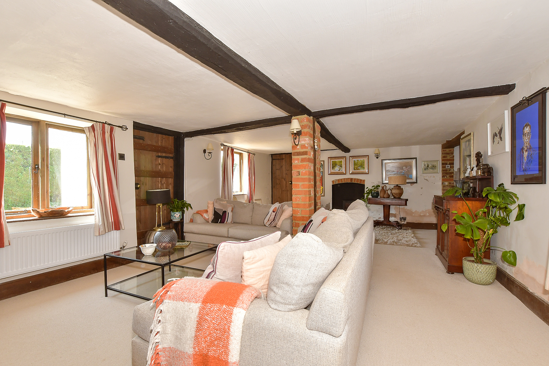This lovely room also has a brick wall around a large inglenook with a log burner that is just the place to cosy up to on a cool winter’s evening. It features exposed ceiling and wall beams as well as a brick covered vertical beam and the original inner front door. There is also an oak staircase to the first floor, a second fireplace and access to the 1960s extension that includes a charming snug with painted ceiling beams and where you can enjoy a quiet read or relax in front of the television. Beyond the snug is a very useful study that is ideal for anyone working from home.