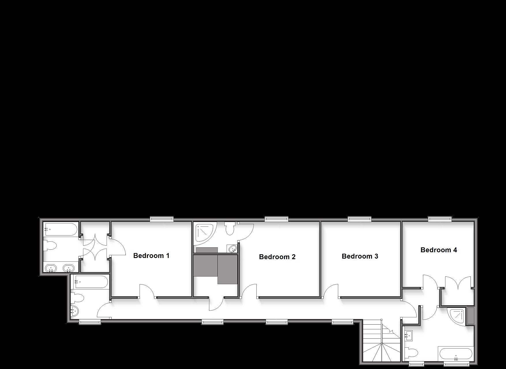 On the first floor there is almost a separate suite that consists of a double bedroom with fitted shelving and deep built in wardrobes as well as an adjacent bathroom. While the rest of the first floor accommodation is accessed off the corridor with original ceiling beams, high wood skirtings and wood doors. There is a family bathroom, a storage cupboard and three double bedrooms including one with an ensuite shower and the first bedroom suite with a walk in wardrobe and fitted cupboards as well as an ensuite bathroom.