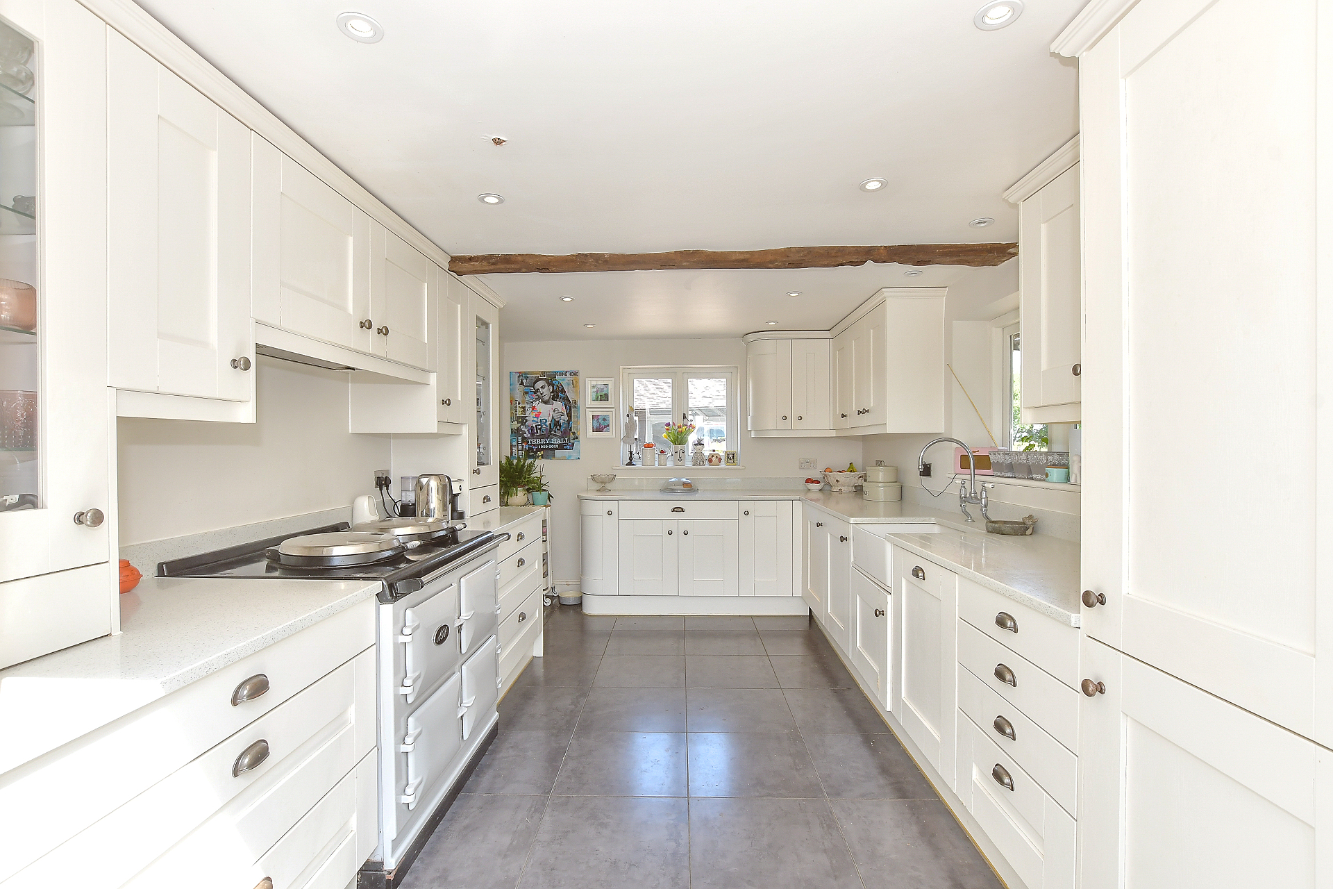 At the other end of the property is the 1980s extension incorporating a contemporary kitchen with an electric Aga, a larder and shaker style units housing a fridge and a dishwasher. It is open plan to a conservatory providing a seating and dining area with delightful views over the garden and French doors to the terrace.