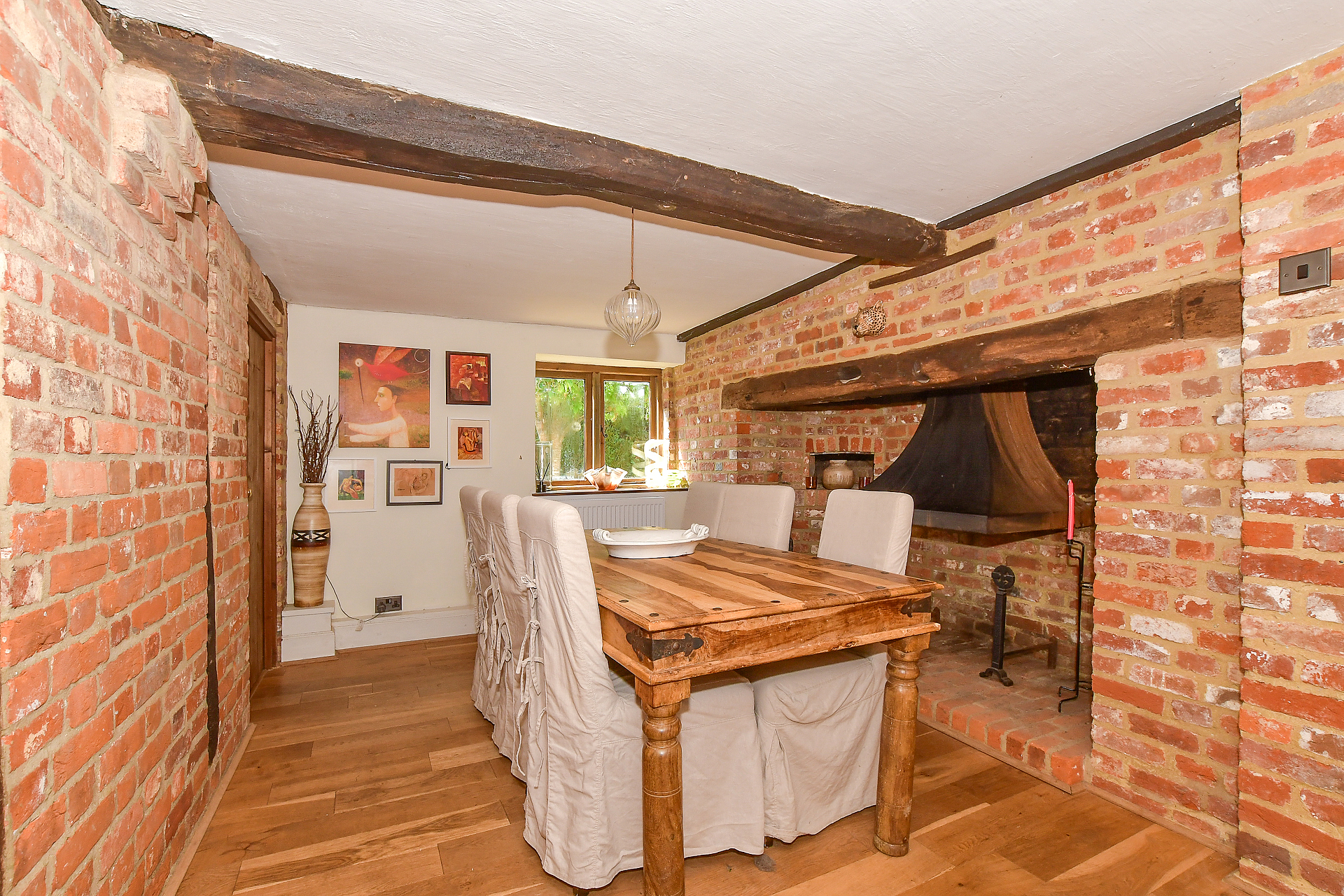 The property is full of wonderful period features including wood doors, exposed beams and a hallway with original herringbone tiled flooring with storage cupboards. This has a door to the characterful dining room that features a brick wall and an inglenook fireplace that includes a Bressummer beam believed to come from a Tudor shipyard, and the original bread oven. There is an adjacent utility room with tiled flooring, additional appliances, storage facilities and a large tank as well as a lobby leading the spacious and dual aspect sitting room.