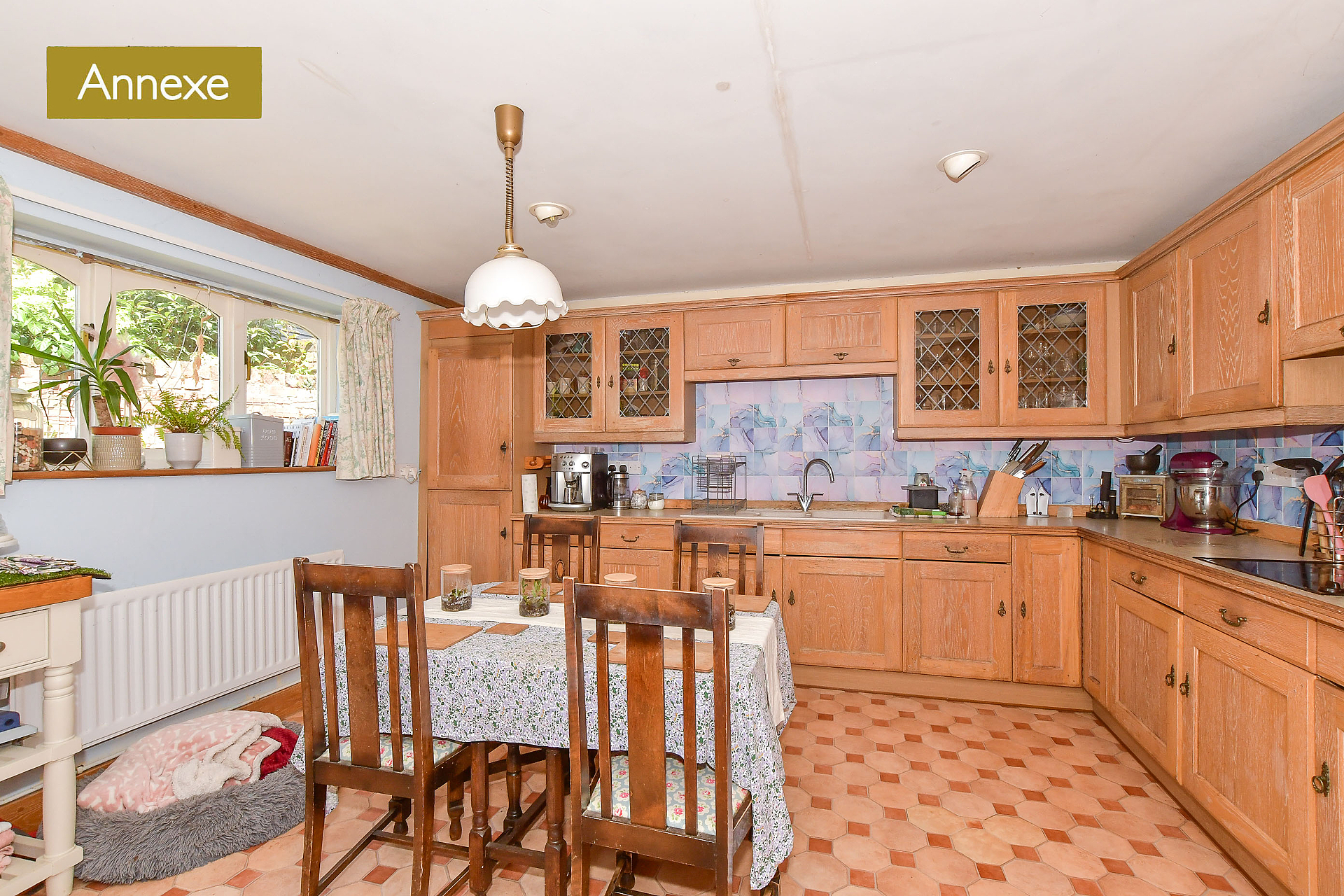 The annexe front door opens into a tiled hallway with access to the ground floor accommodation. This includes a delightful and spacious dual aspect lounge with a lovely inglenook fireplace incorporating a beautiful old beam, a log burner and a log store as well as stairs to the first floor. You will also fine a well-proportioned kitchen/diner with a larder and fitted units housing a hob, a double oven and fridge freezer while leaving plenty of space for a table and chairs. There is also an external door to a courtyard style garden with raised shrub beds and a large utility room with additional appliances and separate toilet.