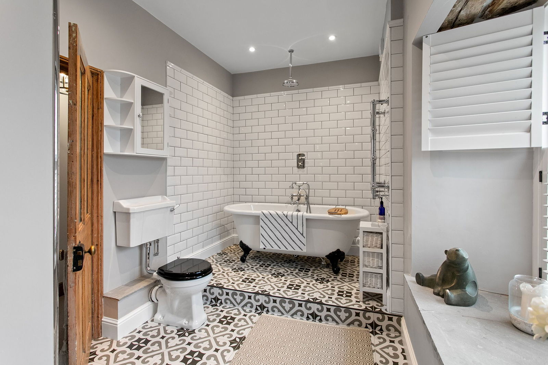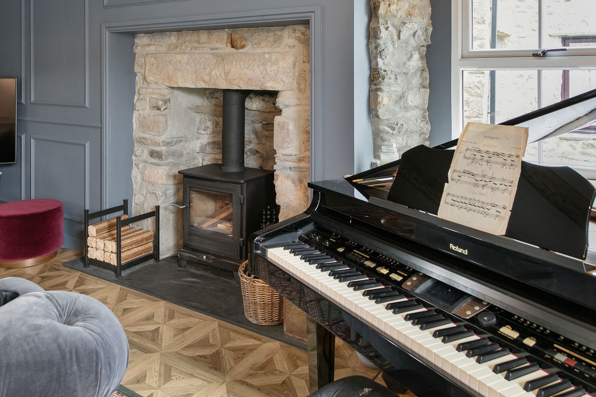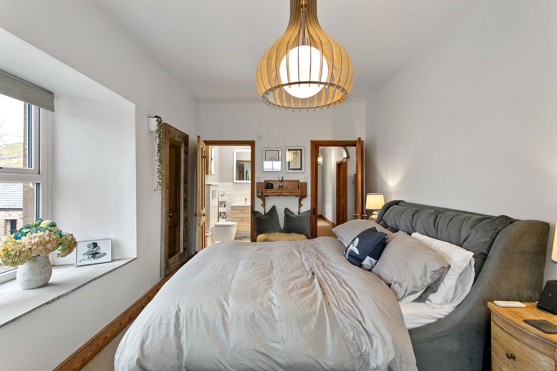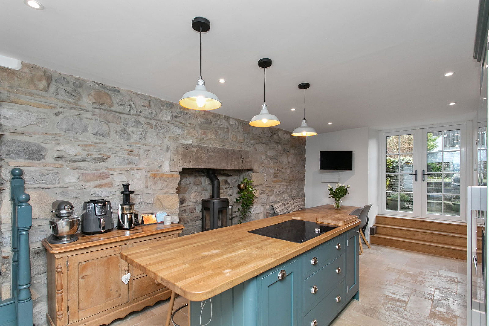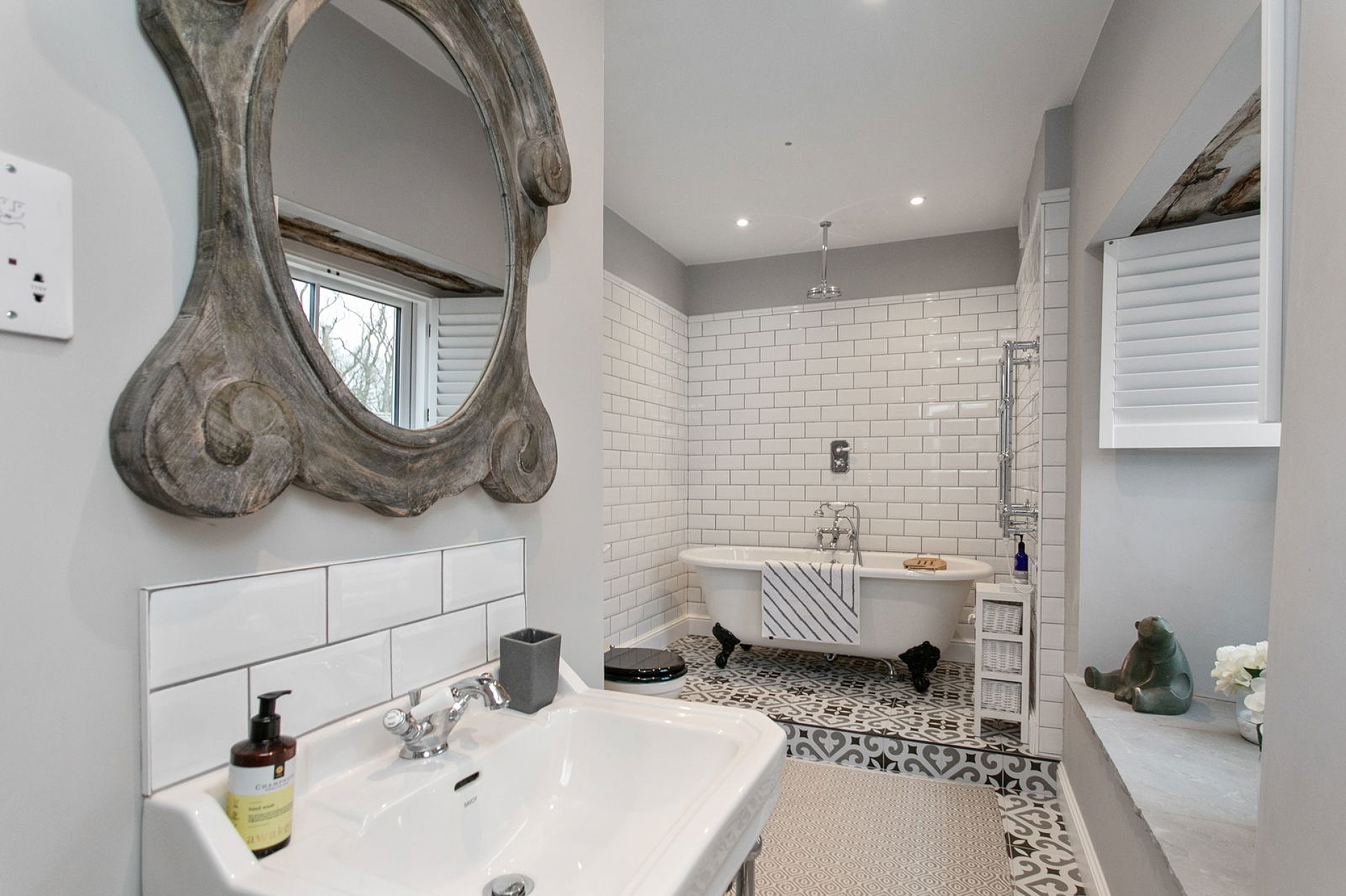 Fixtures and fittings were also replaced. A luxury handcrafted kitchen was installed by local company Lund & Law, built of solid wood and painted in Farrow & Ball’s Inchyra Blue with oak worktops, a larder cupboard and matching island unit. The island extends into a breakfast bar for informal dining leaving room for a dining table next to the French windows leading out to the garden. This is most definitely a room made for both family life and entertaining friends; it includes one of the three wood burning stoves within the house. Supporting the kitchen and approached from a side hall is a practical utility area which encompasses storage space for coats and boots, laundry machines, the boiler and water tank (themselves within a large cupboard, ideal for drying off outdoor gear) and a shower room. The house bathroom has a period aesthetic including a free-standing bath with claw and ball feet and a most attractive wash basin on a stand. The ensuite and ground floor shower rooms both channel a more contemporary look – throughout the house the blend of old and new styles works well as the choice of colour, materials and textures unifies the whole with great success.