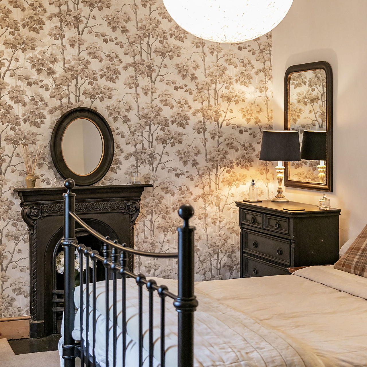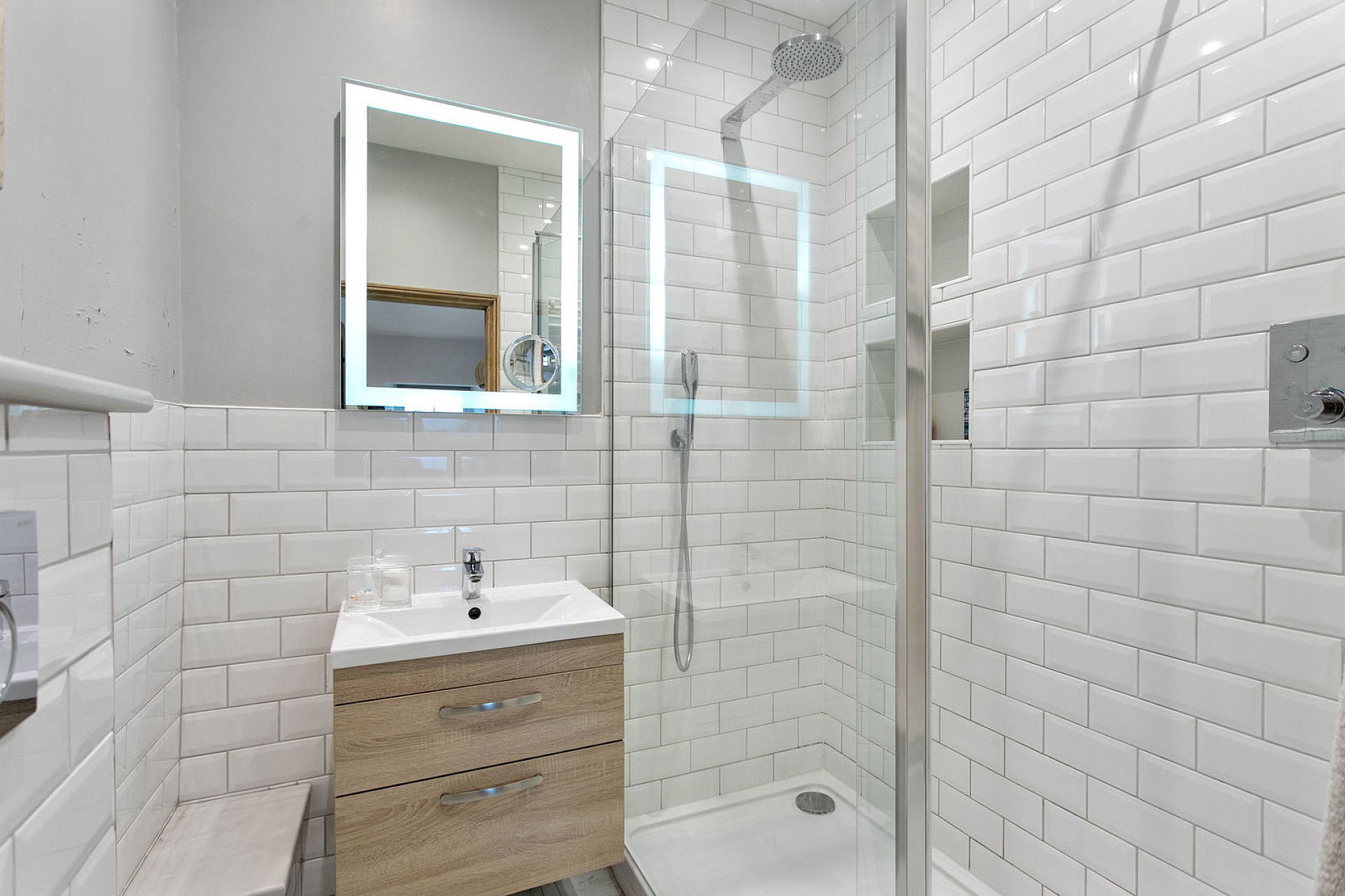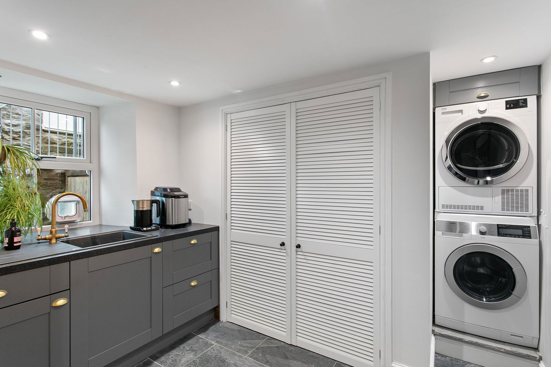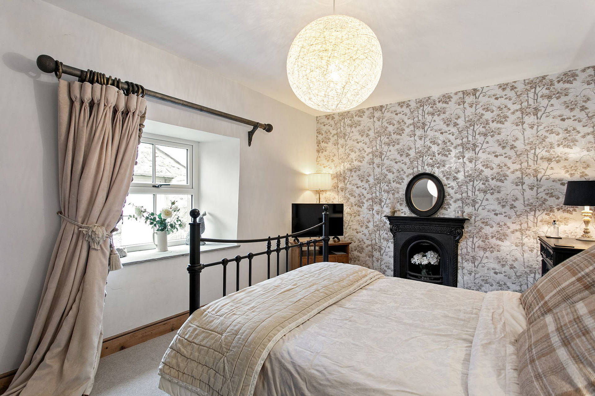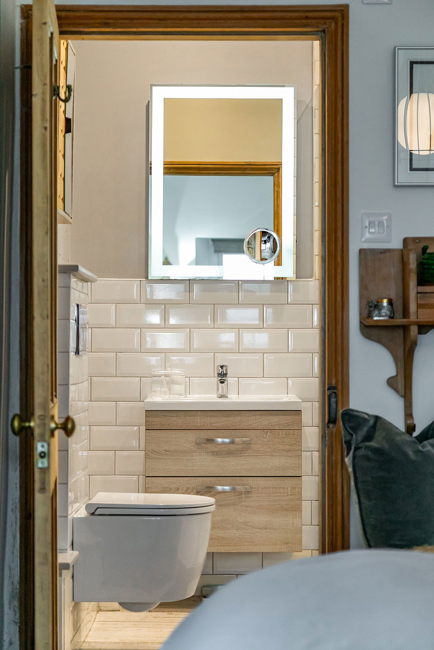 Fixtures and fittings were also replaced. A luxury handcrafted kitchen was installed by local company Lund & Law, built of solid wood and painted in Farrow & Ball’s Inchyra Blue with oak worktops, a larder cupboard and matching island unit. The island extends into a breakfast bar for informal dining leaving room for a dining table next to the French windows leading out to the garden. This is most definitely a room made for both family life and entertaining friends; it includes one of the three wood burning stoves within the house. Supporting the kitchen and approached from a side hall is a practical utility area which encompasses storage space for coats and boots, laundry machines, the boiler and water tank (themselves within a large cupboard, ideal for drying off outdoor gear) and a shower room. The house bathroom has a period aesthetic including a free-standing bath with claw and ball feet and a most attractive wash basin on a stand. The ensuite and ground floor shower rooms both channel a more contemporary look – throughout the house the blend of old and new styles works well as the choice of colour, materials and textures unifies the whole with great success.