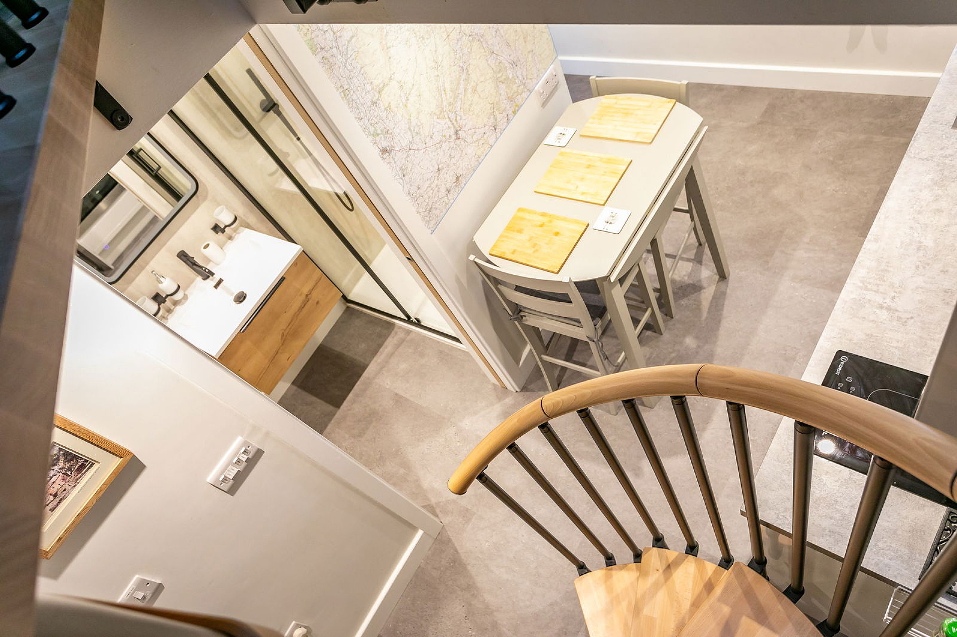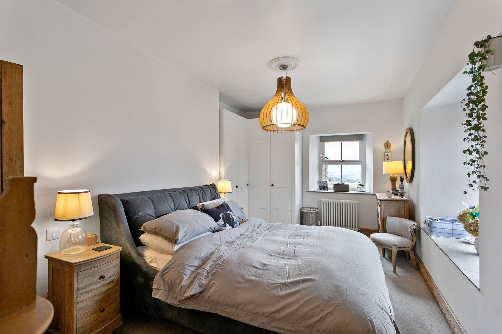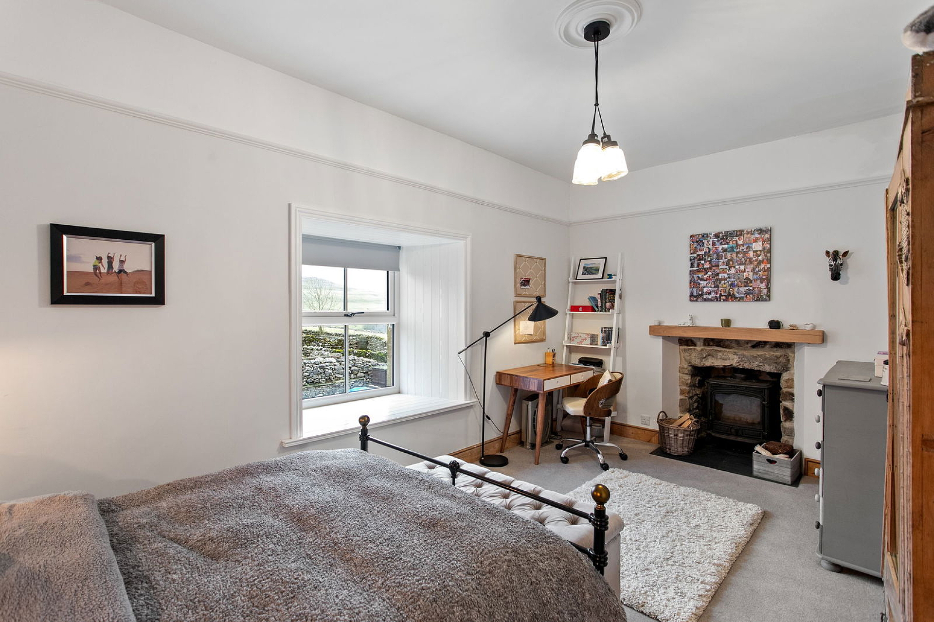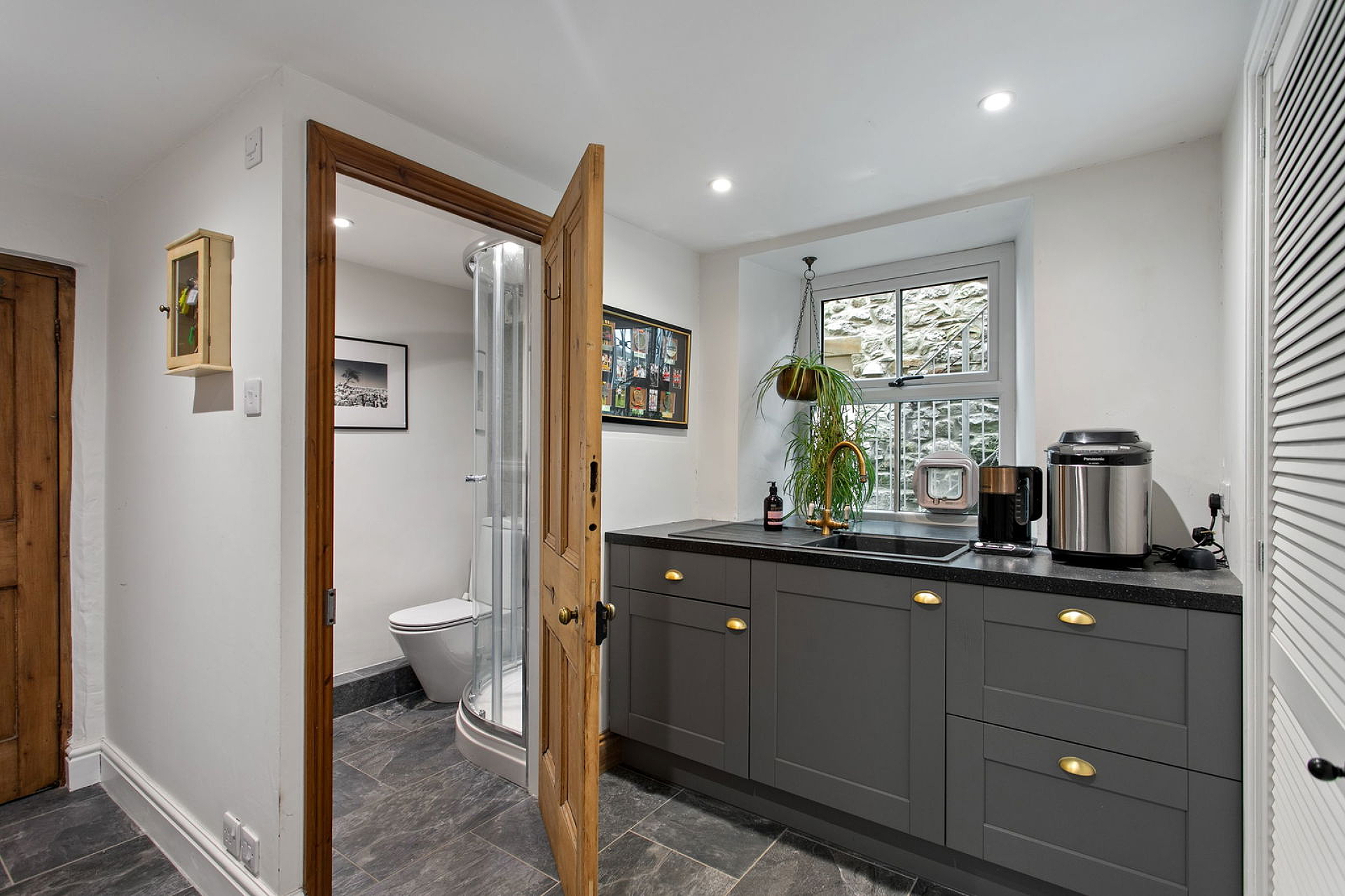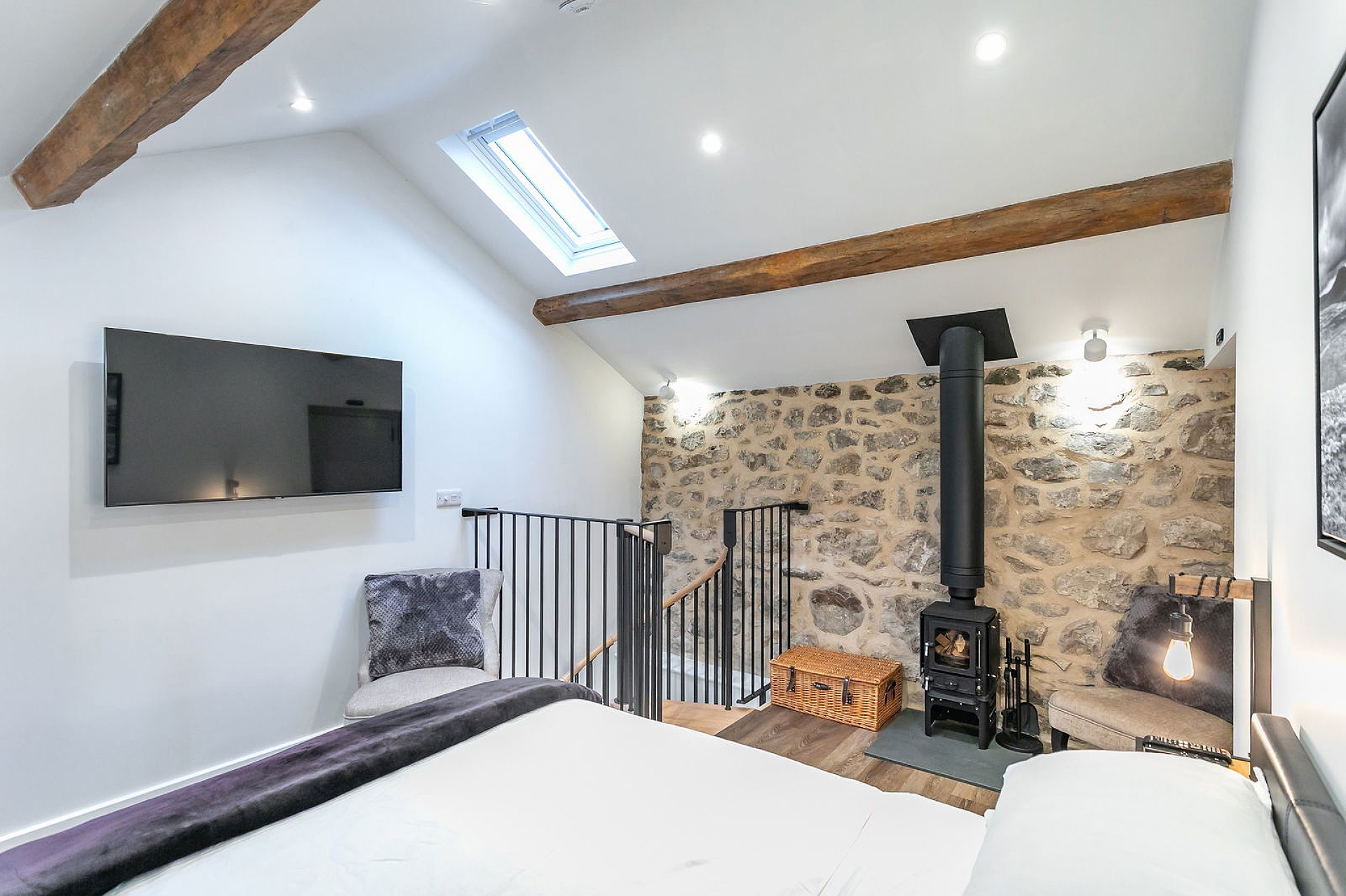 Converted from a former barn in 2024, Skylight Retreat is self-contained and perfect for various users; as a guest suite, for dependent family members or as a commercial holiday let as it currently operates. A thoughtful micro-barn conversion, with a dining kitchen on the ground floor as well as a shower room and approached via a spiral set of stairs, a combined bed/sitting room (there’s also an external set of stone steps to the first floor). Absolutely charming it has a ceiling rising to the apex of the roof, a dinky wood burning stove and a panoramic far-reaching view.