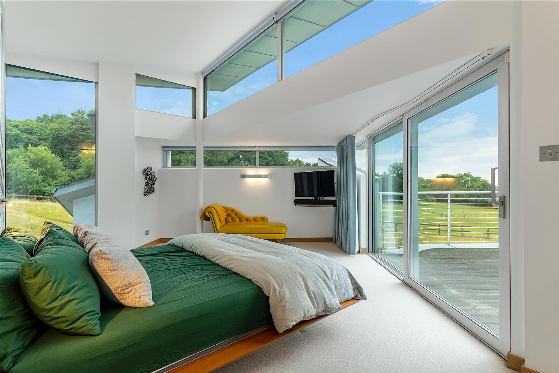 Extensive glazing, projecting window bays, glass cupula and high ceilings (2.6m) make this a house that is flooded with natural light. Verandas and terraces are also designed to pick up the light at all times of the day as well as maximizing enjoyment of the views. Full-height double glass doors sweep open to reinforce Richard Reid's ethos of inviting the countryside in. The interior of the house has been finished to a high standard, with an exacting attention to detail including a completely refurbished kitchen. Materials used include marble, limestone and American Oak.
