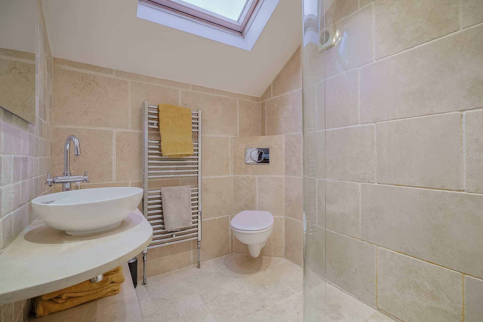 The beautifully bright principal bedroom features oak flooring, a side-facing window, vaulted ceiling, and a Velux window. It offers a built-in wardrobe with hanging rail and a private en-suite comprising a WC, circular Jacuzzi wash basin, large walk-in shower, heated towel rail, mirror with lighting, extractor fan, spotlighting, tiled flooring and walls, and a Velux window.