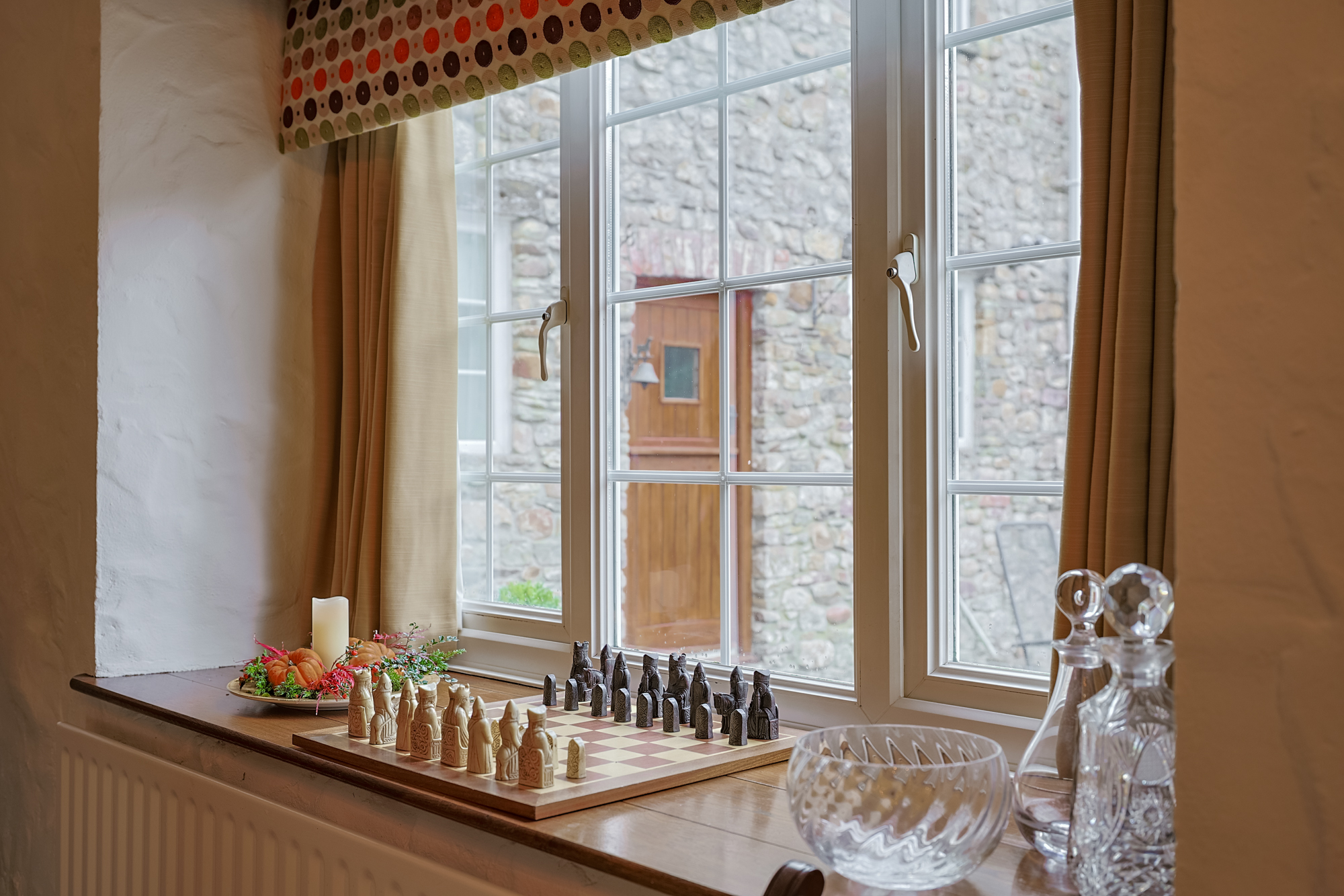 Accessed via double doors from the entranceway, the lounge is a character-filled space with dual-aspect windows overlooking the grounds. The feature stone wall with wood burner and oak mantel immediately draws the eye, while carpeted flooring, high ceilings, exposed beams, and lintels enhance the cosy, inviting atmosphere. This space is perfect for entertaining or unwinding and provides access to the patio and a versatile studio.