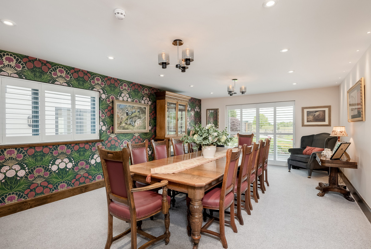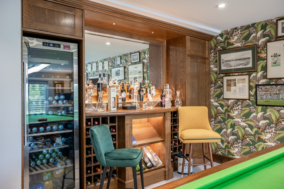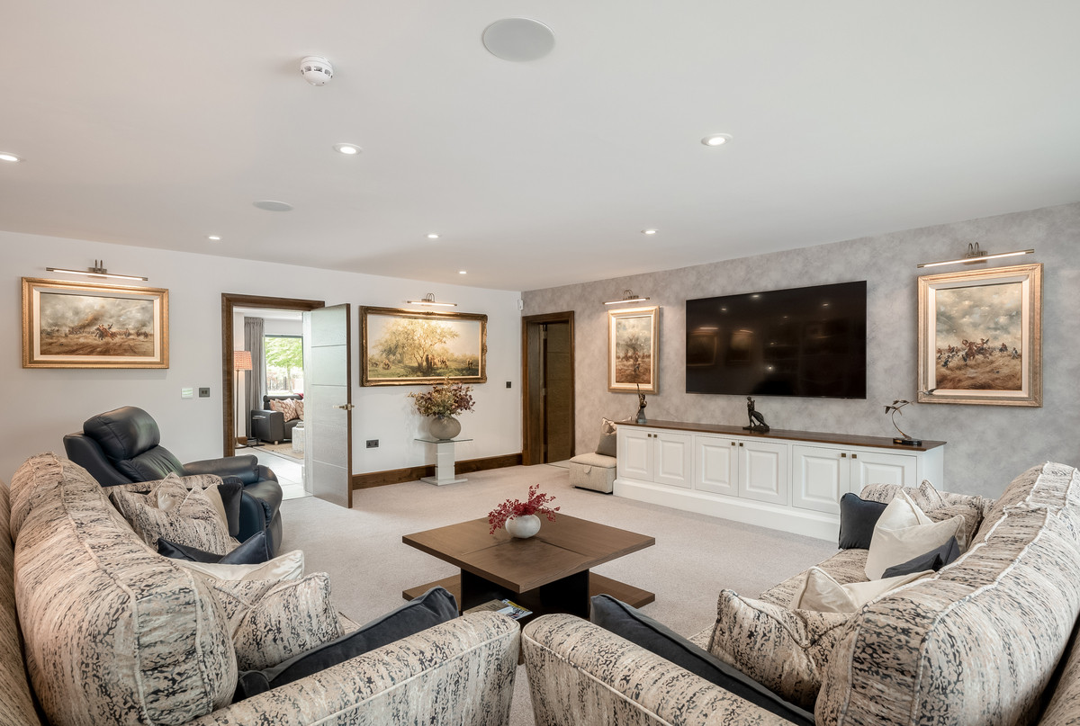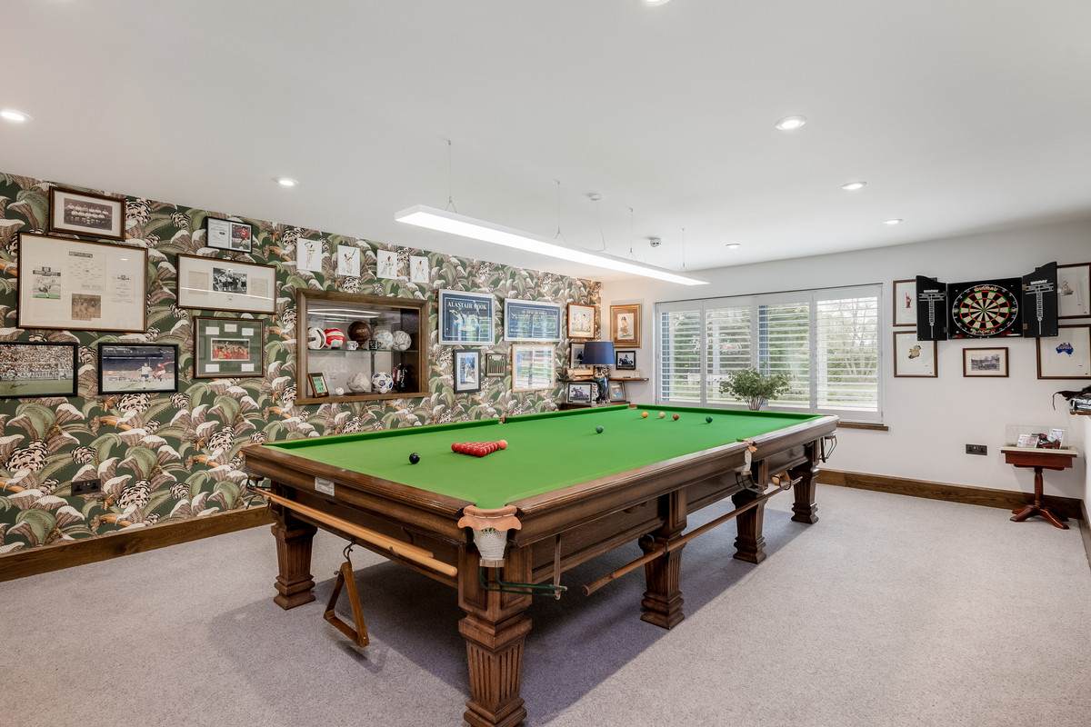 Accessed from both the kitchen and the main hallway is the generous sized sitting room with built in display cabinets, which leads through to a games room large enough to comfortable house a full-sized snooker table and comes complete with a beautifully crafted built-in bar with full height drinks fridge and wine storage.