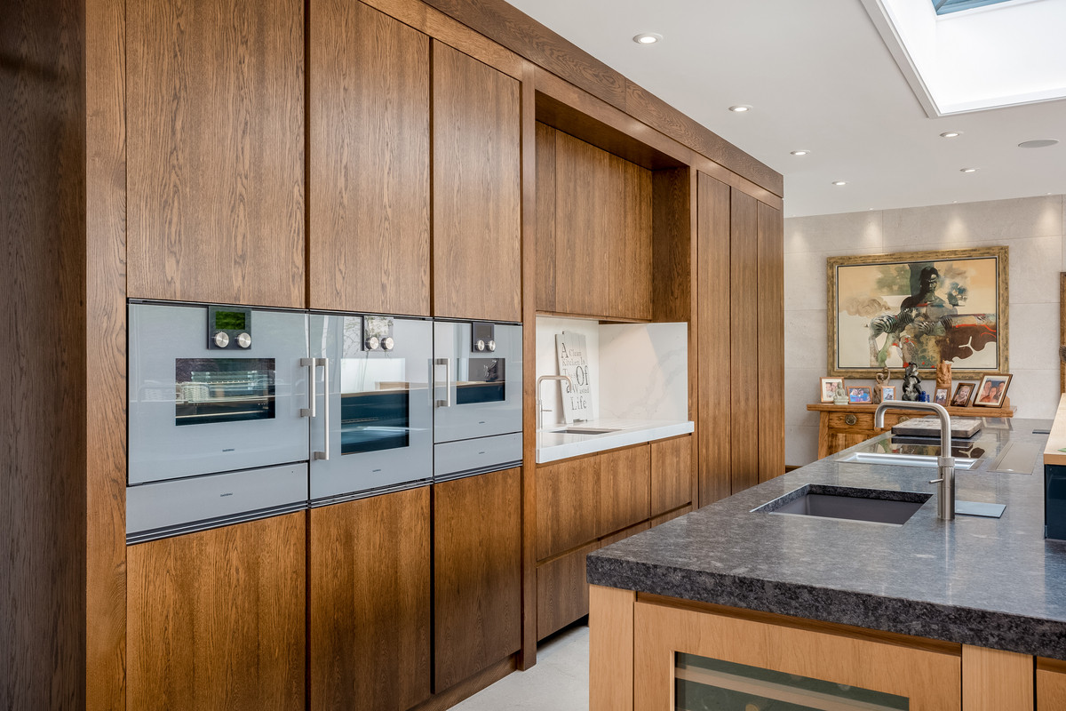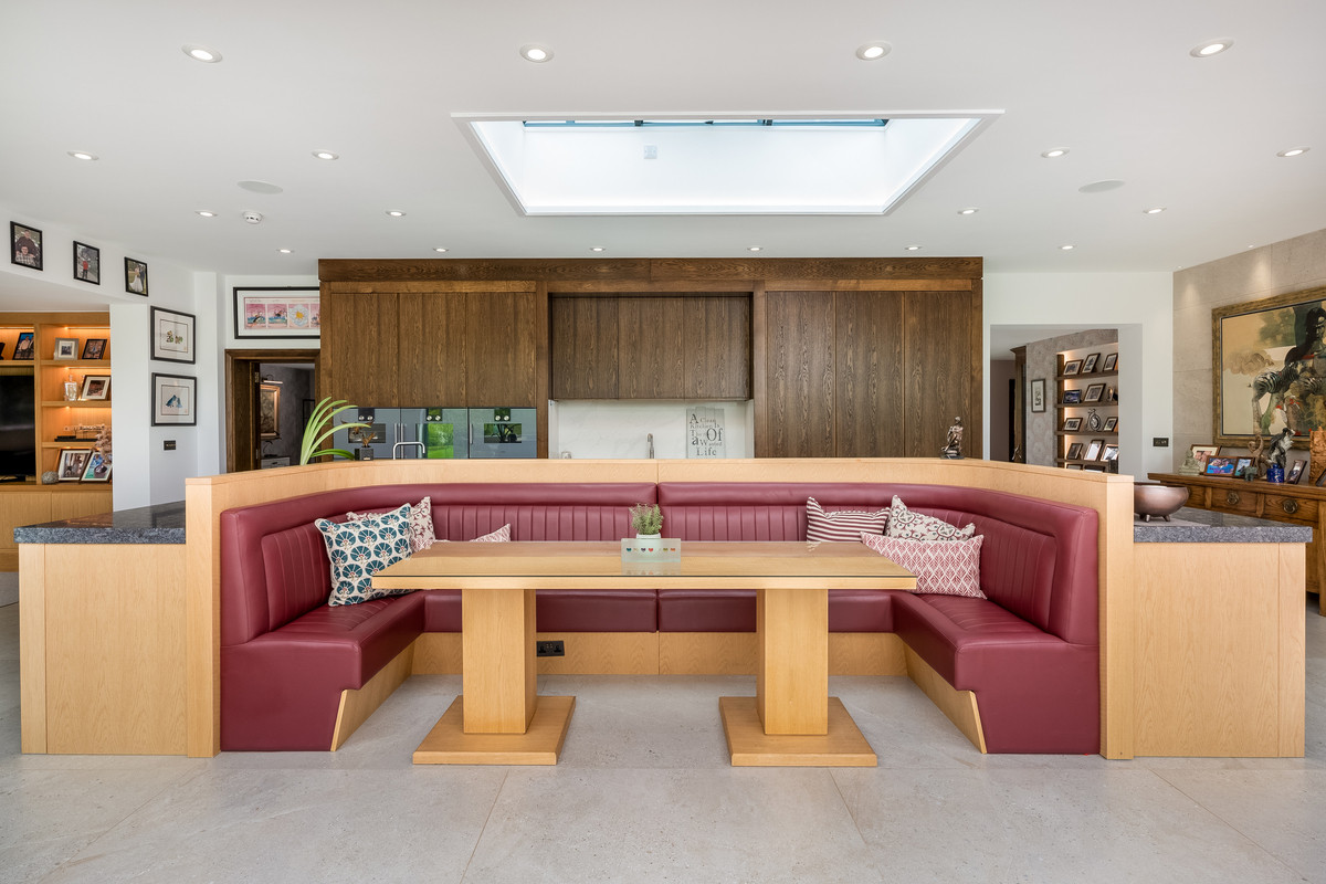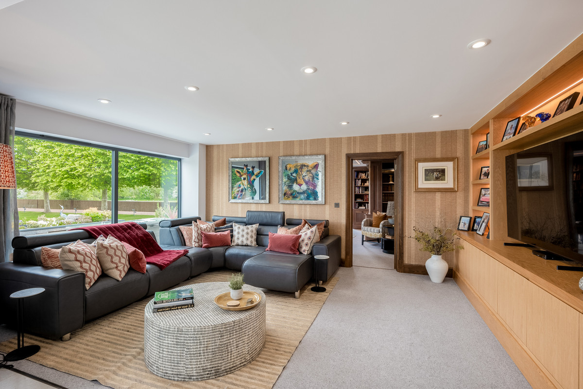 Leading directly off the main hallway is the wonderful open plan kitchen and family area. The bespoke hand-built kitchen by Thomas Philpott features a large central island with built in booth seating, granite worktops, induction hob and a wealth of built in appliances including Gaggenau ovens, six wine fridges, dishwasher and fridge freezer. This spectacular kitchen dining area is flooded with light from a light lantern above and a wall of glazing with sliding doors which open to connect this area with the fantastic entertaining area outside. To the right of the kitchen is the spacious family area with built in storage and display cabinets. This area is perfect for casual entertaining and leads through into another reception room which is currently used as a library with bespoke shelving units. This room also has direct access to the wrap around patio via sliding doors and a patio door to the side and access to the first of two double garages and a w/c, providing flexible living accommodation with multiple potential uses.