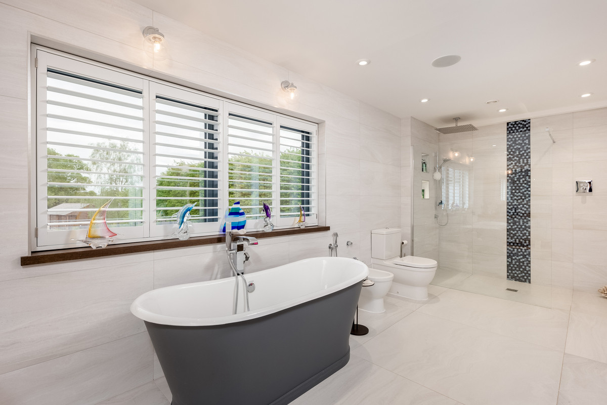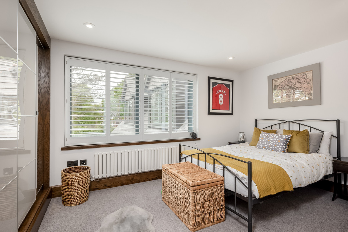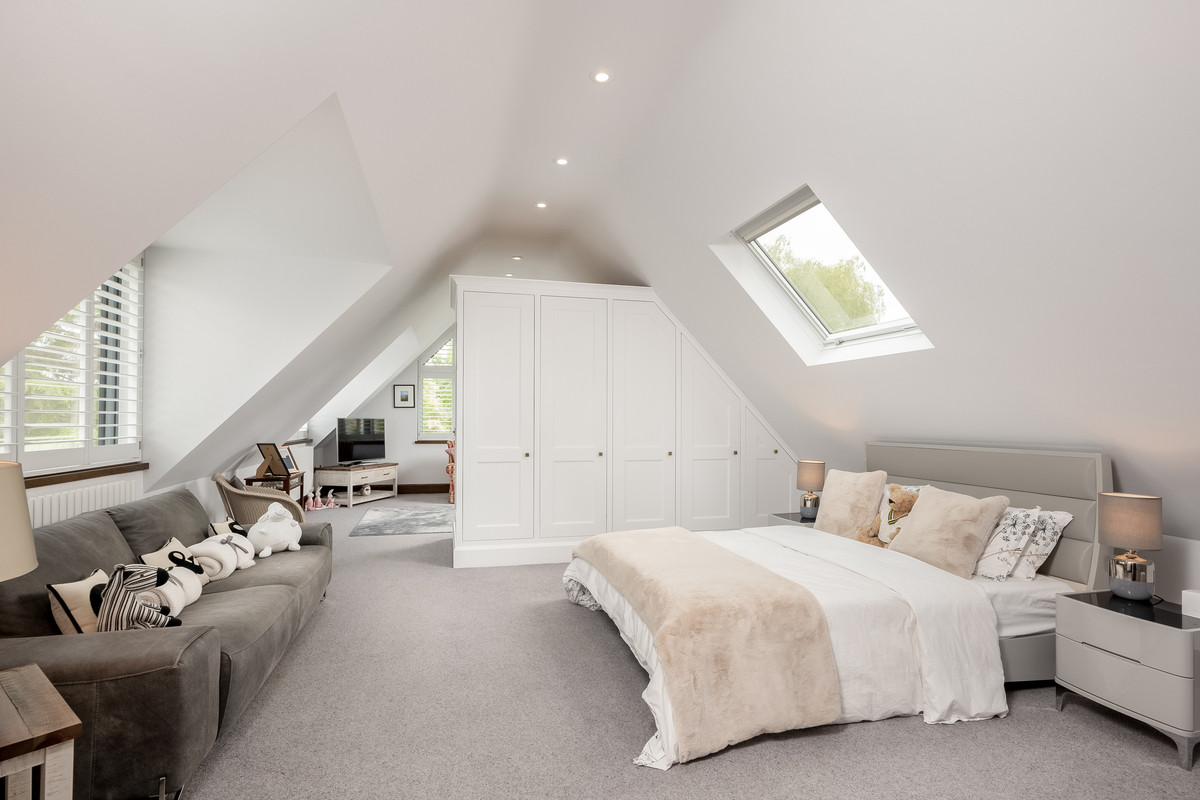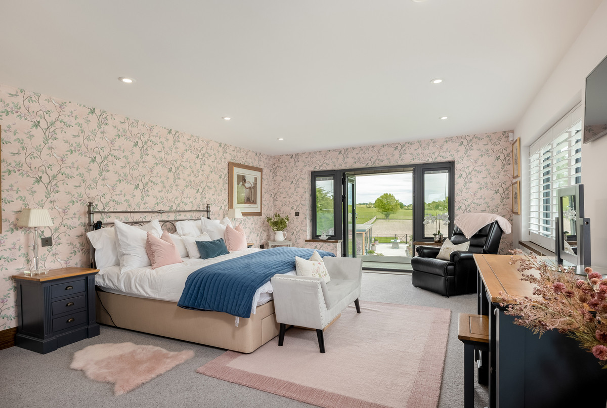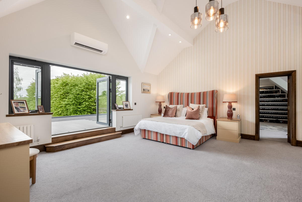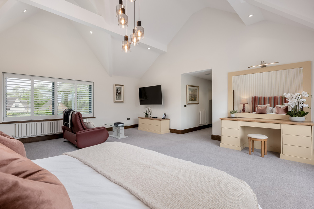 The generous sized master bedroom features a vaulted ceiling, patio doors enjoying far reaching countryside views and is large enough to comfortably accommodate a separate seating area and vanity units. The master suite also features a spectacular dressing room with three bespoke walk-in wardrobes, separate shoe storage and seating areas. The ensuite is also generously sized and features a large walk-in shower, roll top bath, his and hers sinks, w/c and bidet.