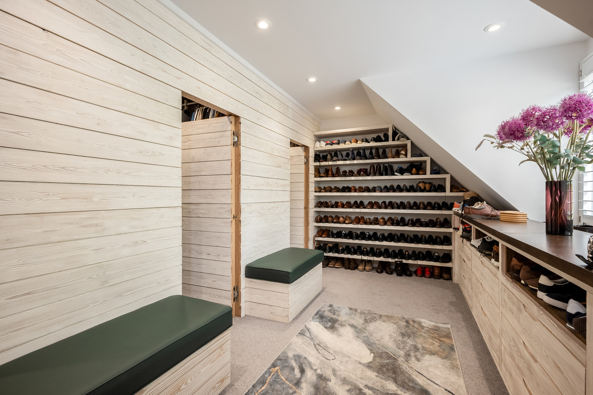 The spacious double height entrance hallway gives a glimpse to the luxurious finishes that are found throughout this property, with bespoke storage hand-built by Thomas Philpott and a galleried landing above this area is flooded with light from the glazed frontage.