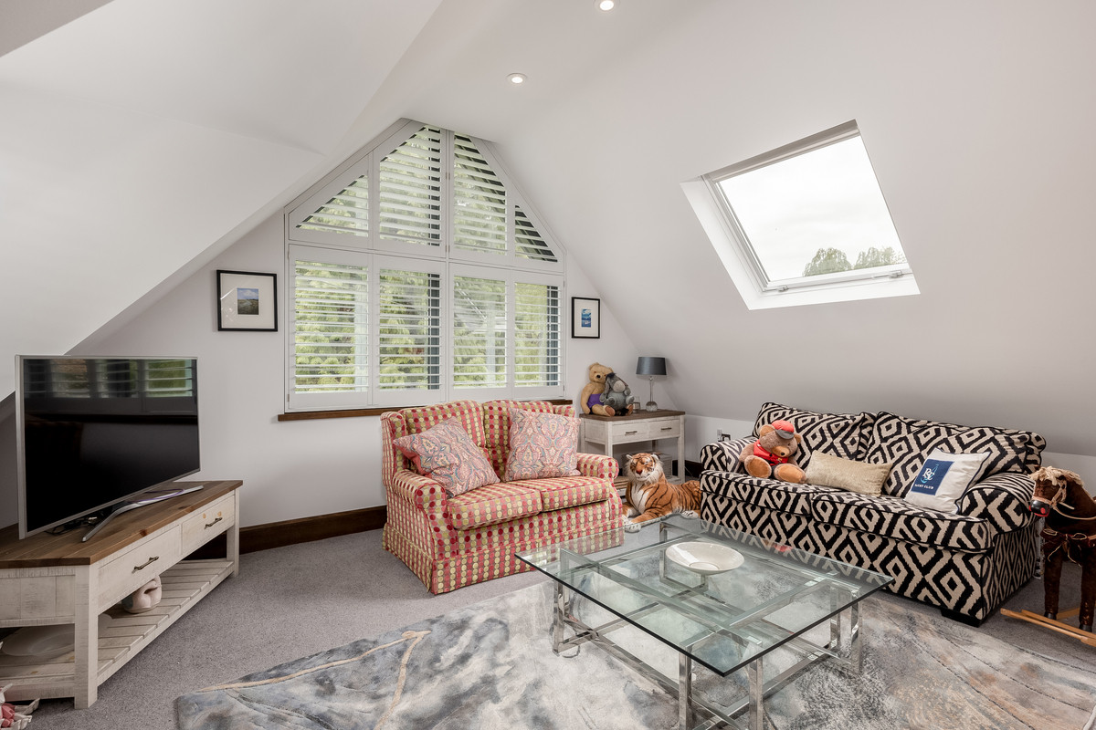 The fifth bedroom to the front of the property is of a very generous size with built in storage separating the room into a bedroom area and a separate seating area, perfect as guest accommodation or for those with extended family seeking semi-independent living accommodation. This room and its ensuite both feature skylight windows and beautiful feature windows following the shape of the vaulted ceiling and flooding the rooms with light.