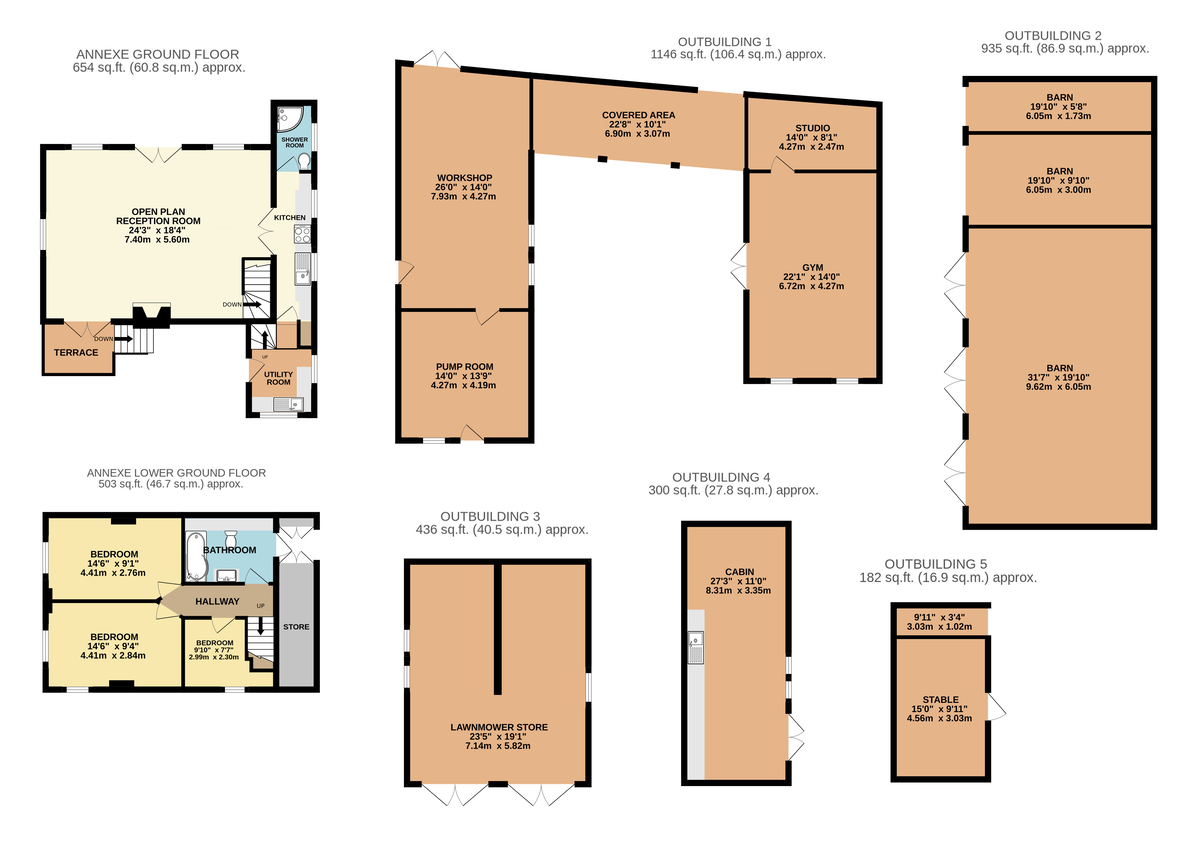 • Range of Outbuildings extending to 3,000sq.ft include a Cabin, a Gym, Studio, Workshop and Storage