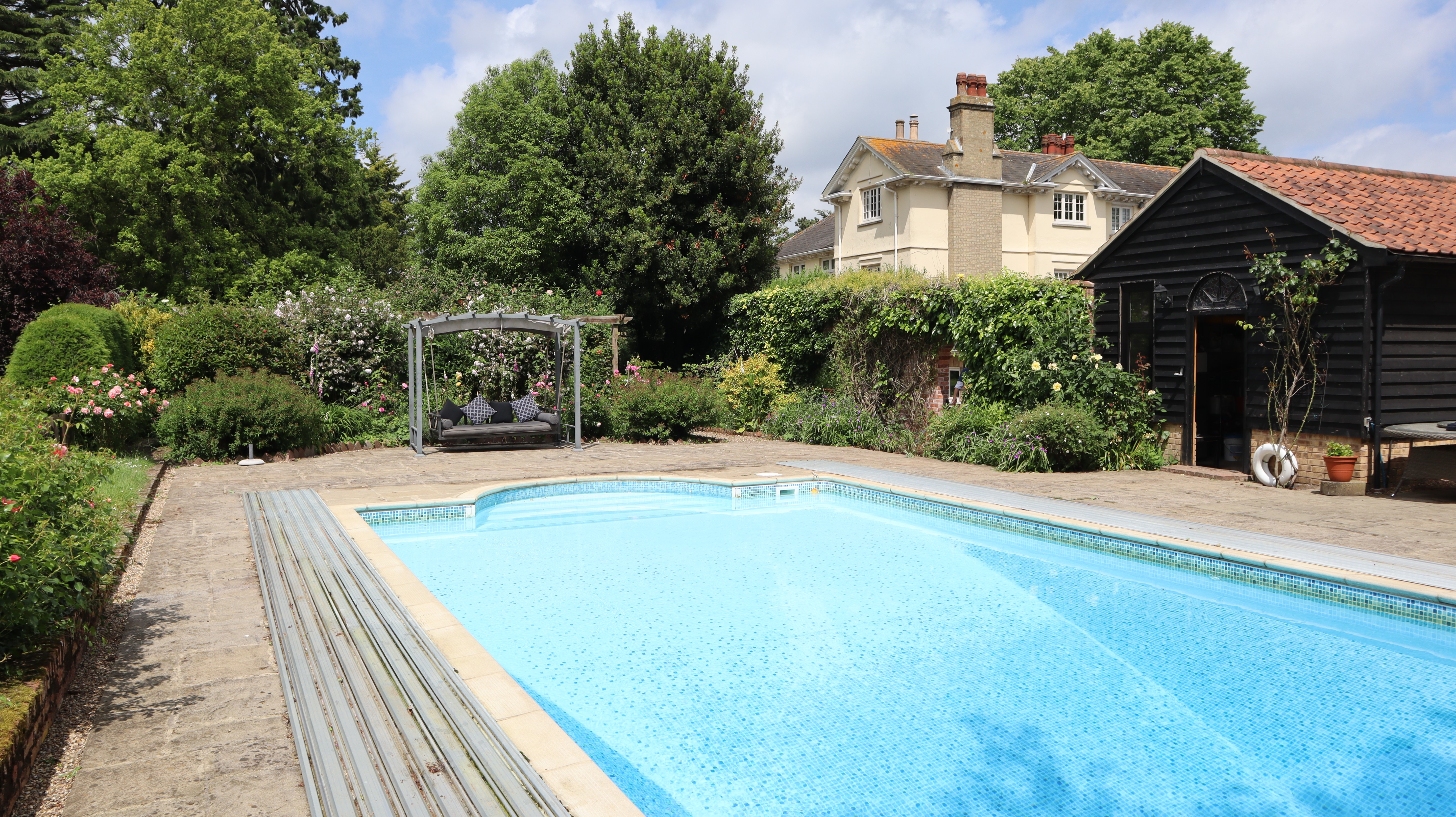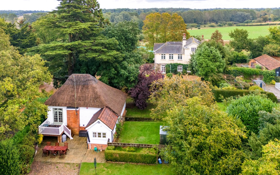 Here’s a hidden gem indeed! A perfectly formed small stately home – five bedrooms, four bathrooms – all set in five acres of grounds (stms) with its own swimming pool as well as a detached three-bedroom thatched cottage for visitors. Equestrians especially will be interested in the almost 3,000 square foot of various outbuildings awaiting configuration to your needs.