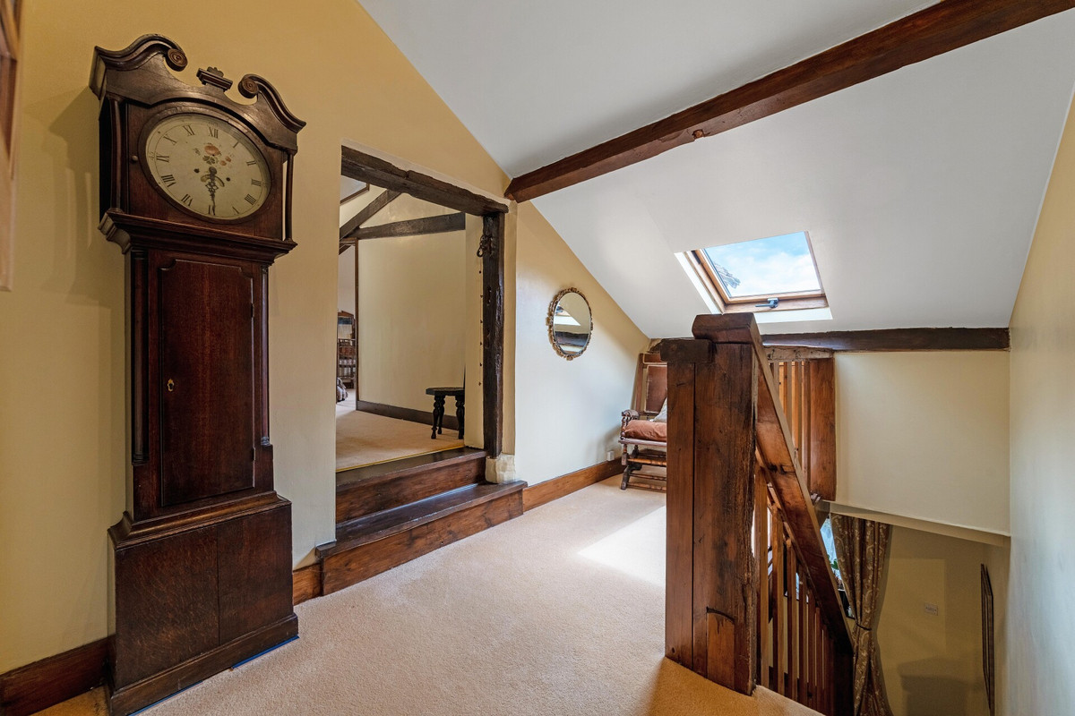 Upstairs offers four bedrooms, each with character features including exposed beams, sloped ceilings, and timber details. The principal bedroom is spacious and airy, while the additional bedrooms are perfect for family or guests. A generous landing with Velux windows provides extra seating space and natural light. There are two family bathrooms one featuring a bath, patterned floor tiles, and part-tiled walls, maintaining a charming barn-style feel throughout. A second bathroom is presented in a traditional style, featuring a white pedestal basin, WC, and a walk-in shower with classic green metro tiling. A Velux window provides excellent natural light, while exposed beams and wood-effect flooring complement the barn’s characterful charm.