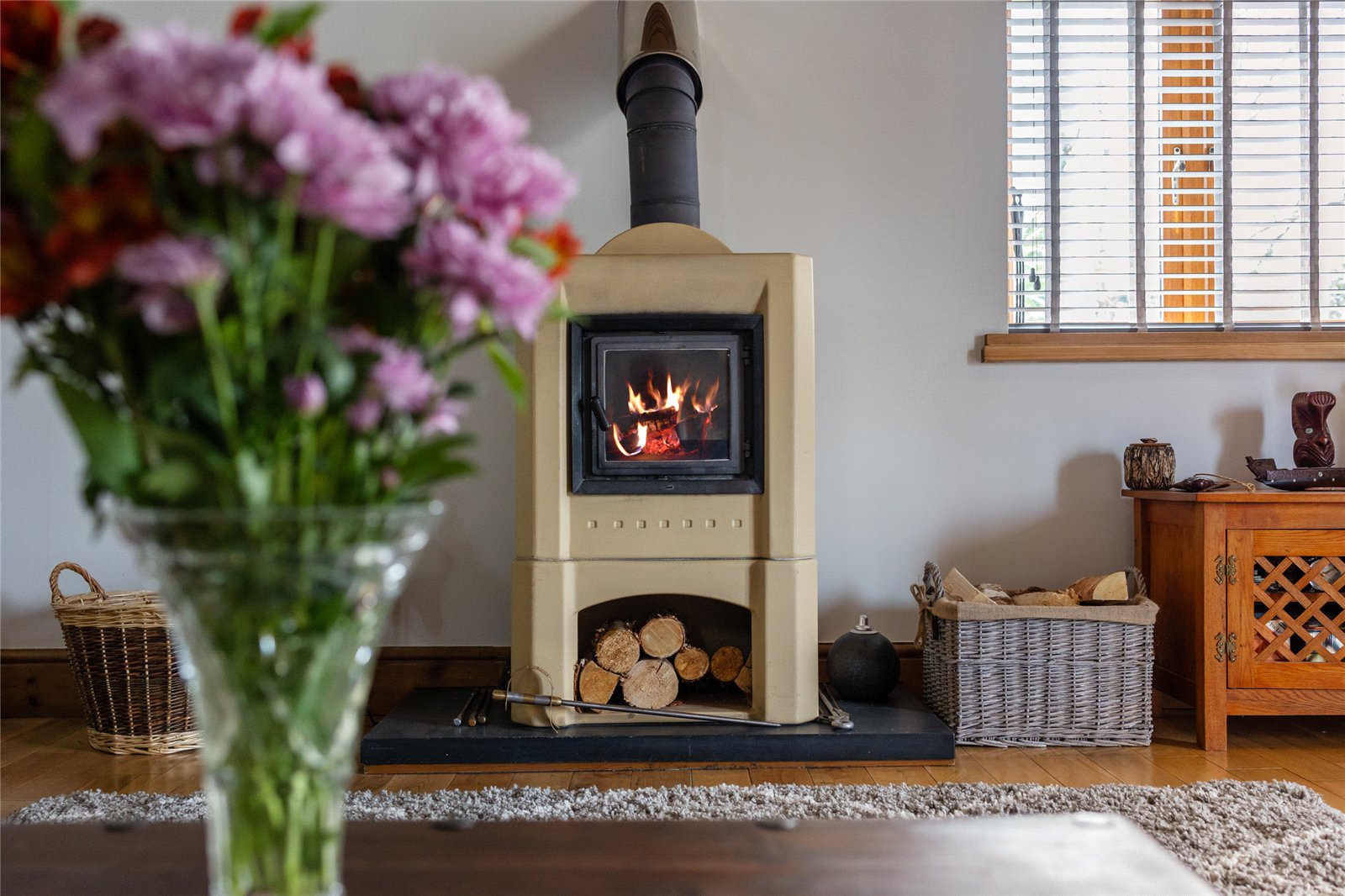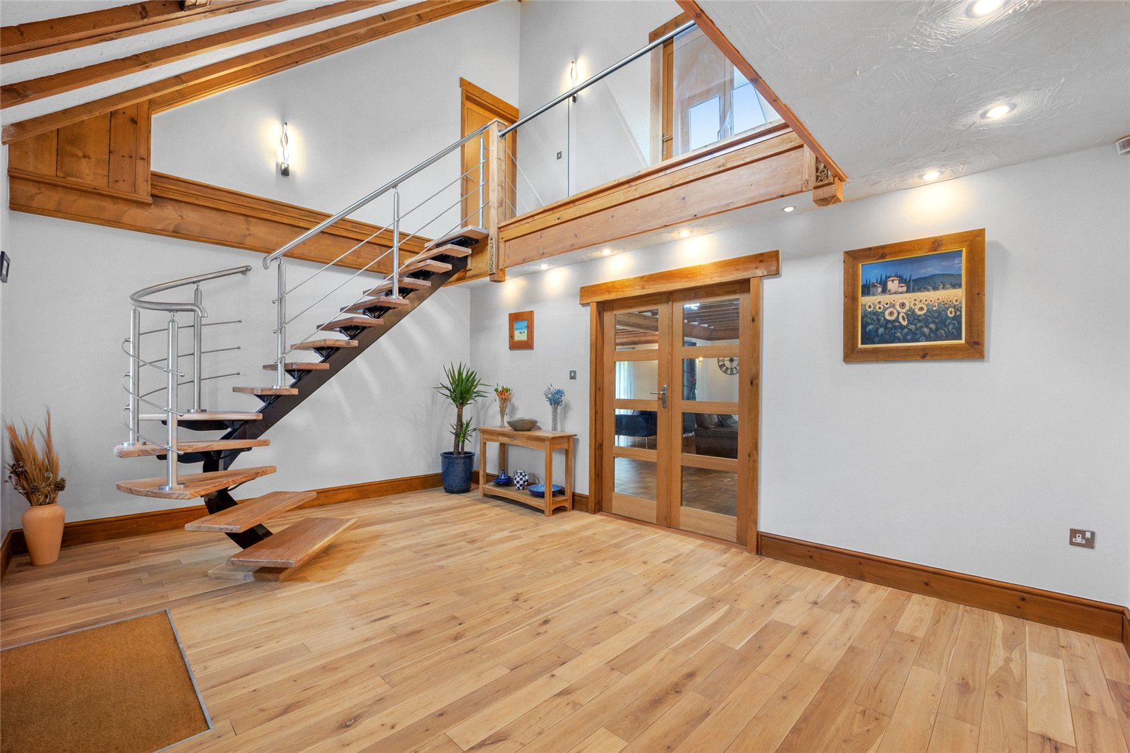 The accommodation is introduced via a welcoming reception hall, where a striking bespoke, handcrafted Romanian oak staircase forms a superb architectural centrepiece. To the right, a generous principal reception room provides an elegant yet comfortable living space, centred around a woodburning stove and complemented by double doors opening onto a raised patio terrace, perfectly positioned to take in the coastal outlook.