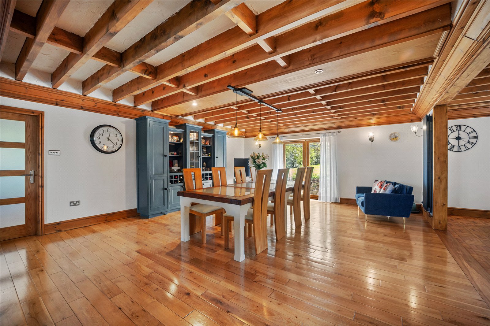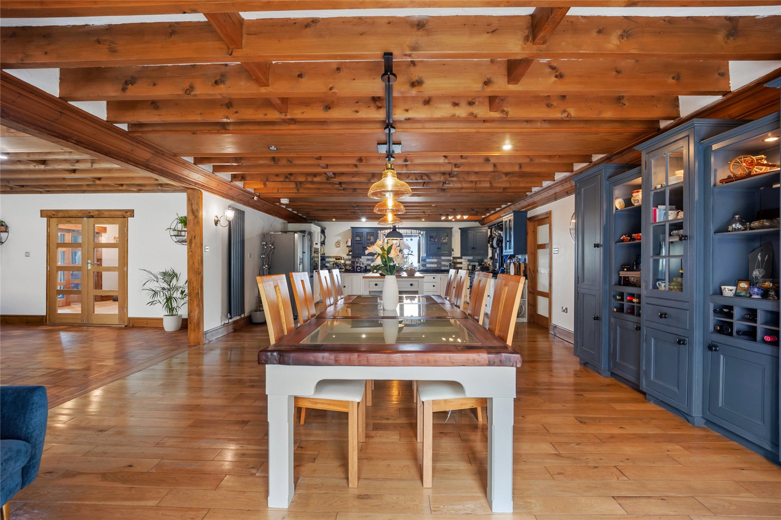 From the hall, double doors lead through to an impressive open plan living, dining and kitchen space - thoughtfully designed for both everyday living and entertaining. The living area offers ample room for relaxed seating and also benefits from an adjoining bedroom or home office, providing excellent flexibility. An open doorway leads through to the dining area, which comfortably accommodates a substantial family table and flows seamlessly into the kitchen beyond.