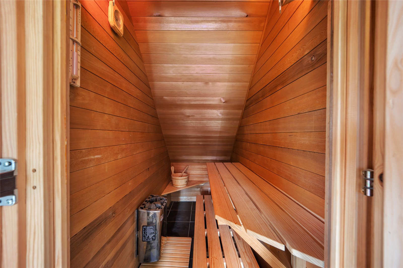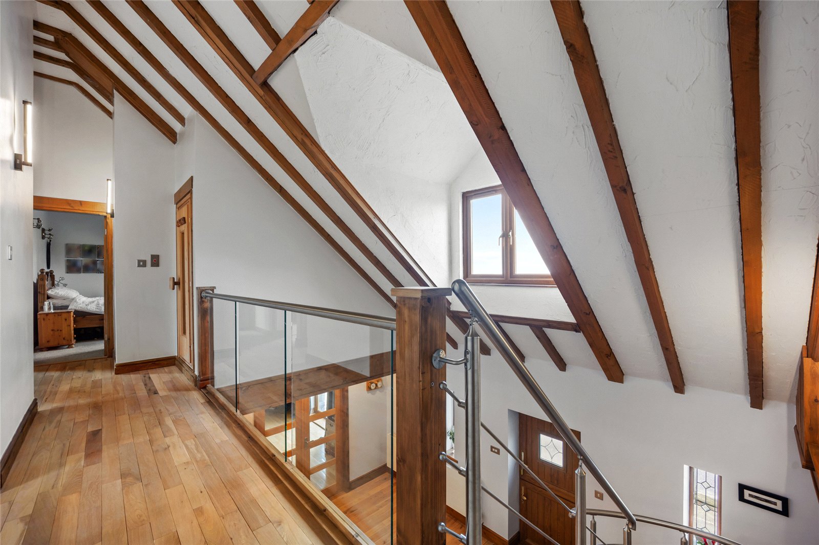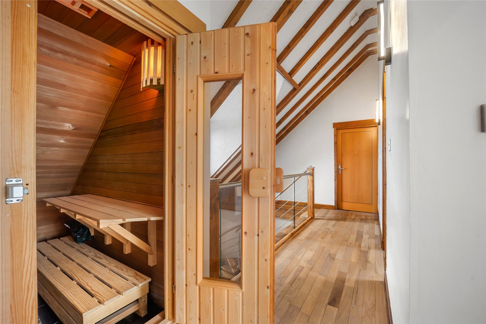 The oak staircase ascends to an impressive galleried first floor landing, creating a sense of space and architectural presence while providing access to all first floor accommodation. This level comprises four generously proportioned bedrooms, each offering comfortable and well balanced accommodation, alongside a beautifully appointed family bathroom, featuring a jacuzzi bath. In addition, a dedicated sauna room introduces an indulgent wellness element.