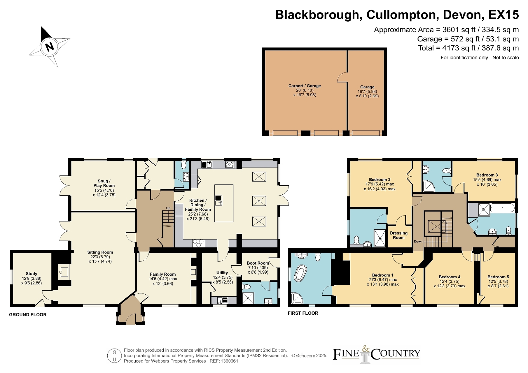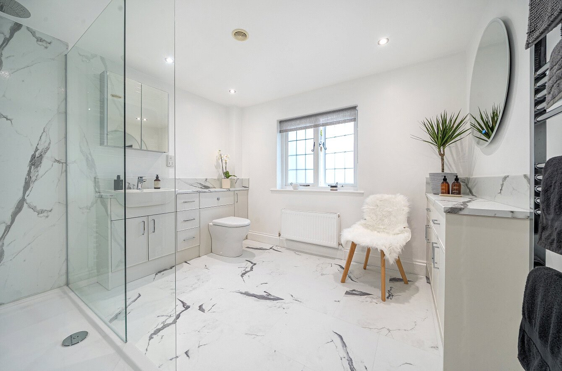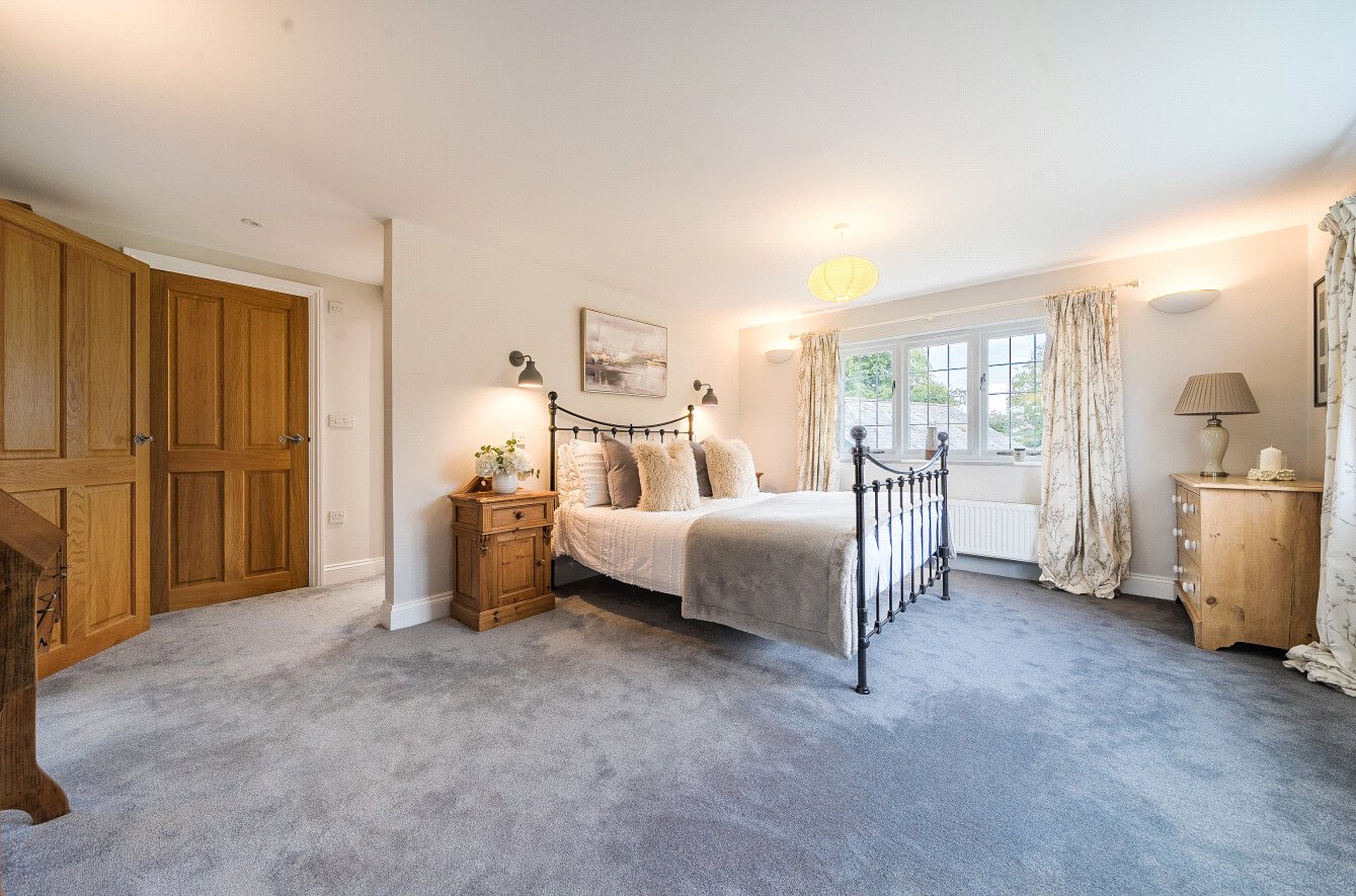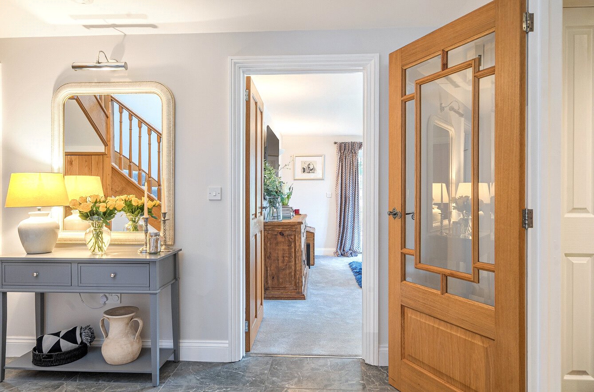 The first floor is arranged around a light-filled landing with an atrium window, leading to five well-proportioned bedrooms. There are two principal suites to choose from: the first overlooks the rear paddocks, complete with a recently refitted en-suite shower room and walk-in dressing cupboard; the second enjoys a front aspect with fitted wardrobes and a generous en-suite featuring a freestanding bath and separate shower. Bedroom three also benefits from its own en-suite, while a large family bathroom serves bedrooms four and five.