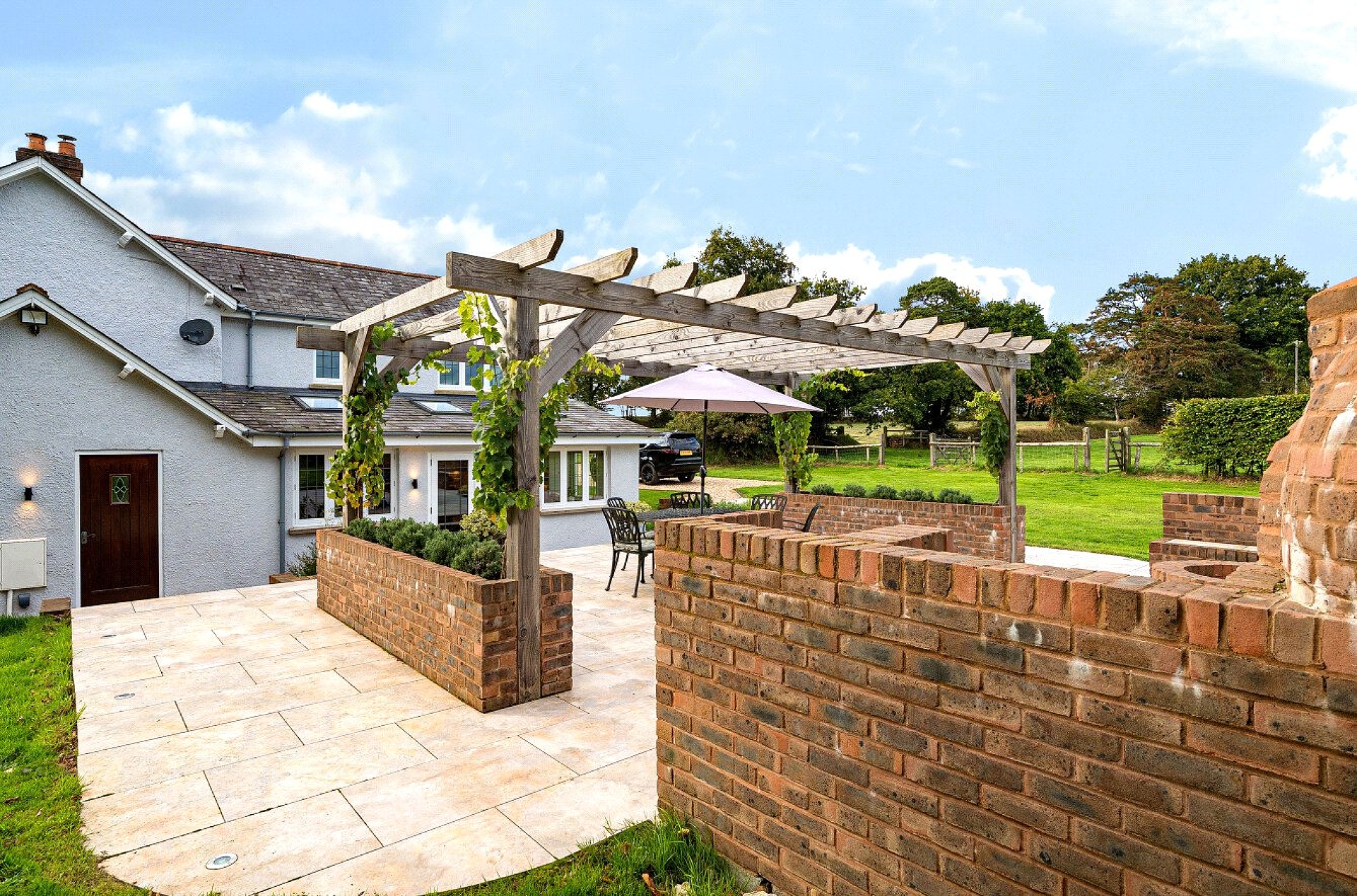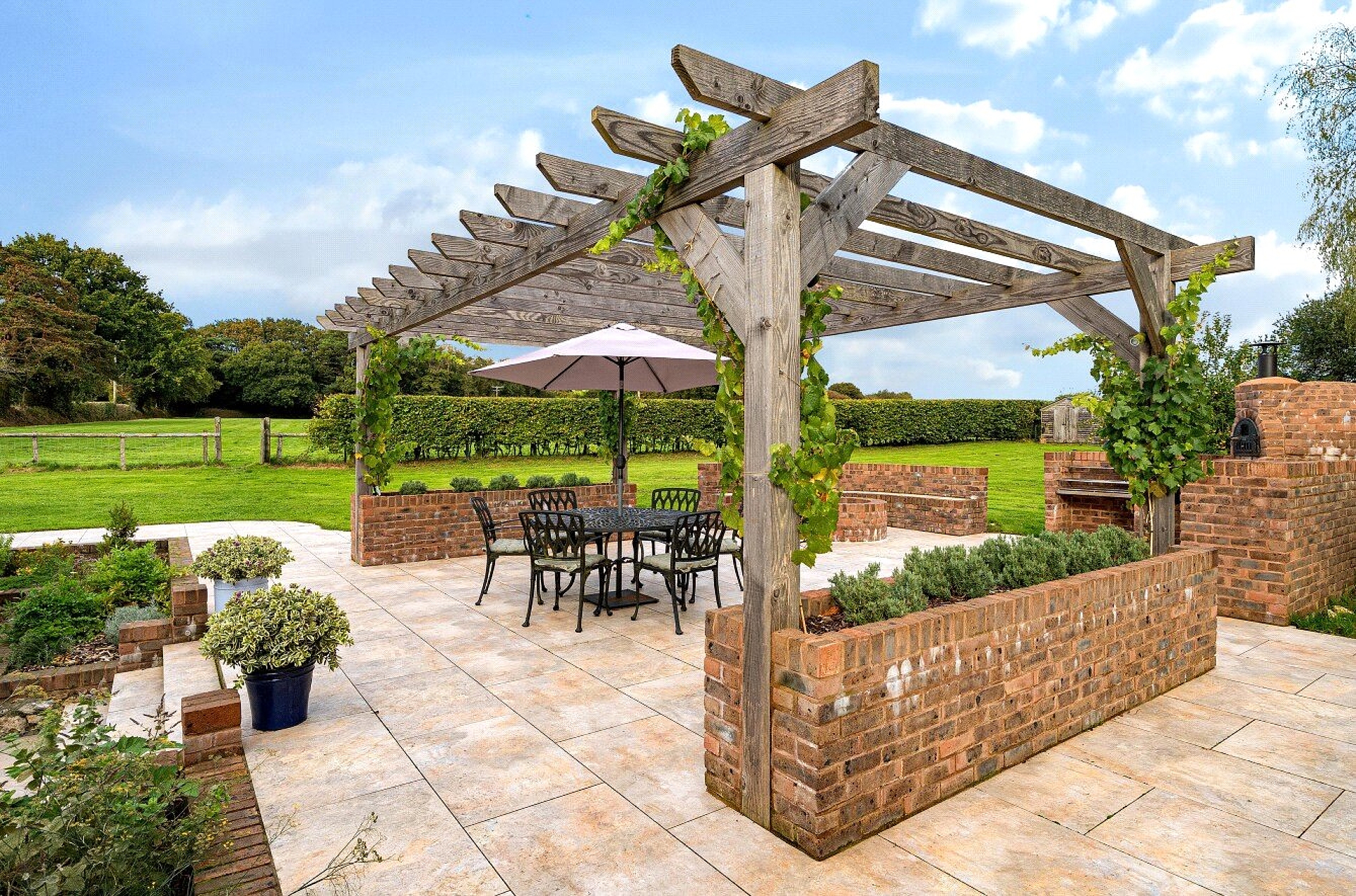 The gardens wrap around the property, with the largest area lying to the side and accessed directly from the kitchen/family room. Here, an impressive outdoor living space has been created, featuring an extensive patio, a large pergola adding character and shade, hand-built seating areas, built-in lighting, an outdoor sink, fire pit, bbq and pizza oven—perfect for entertaining or relaxing.
