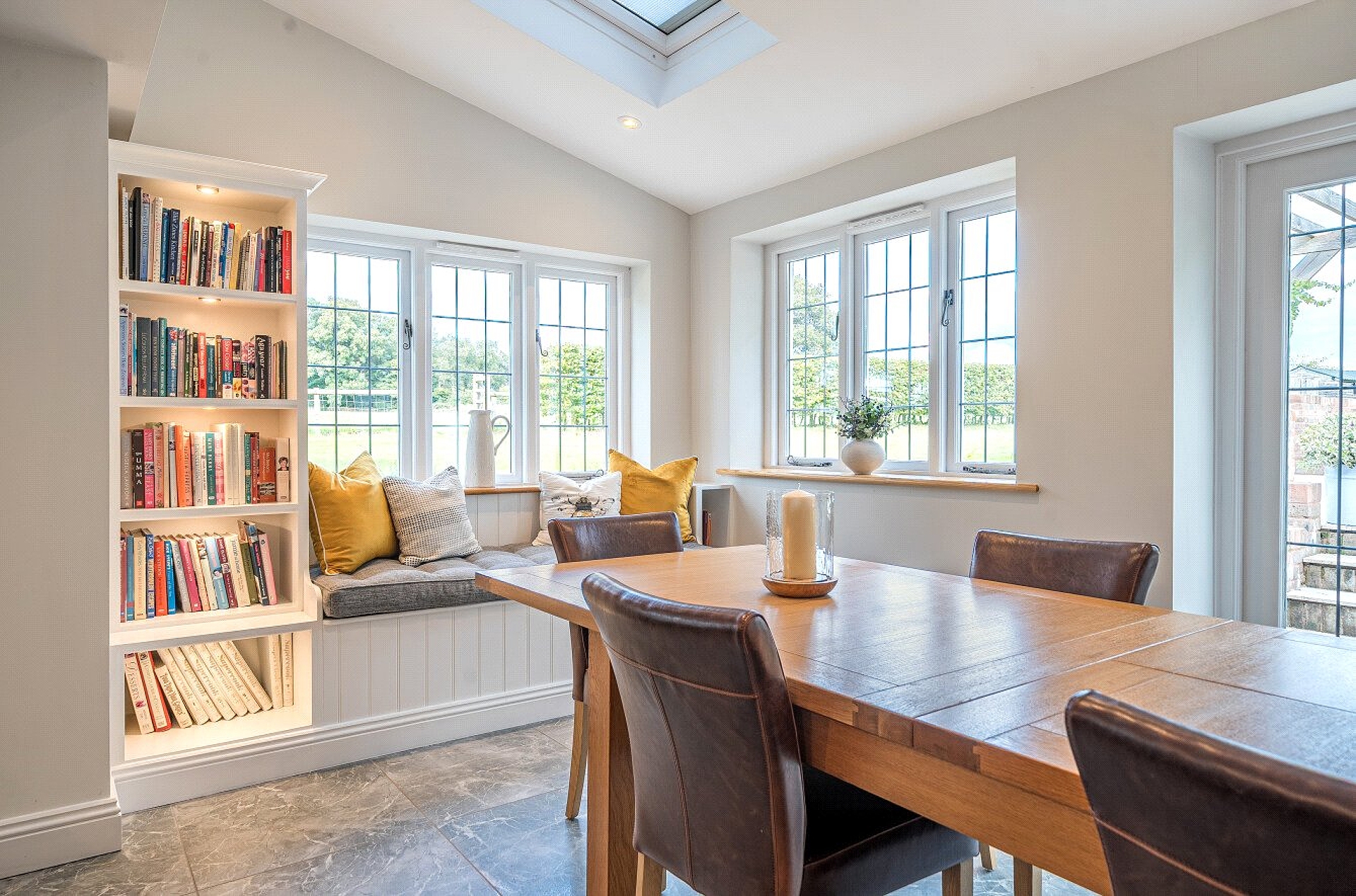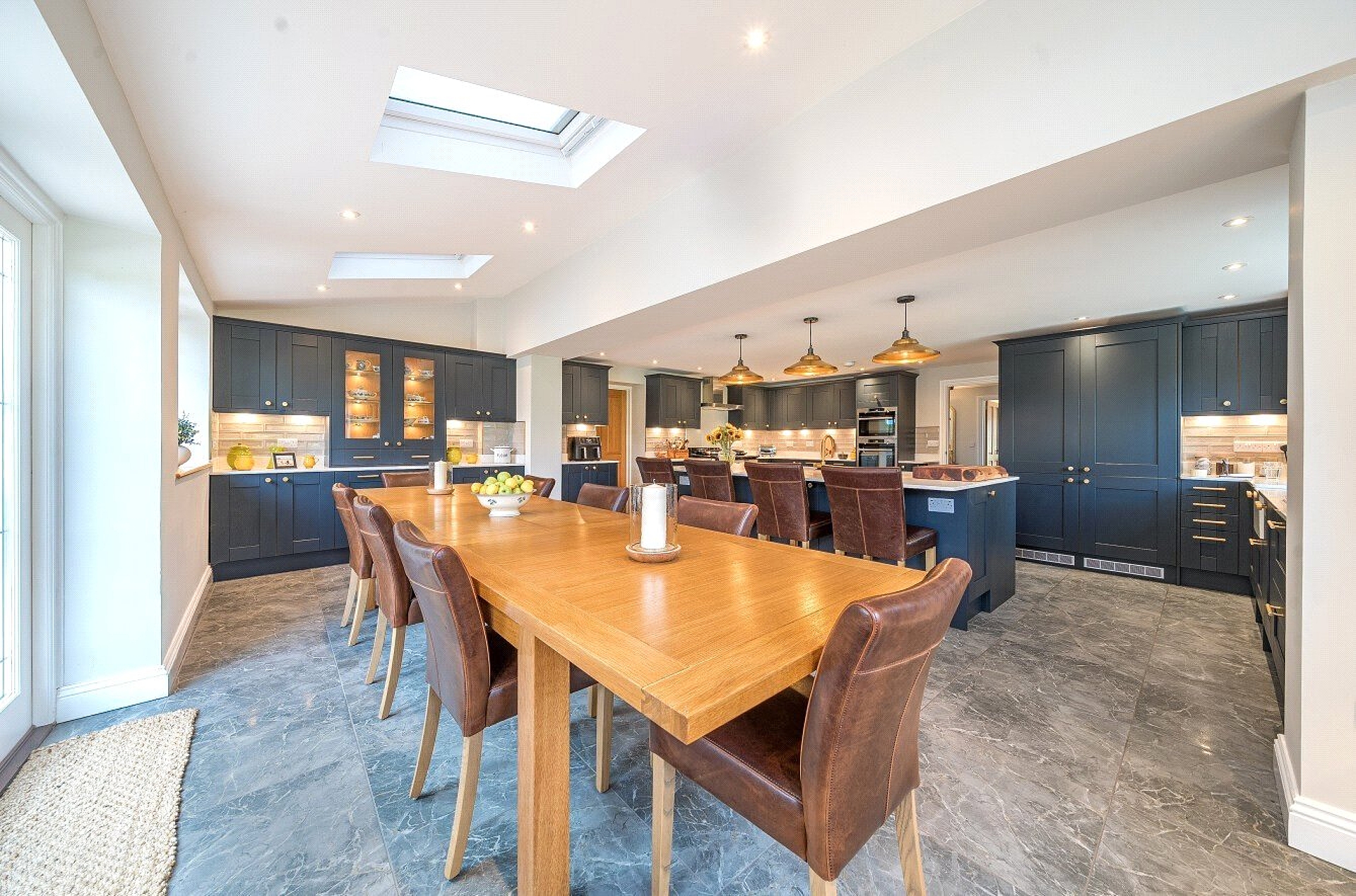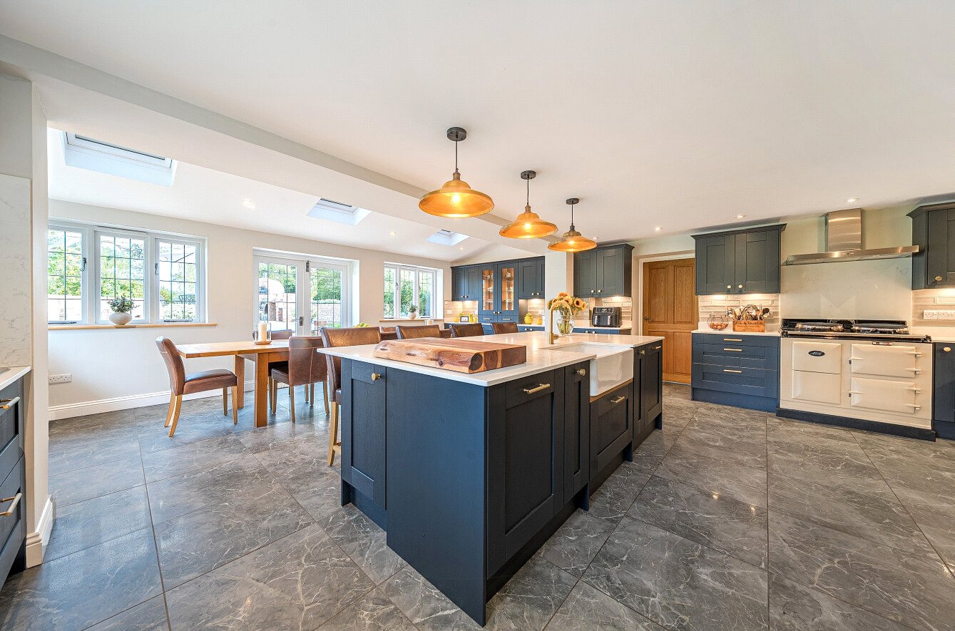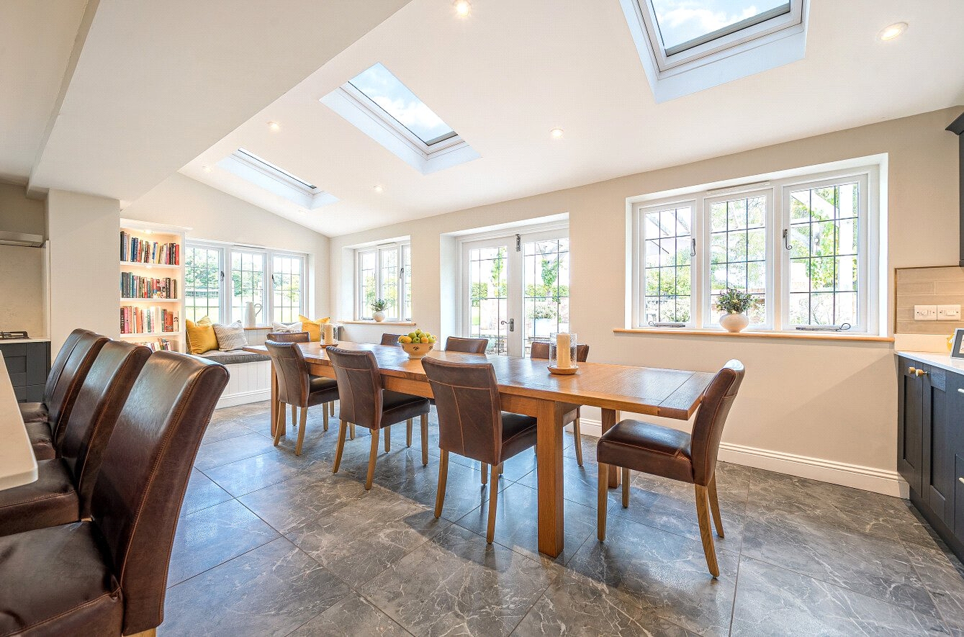 A welcoming family sitting room with a wood burner features French doors opening onto the covered veranda, creating a cosy yet light-filled space to relax. Two further reception rooms provide valuable flexibility, ideal for use as a study, snug, games room, or additional living space to suit changing family needs.