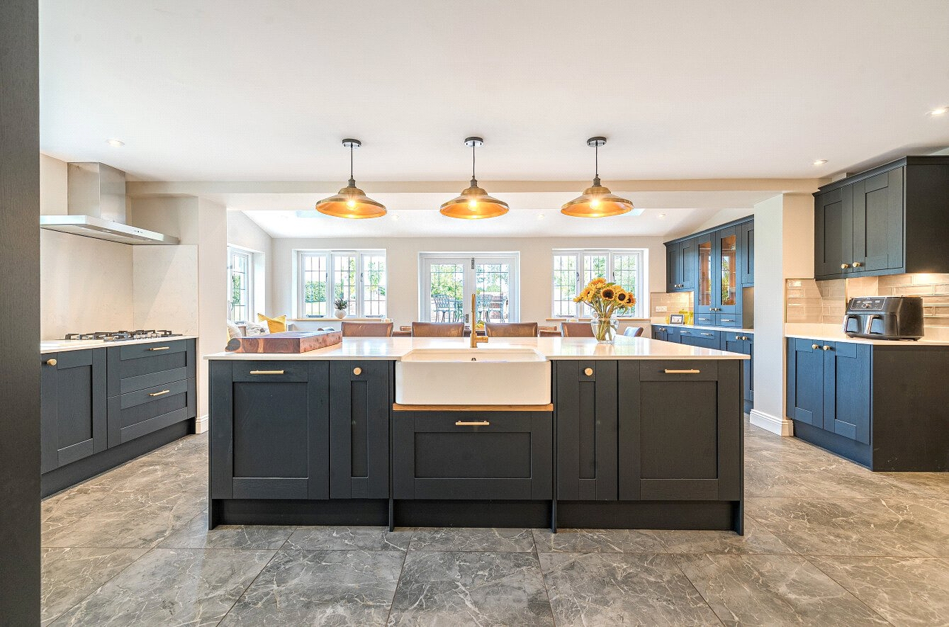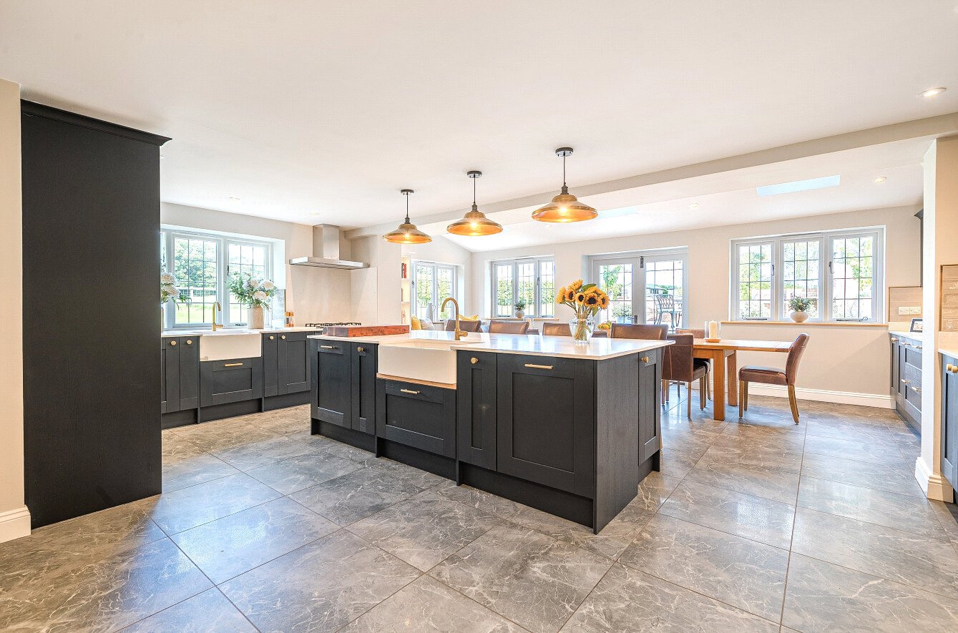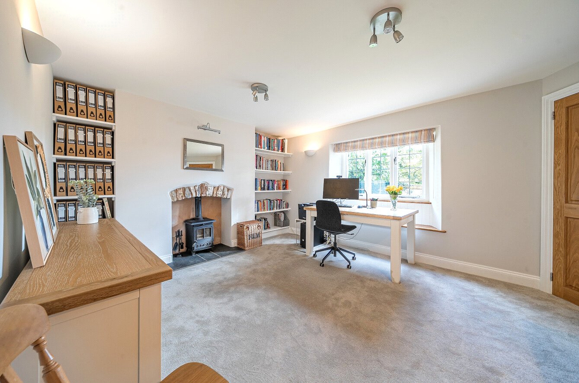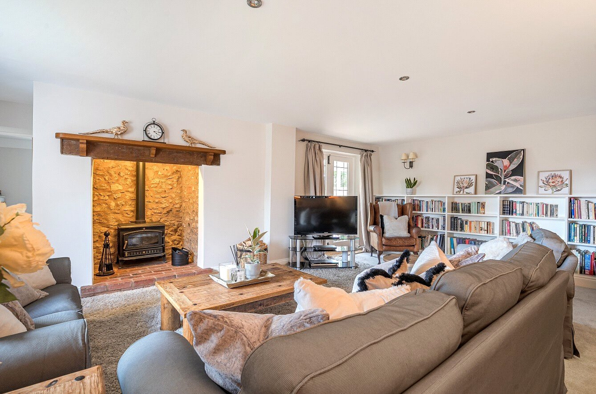 A welcoming family sitting room with a wood burner features French doors opening onto the covered veranda, creating a cosy yet light-filled space to relax. Two further reception rooms provide valuable flexibility, ideal for use as a study, snug, games room, or additional living space to suit changing family needs.