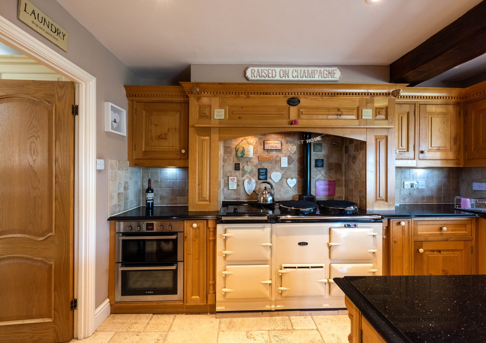 • Fabulous open plan living/dining kitchen with bifold doors creating a seamless connection with the garden and outside seating area. Bespoke fitted kitchen with granite work tops, 4 oven oil fired cream Aga incorporating an electric hob with an attractive over mantle, double ceramic sinks with waste disposal unit, Bosch double oven, microwave and coffee machine together with integral Hotpoint dishwasher, undercounter fridge and CDA wine cooler. Central granite topped central island incorporating a breakfast bar.