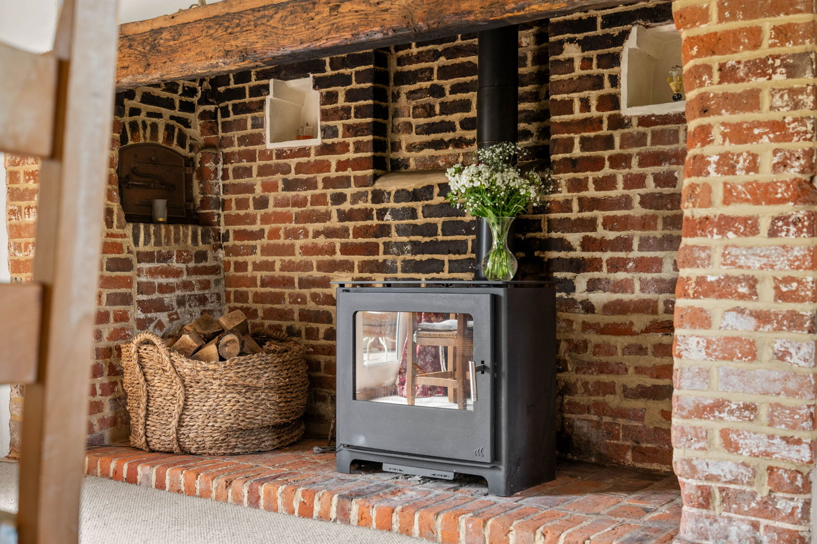 The more frequently used entrance is to the rear of the house, leading through a practical utility and boot room—an invaluable feature when living on 5 acres with horses and ponies. Just off this entrance lies the traditional country kitchen. Exposed wooden beams add rustic charm and create a seamless connection between the kitchen and the dining room. The first floor can also be accessed from the kitchen via a second staircase. The dining room is a large space with inglenook fireplace and wood burning stove. The perfect setting to entertain and enjoy a meal, French doors flow straight out to the beautiful gardens and patio where you can enjoy a glass of wine after and take in the views. On the first floor, there are three good sized bedrooms with exposed beams and fitted wardrobes, two bathrooms and two further bedrooms with one currently being used as an office.Â