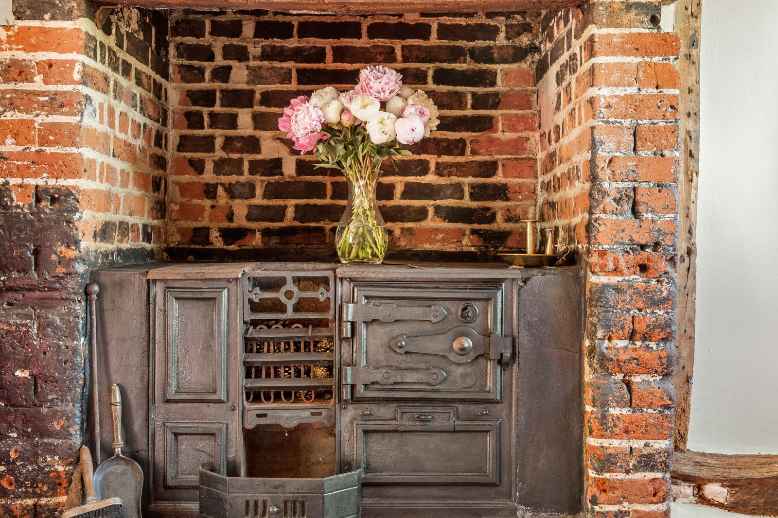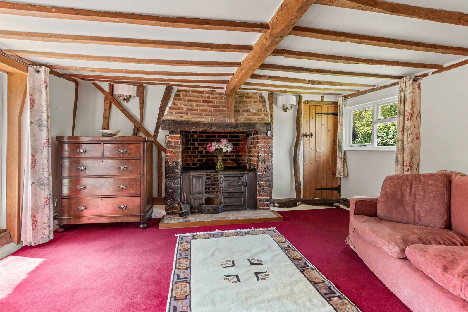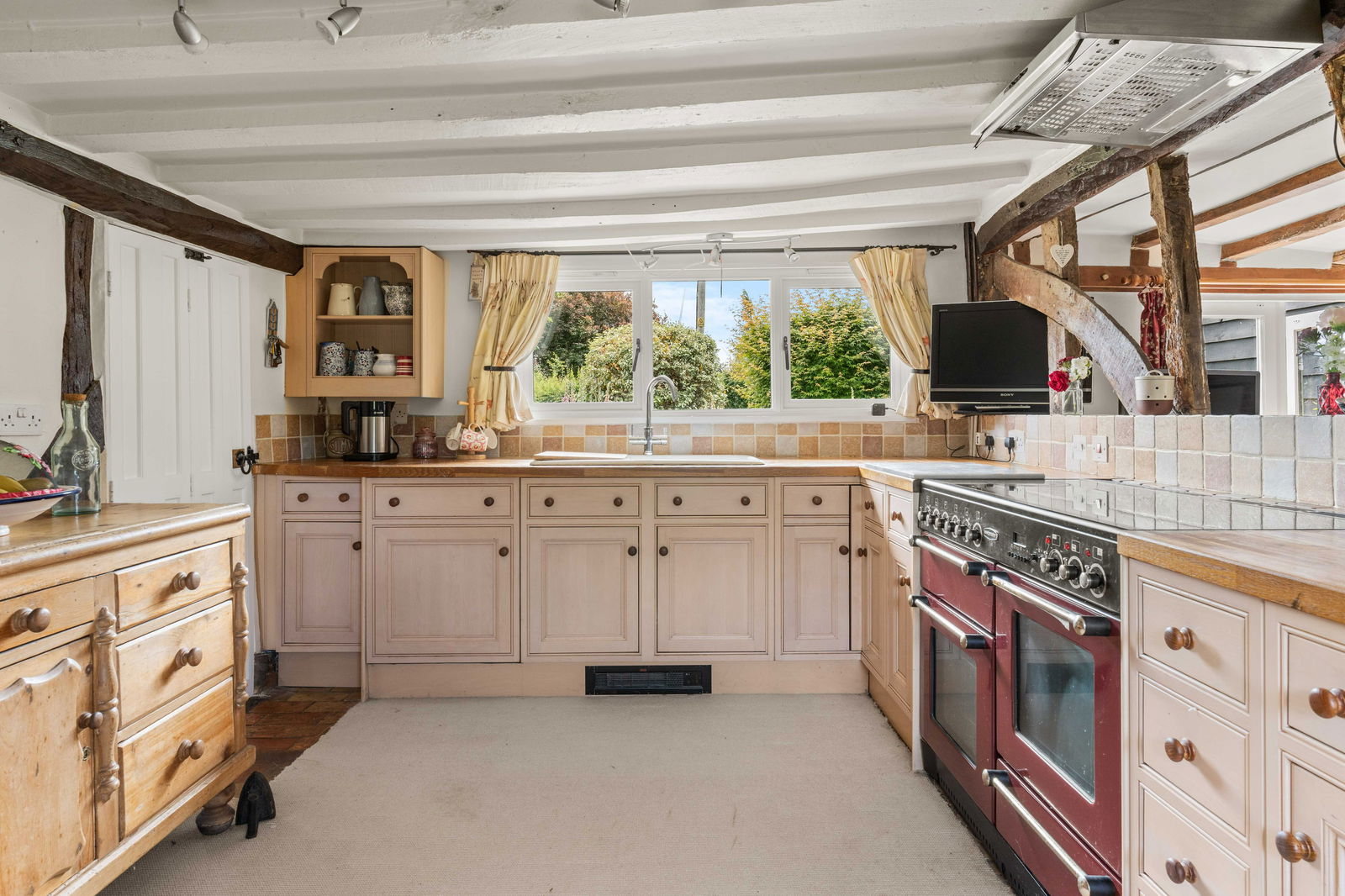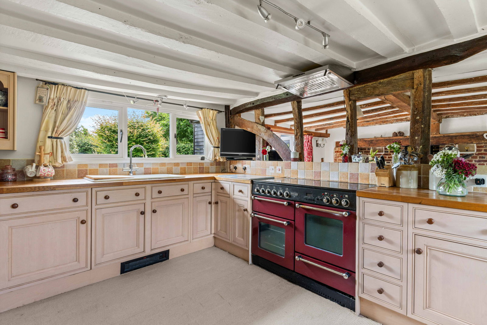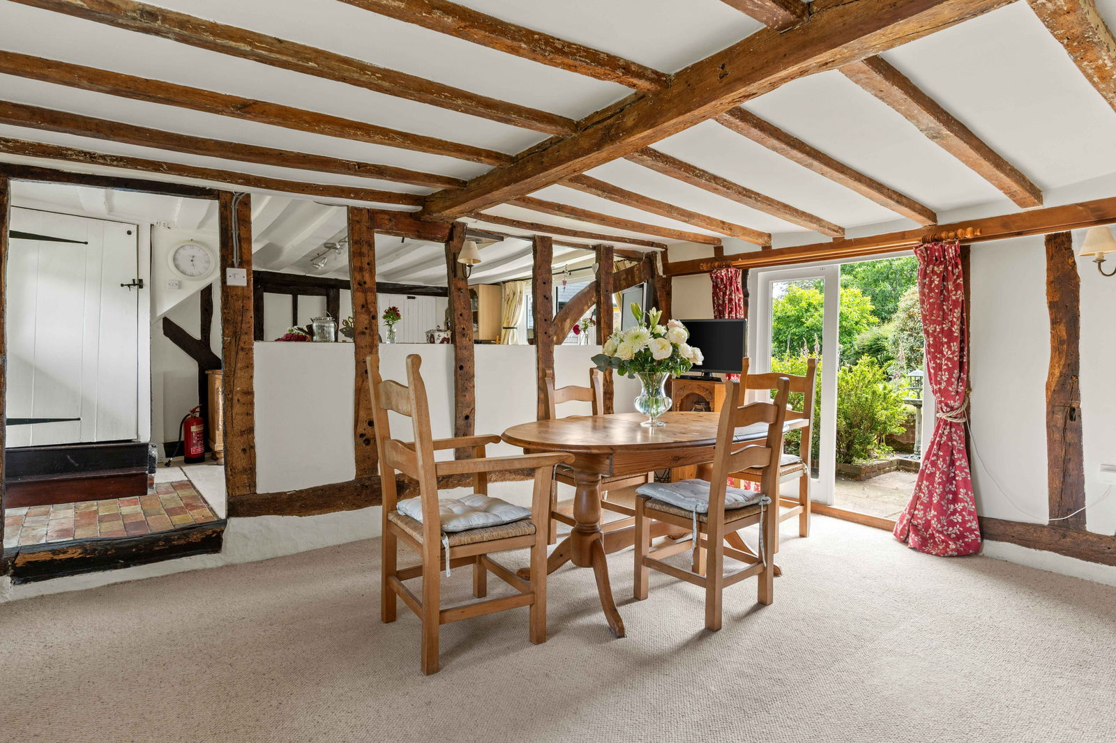Walking through the pretty entrance porch of White Rose Cottage and the solid wooden front door leads you into the main lobby and hallway. There are plenty of storage cupboards, exposed beams and original features together with one of the staircases up to the first floor. To the right, a cosy living room with brick-built feature fireplace and cast-iron stove which may have been the original kitchen and the heart of this home with French doors leading out to the garden. There is a door that leads behind the living room that offers a large storage space, a great place for a wine room. Down the main corridor, you will find a cloakroom, study and sitting room. The sitting room is a light and relaxing space where you can sit and enjoy the garden with separate French doors stepping out to a private patio area and lawn.