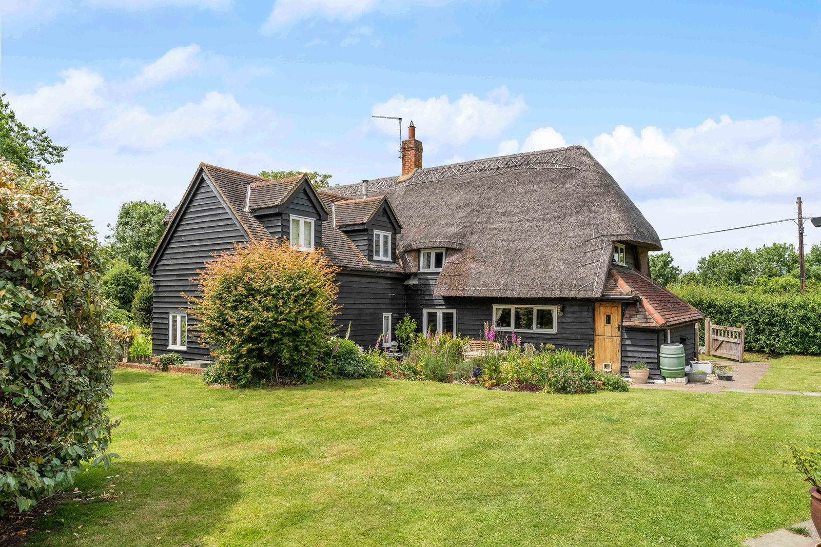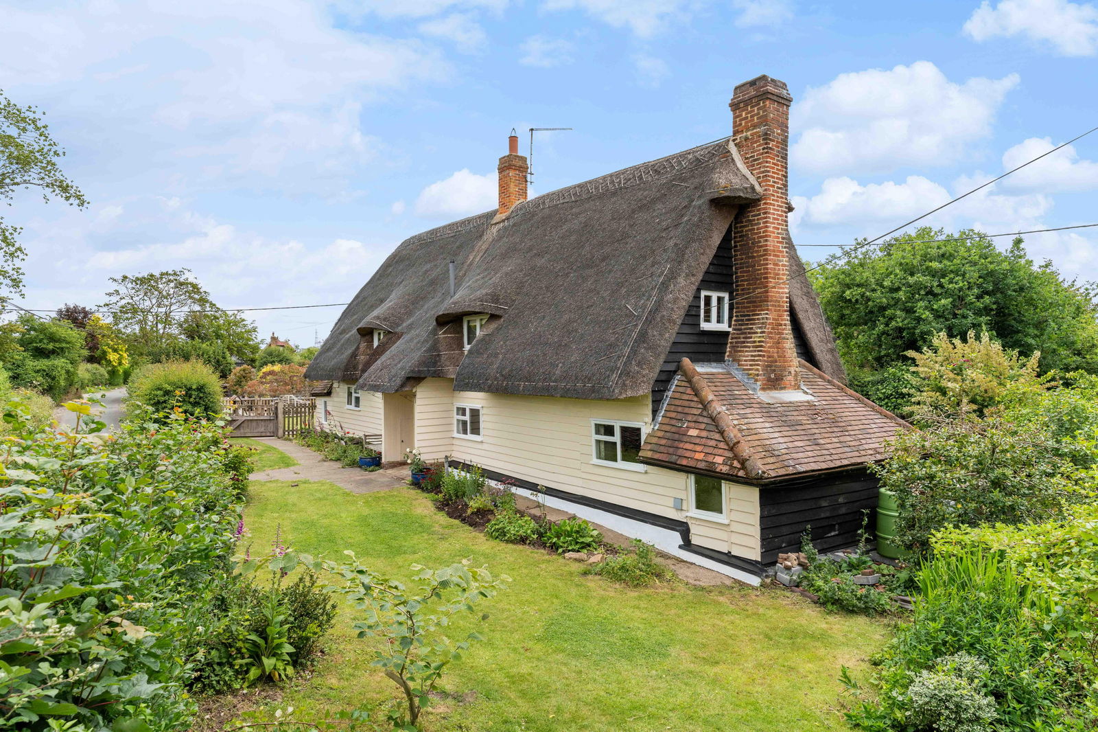 A picturesque five-bedroom, detached grade ll listed thatched cottage nestled away in the beautiful Lower East End, Furneux Pelham, Hertfordshire location. This idyllic home offers approximately 2174 sq. ft of accommodation in the main home with three receptions, five bedrooms, two bathrooms and an office. The property also offers a self-contained detached annexe of approximately 677 sq. ft and a garden store and utility room of 253 sq. ft. There are various outbuildings and, for equestrian enthusiasts, four stables, feed and tack rooms and a large storeroom / haybarn with four paddocks set within approximately 5 acres. This is a wonderful multigenerational home and offers everything a family could need with a total floor area of 4067 sq. ft. The property has oil fired central heating, private septic tank, EPC exempt as listed and council tax band G.